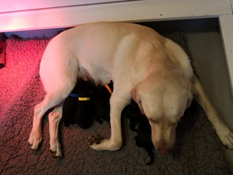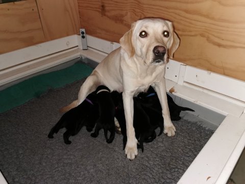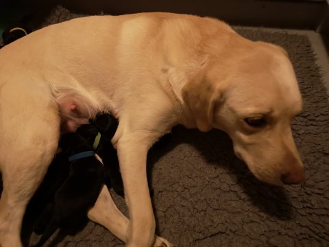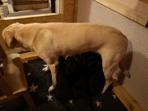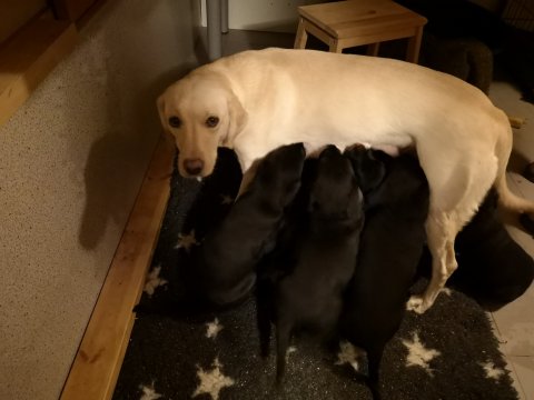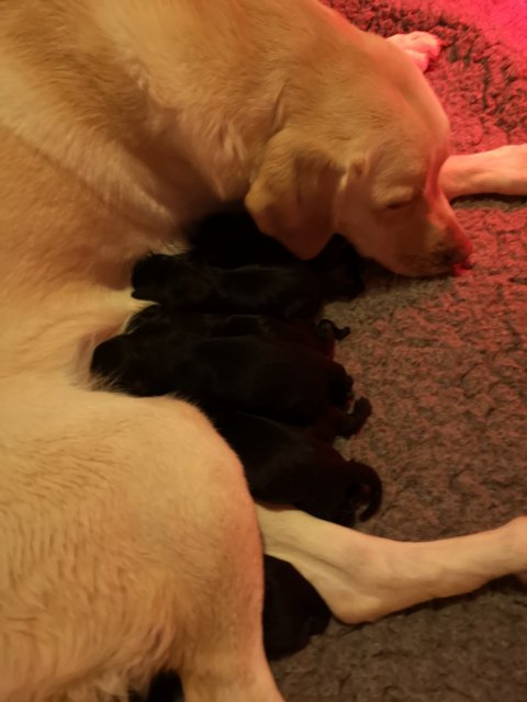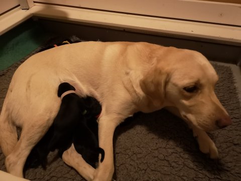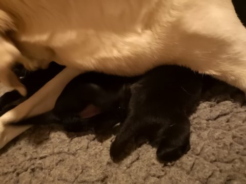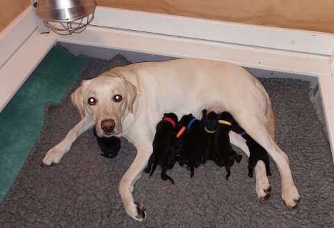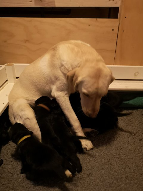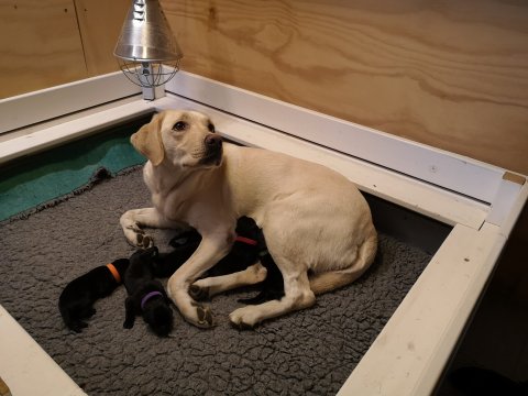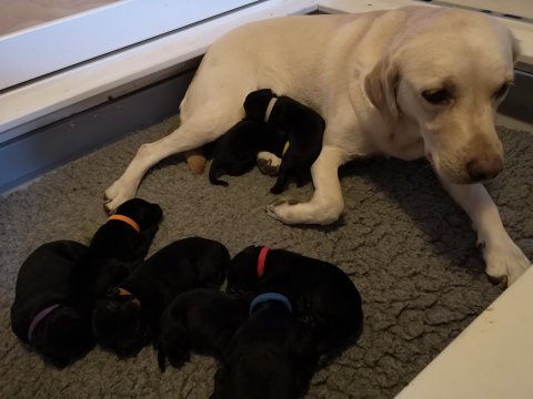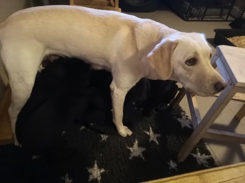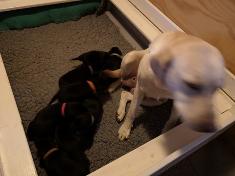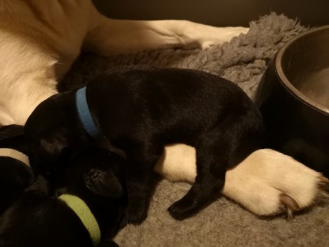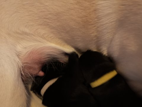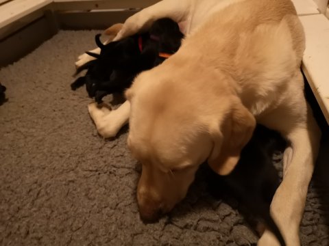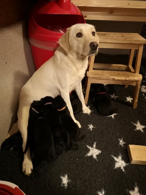Mila er rigtig god mor der pudser og nusser omkringe hendes hvalpe og hun har også overskud til at kommer op i stuen og være lidt sammen med resten familie.