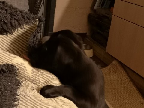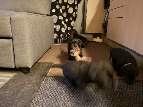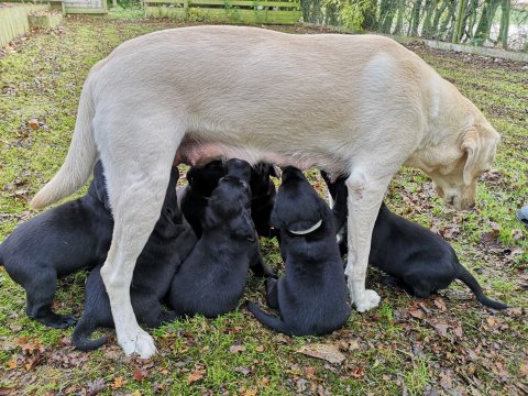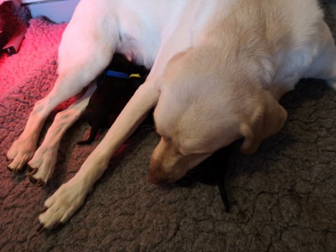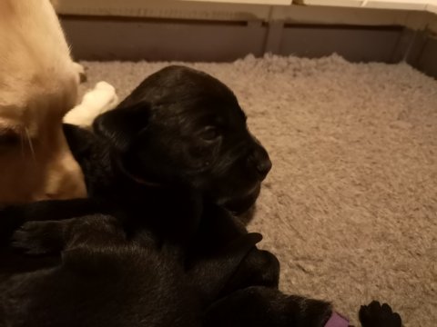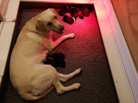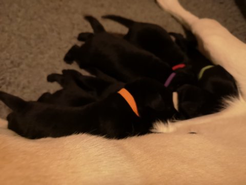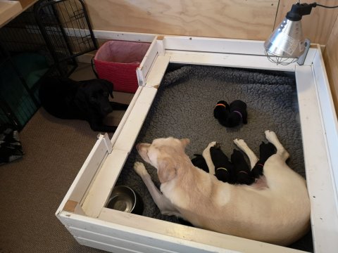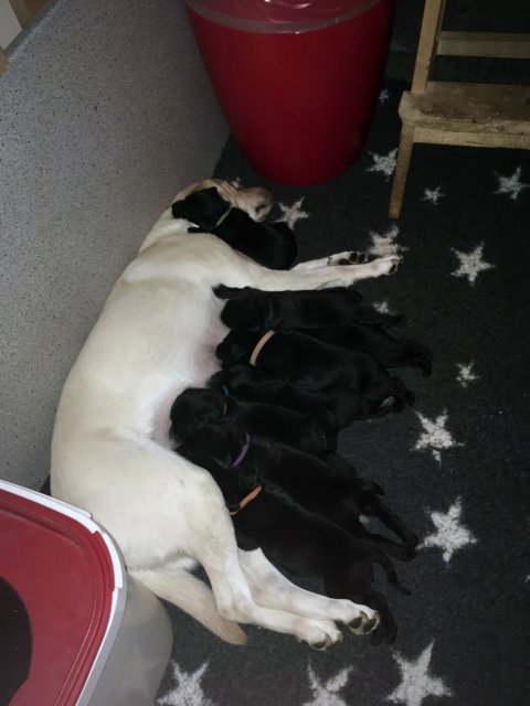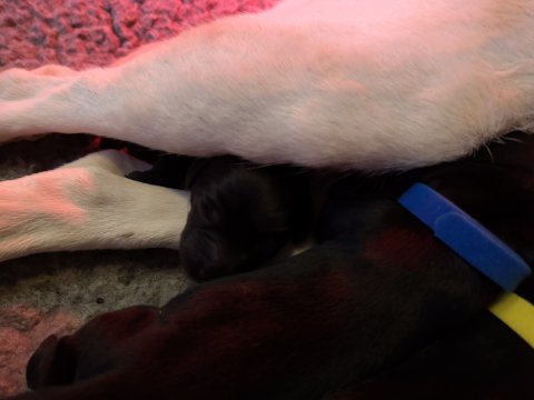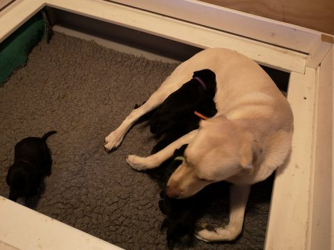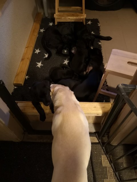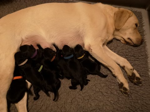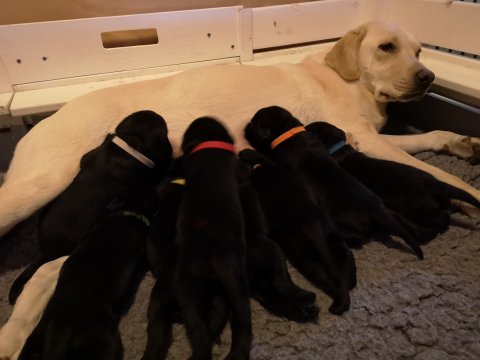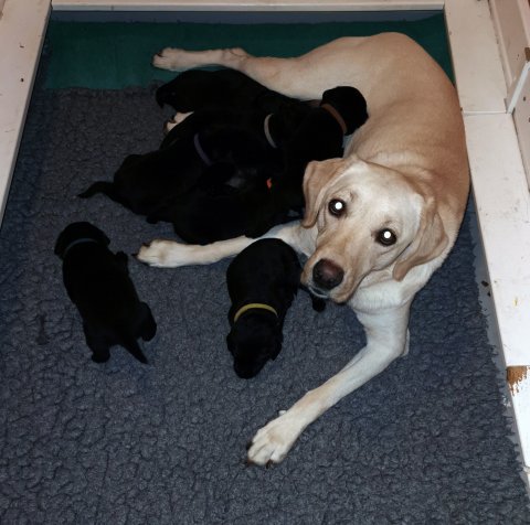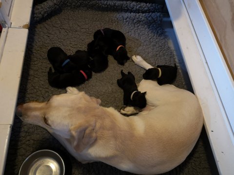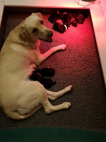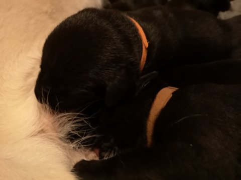Mila er rigtig god mor der pudser og nusser omkringe hendes hvalpe og hun har også overskud til at kommer op i stuen og være lidt sammen med resten familie.