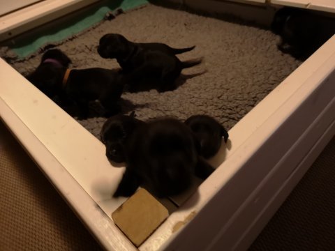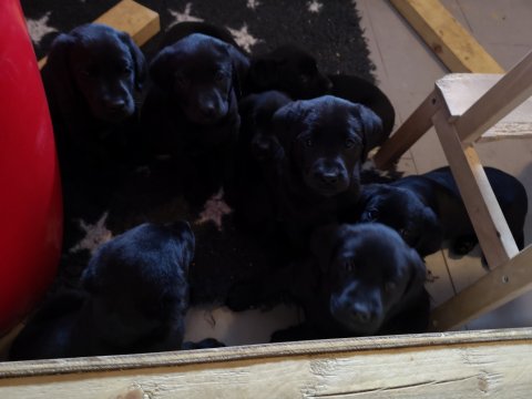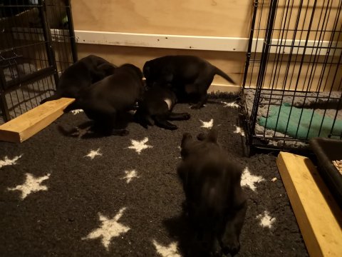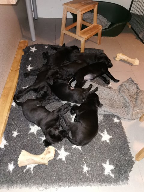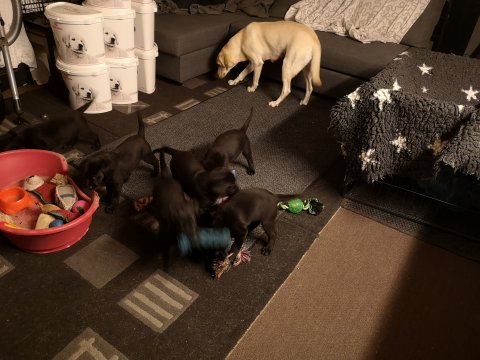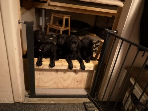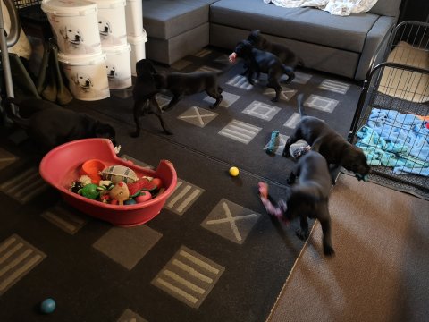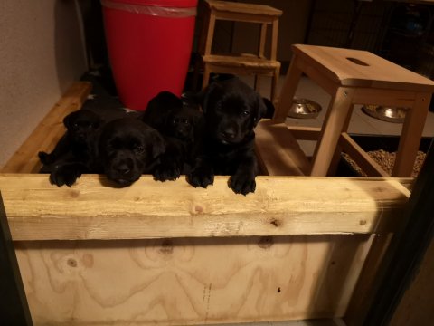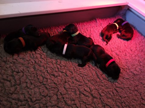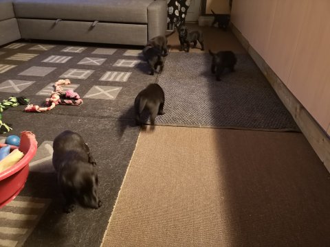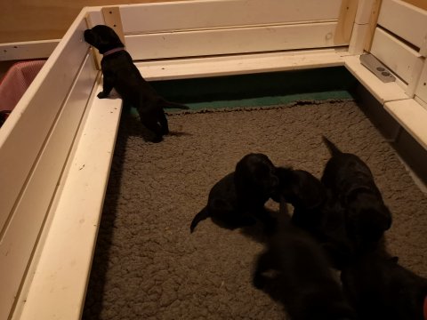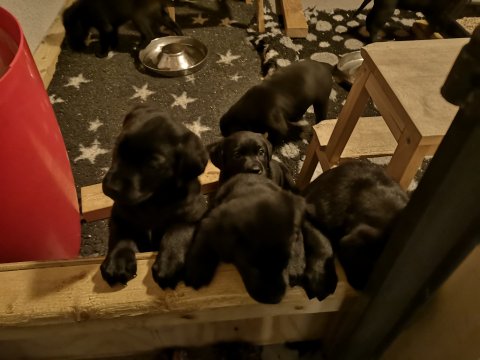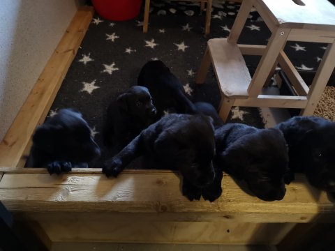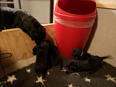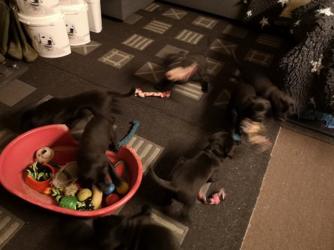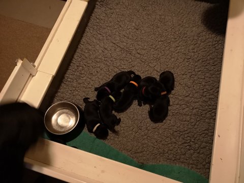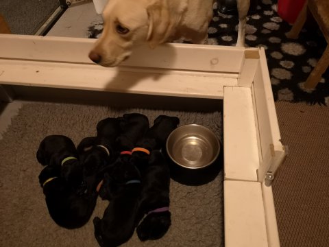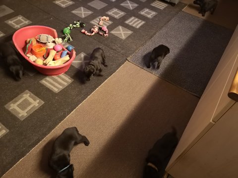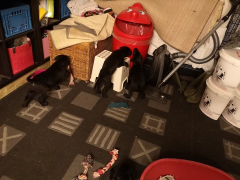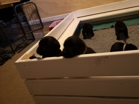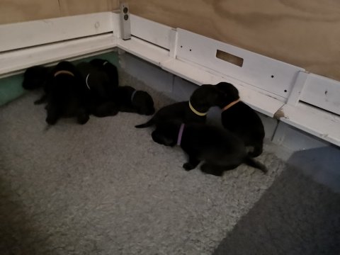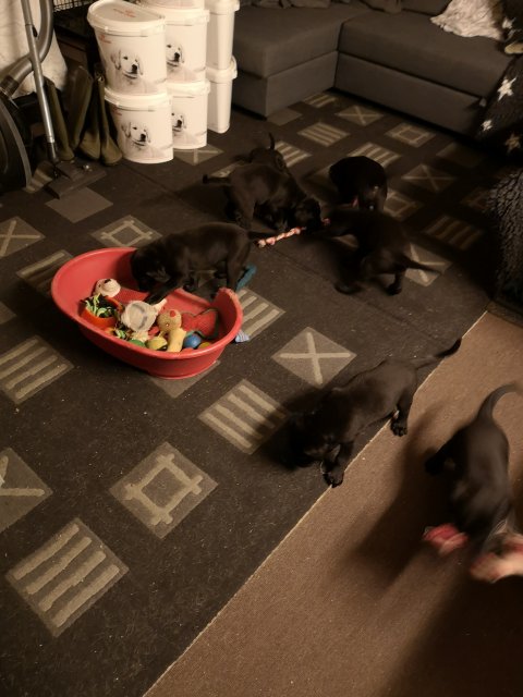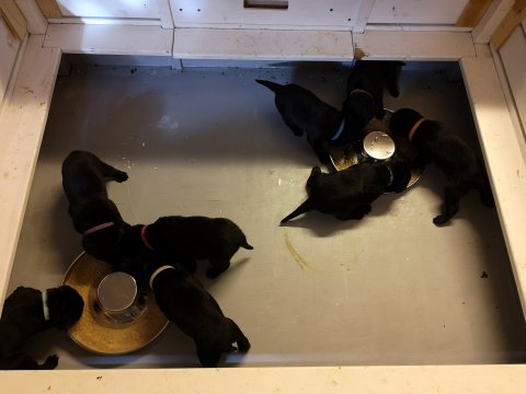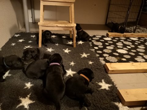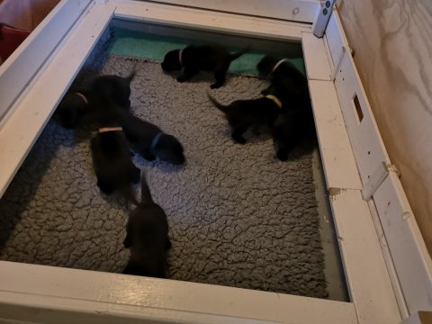 Det er den sidste uge i hvalpekassen og der har rigtig været gang i rummet der blevet tumlet, leget og hygget samt trænet i at blive renlig. Vi har set flere af hvalpene løbe på "hvalpetoilet" når de ude og lege i hvalpebørnehaven også kommer de tilbage for at lege videre med de andre. Når hvalpene ikke har været udenfor deres hvalperum har de hygget sig sammen og hver for sig. De er næsten altid klar ved låg til at blive snakket med når vi kommer ned til rummet. Flokken er klar til at flytte hjemmefra og komme ud til deres nye familier, så de få masse nye oplevelser med deres nye familier