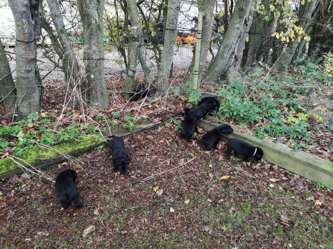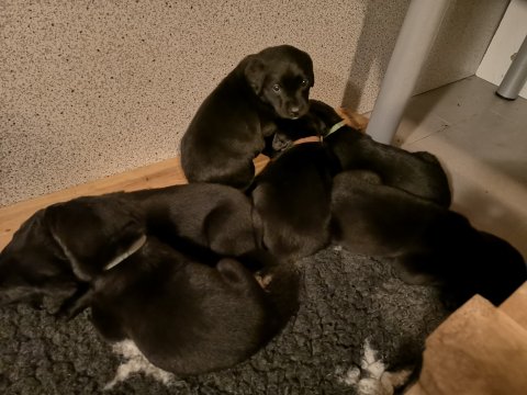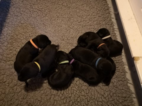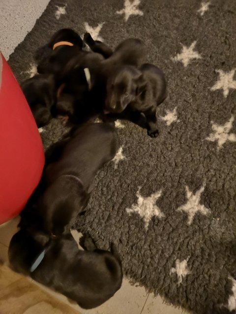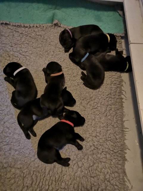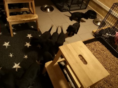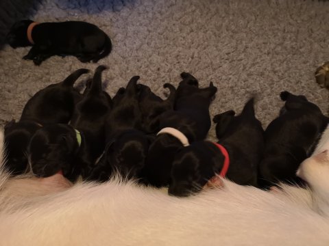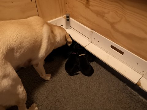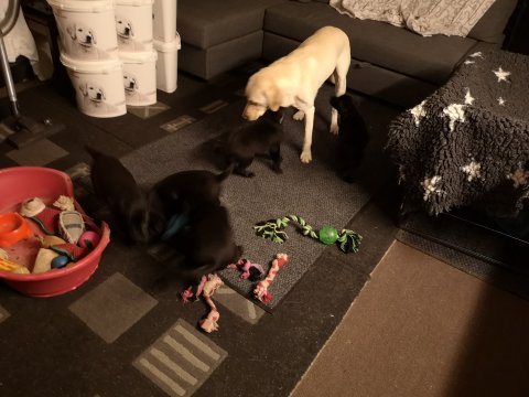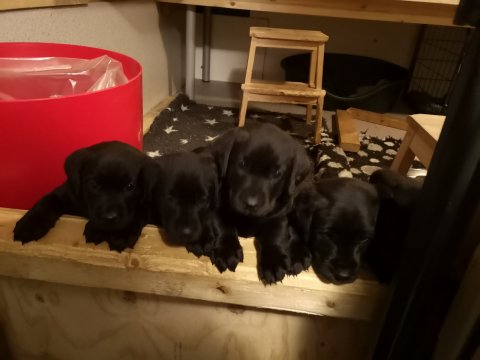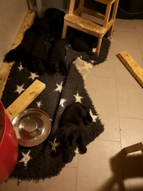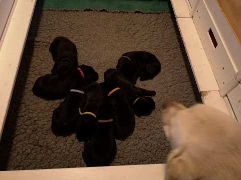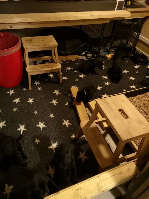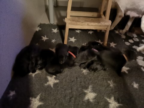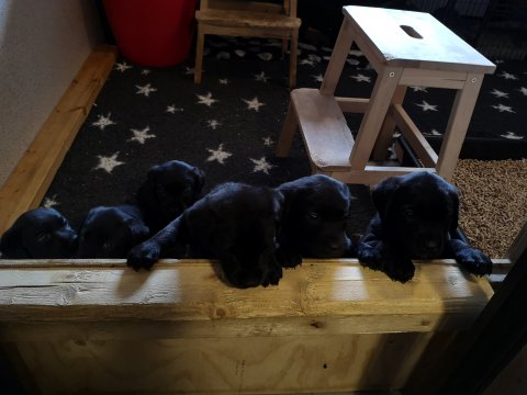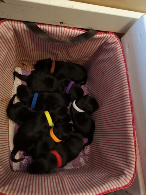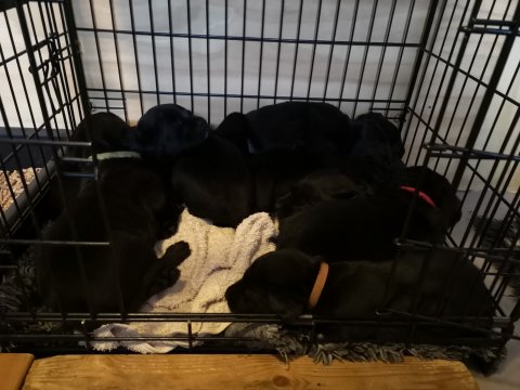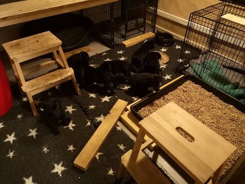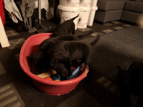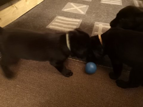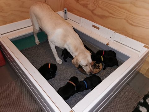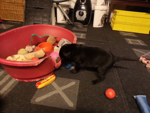 Det er den sidste uge i hvalpekassen og der har rigtig været gang i rummet der blevet tumlet, leget og hygget samt trænet i at blive renlig. Vi har set flere af hvalpene løbe på "hvalpetoilet" når de ude og lege i hvalpebørnehaven også kommer de tilbage for at lege videre med de andre. Når hvalpene ikke har været udenfor deres hvalperum har de hygget sig sammen og hver for sig. De er næsten altid klar ved låg til at blive snakket med når vi kommer ned til rummet. Flokken er klar til at flytte hjemmefra og komme ud til deres nye familier, så de få masse nye oplevelser med deres nye familier
