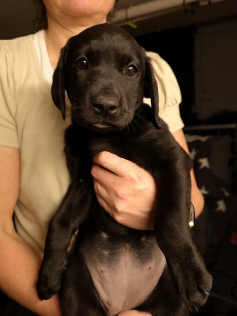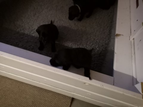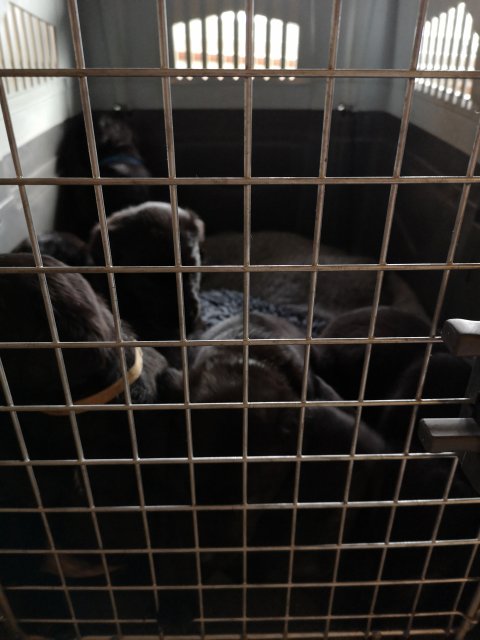 Hvalpene er blevet mere aktive og nysgerrige. Når vi kommer forbi rummet kigger de op og kommer til lågen hvis vi kalder på dem. Når de andre hunde kommer ned, er de hurtig til at kommer hen til lågen.