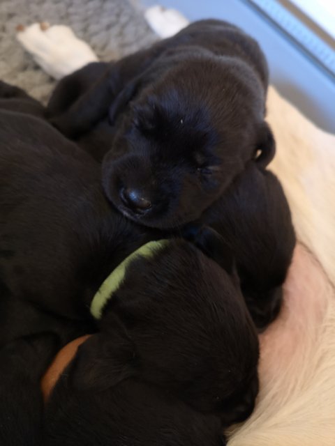 Hvalpene er nu oppe på 3 gange hvalpemad om dagen, så nu er de så mætte at de kan ligge og sove ved Mila uden at hænge i hendes patter.