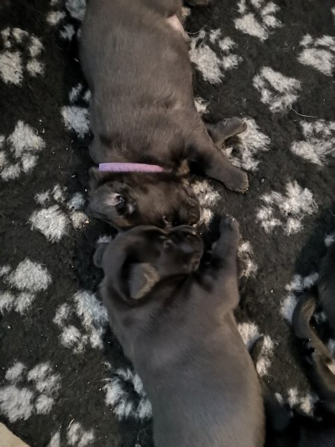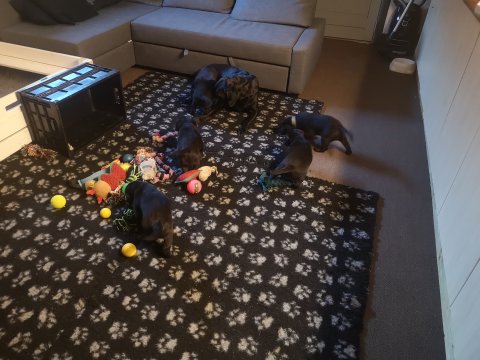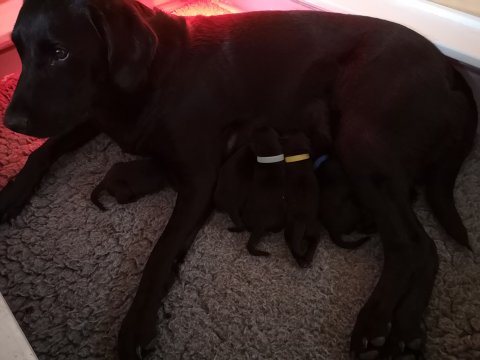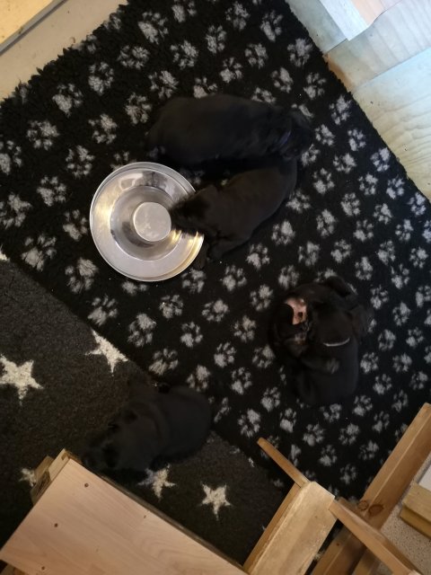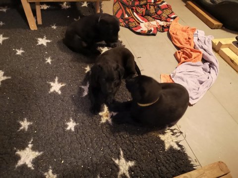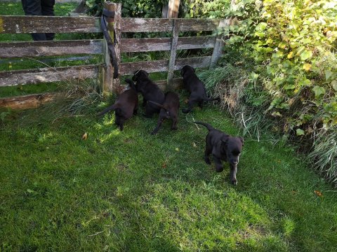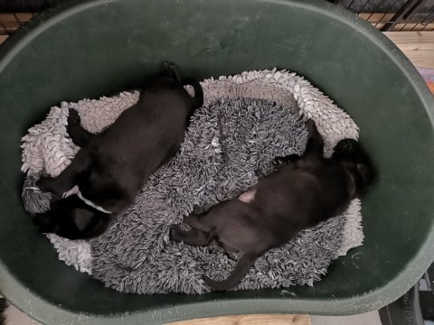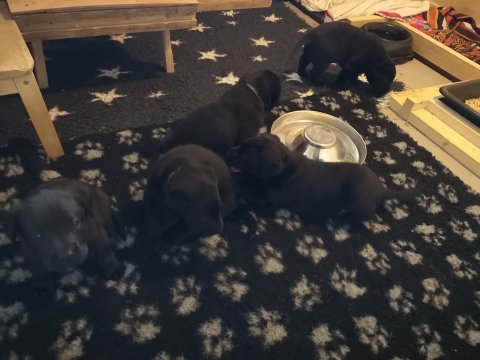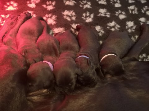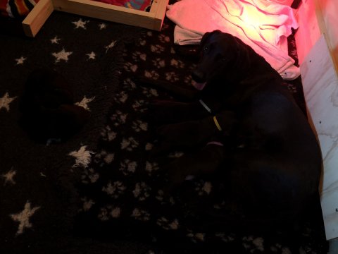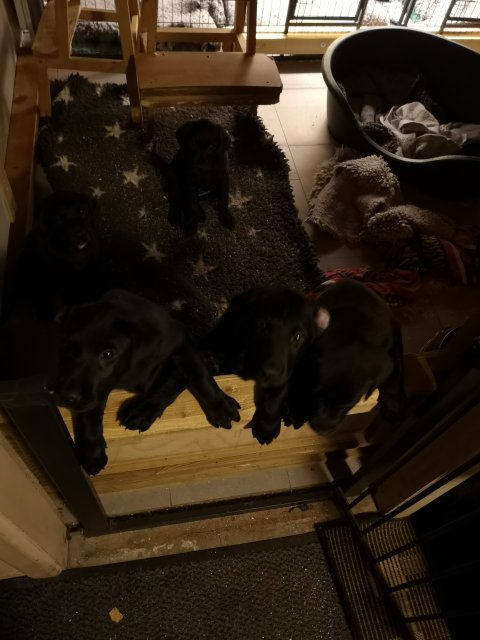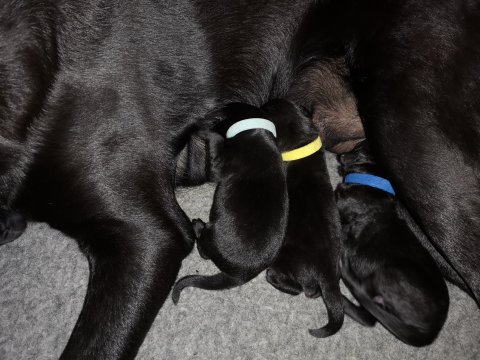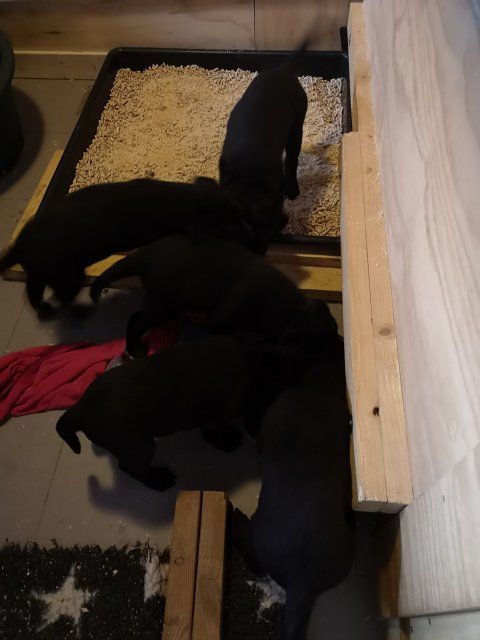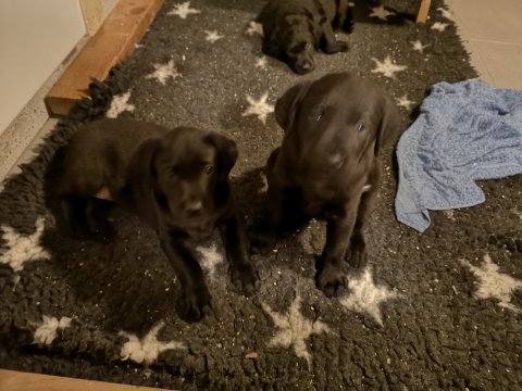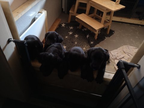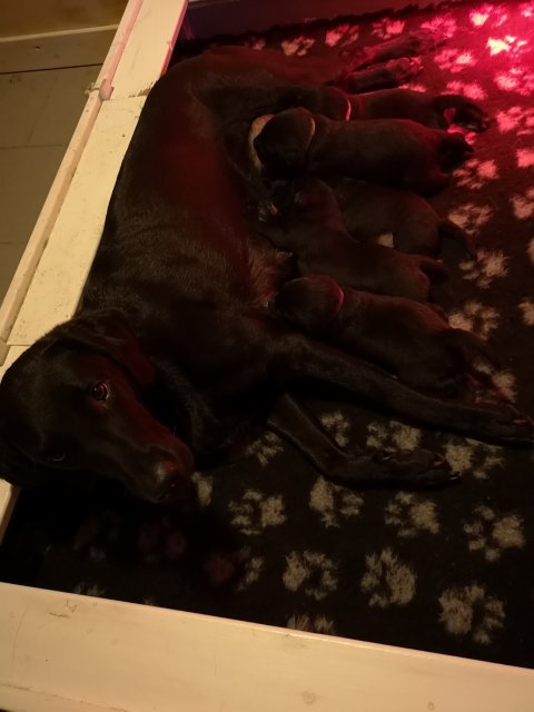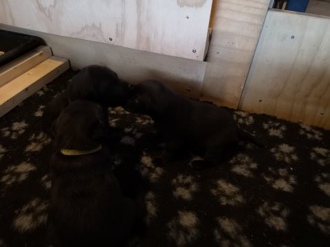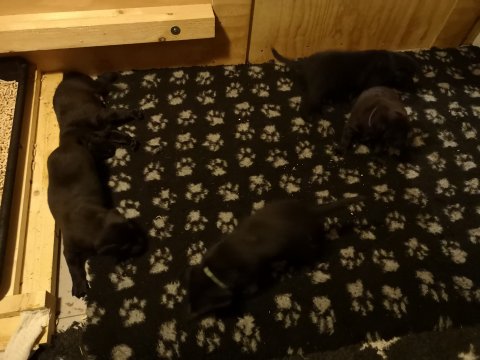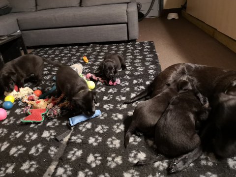 Amy har født 5 store sorte hvalpe, 1 tæve og 4 hanner.