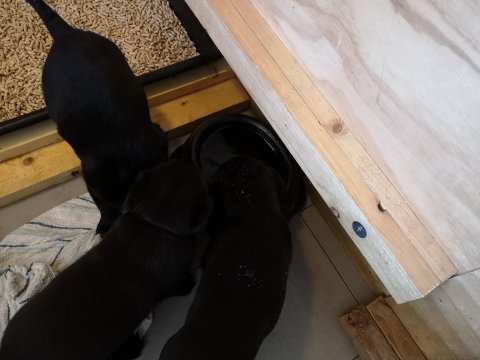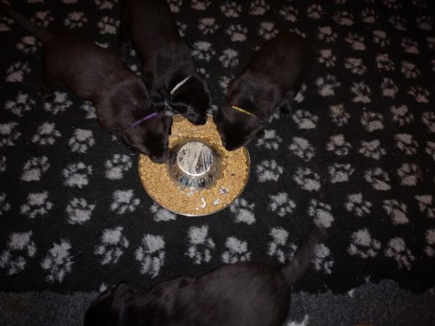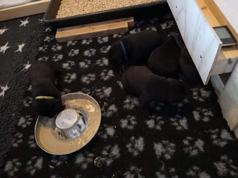 De har også været uden for rummet og i "hvalpebørnehave". De synes det var lidt spænde med nye omgivelser. De er nysgeri og vil undersøge nye ting især vores snørrebånd. Hvalpene får nu fast føde,opblødt hvalpefoder, og de er klar over at når der bliver fløjet kommer mad, så kommer de hurtíg hen til madskålen og bagefter er får mælk fra Amy´s mælkebar. Hvalpene har fået små fine hvalpetænder, så det er ikke altid rart at være Amy de bider sig fast, men hun nyder at ligge sammen med hendes hvalpe.