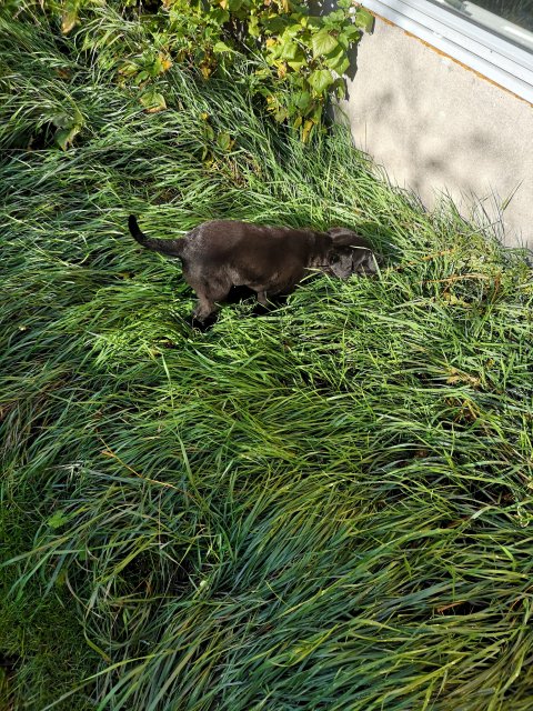 Amy er begyndt at komme med ud i haven med de andre hunde.