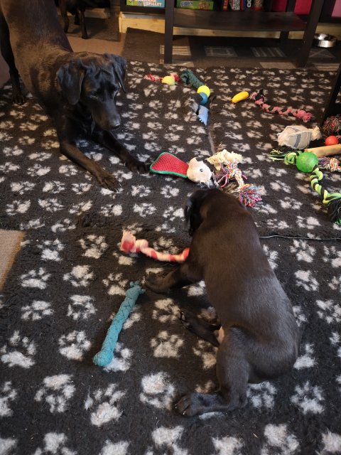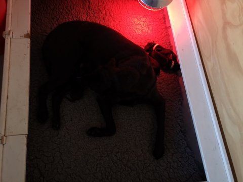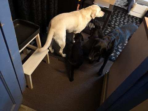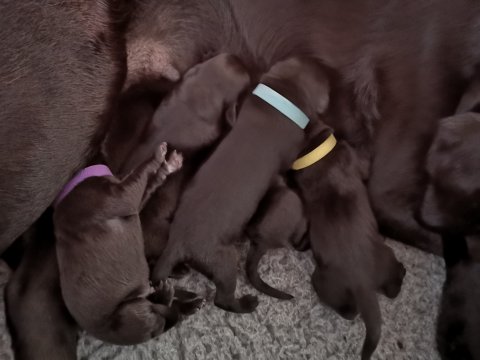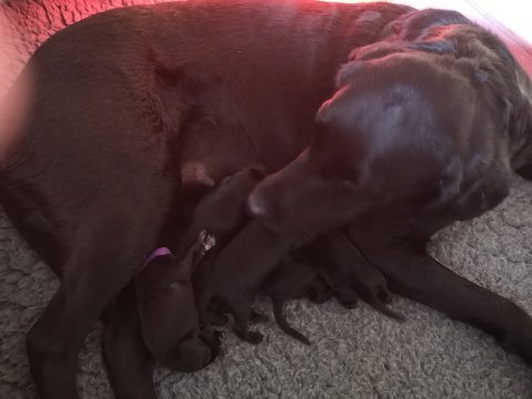 Hvalpene får masse af mælk, så Amy kan godt forlade dem og være lidt sammen med resten af familie, men der går ikke i ret lang tid så hun ligger hun ved dem igen :-)