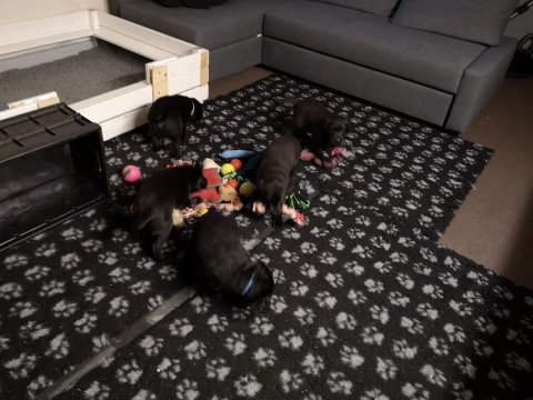 Det er den sidste uge i hvalpekassen, hvor der har været rigtig gang i rummet der er blevet tumlet, leget m.m. Flokken hygger sig i rummet, det store hit er at få savsmuld og vand ud på gulvet.Hvalpene vil rigtig gerne udenfor rummet og prøve nye grænser af.. Når vi kommer ind rummet er der med det samme og vil meget gerne snakkes med