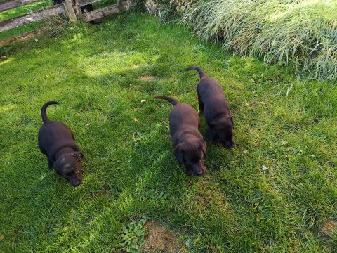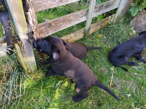 Hvalpene har i denne uge været lidt ude i haven, hvor de straks var på opdagelse sammen med deres mor, som også havde mælkebaren med. Der blev også lavet stort og småt lige som store hunde. De har også været i "hvalpebørnehave". I hvalperummet sker der også mere og mere, der bliver prøvet kræfter, så nogle gange kan man høre nogle hyl, men general er de rigtig søde. Når vi kommer ned til døren i rummet, begynder de at komme hen til lågen og sidder og kigger. De er også begyndt at bruge "hunde WCét" til det store. De får nu hundemad suppleret med Amy´s mælkebar