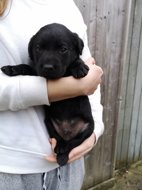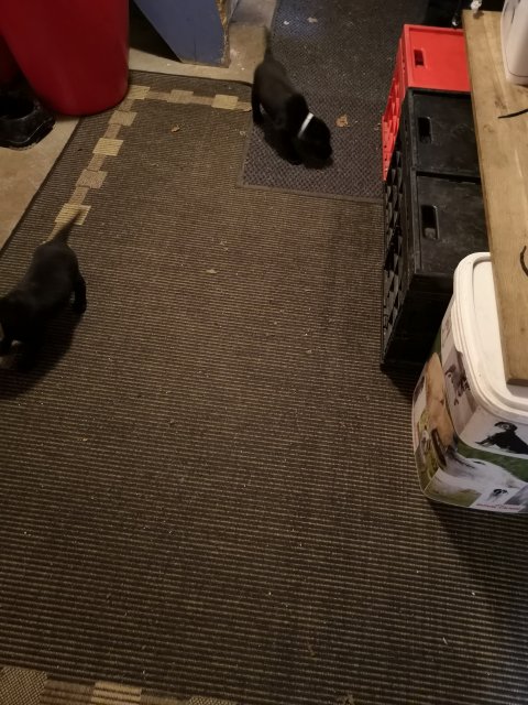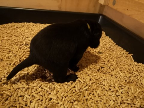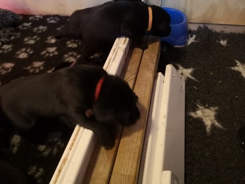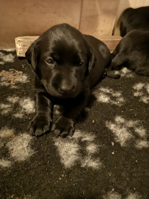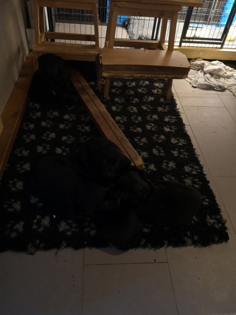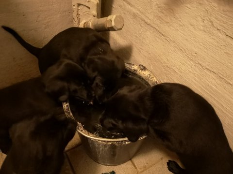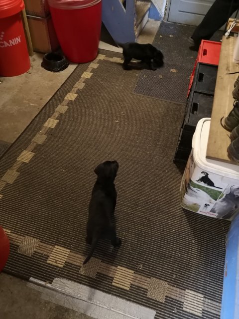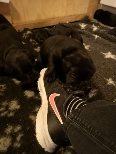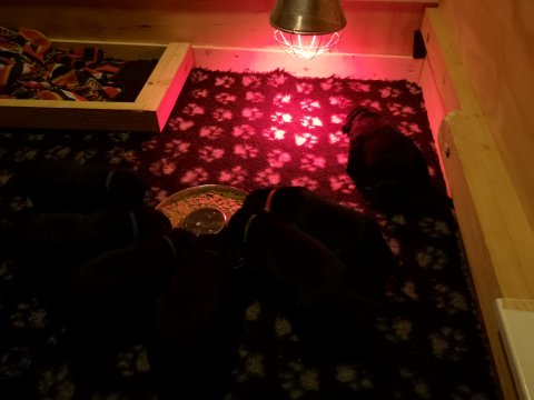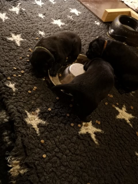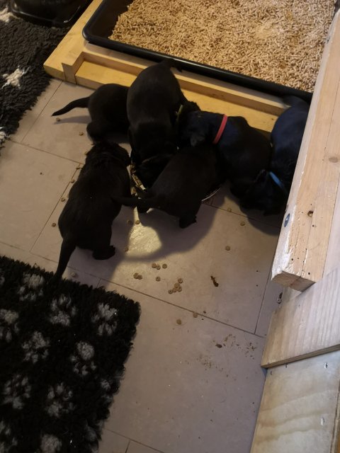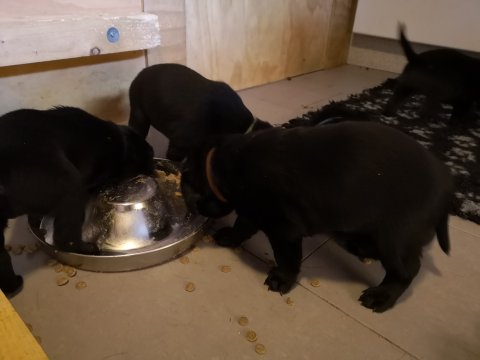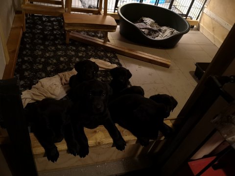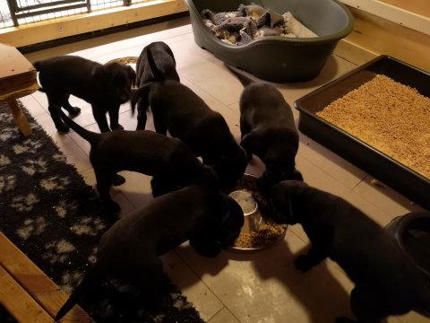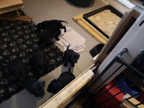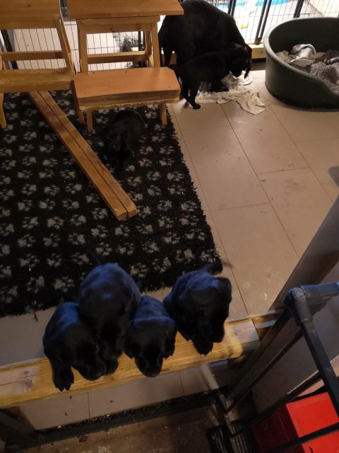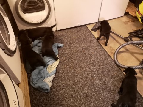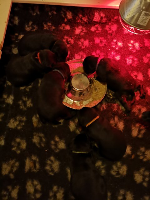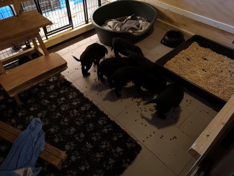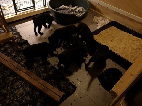Hvalpene er flyttet ud af hvalpekasse og hvalpetoilette er kommet ind, så nu har de hele rummet. Der er kommet mere liv i rummet og der bliver tumlet og prøvet kræfter med hinanden. De små hvalpetænder er kommet frem, så alt skal undersøges. De får nu fast føde opblødt i vand, og de er ved at lærer at de ikke må gå i maden.