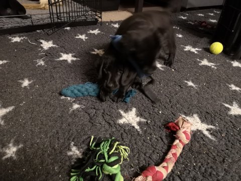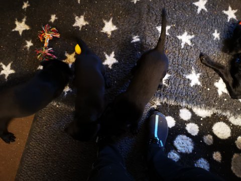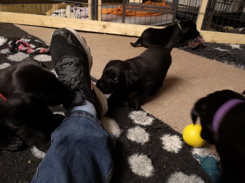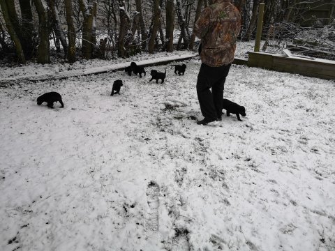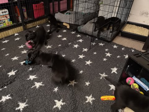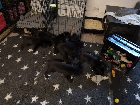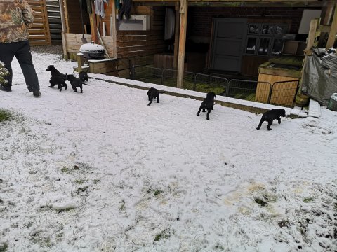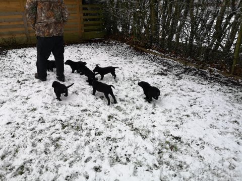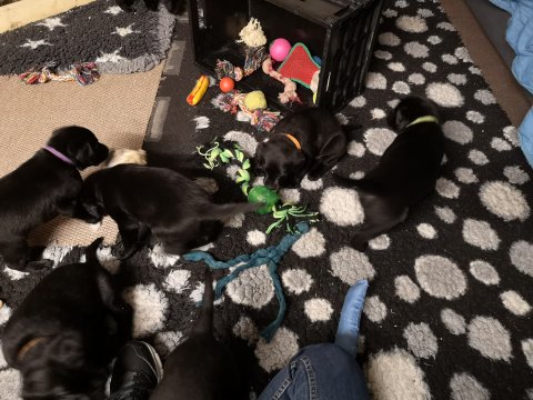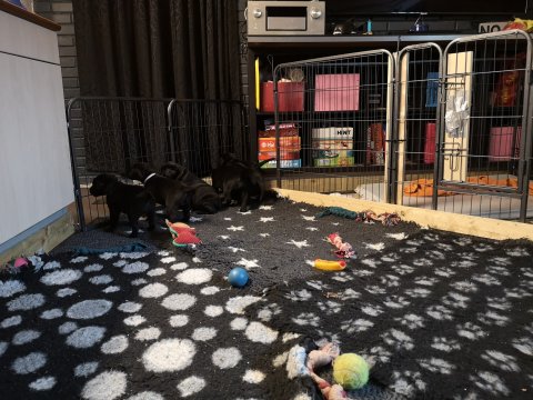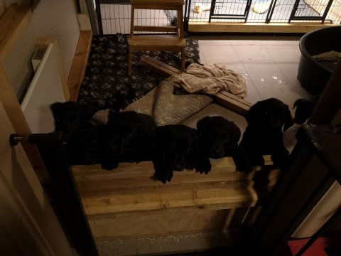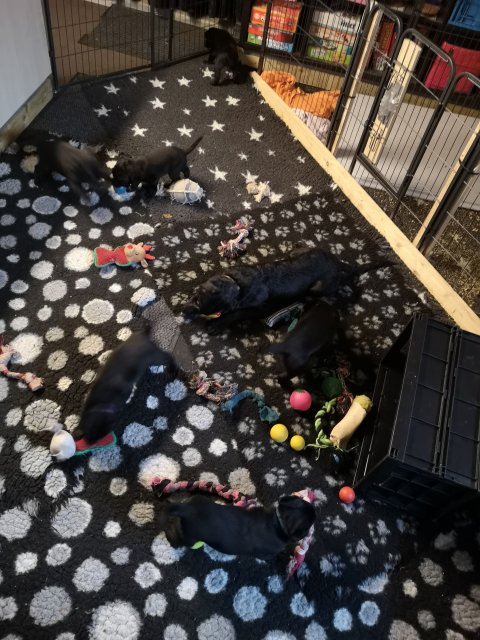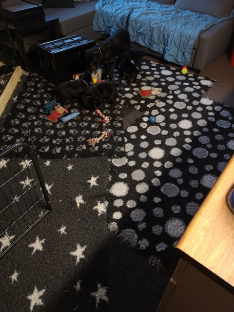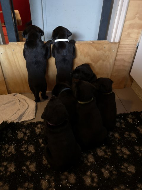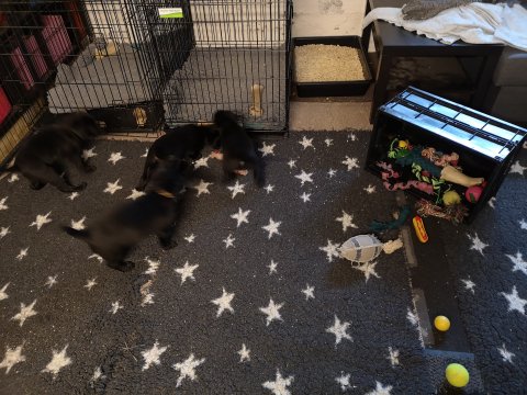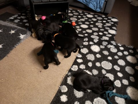 Det er den sidste uge i hvalpekassen, hvor der har været rigtig gang i rummet der er blevet tumlet, leget m.m. Flokken hygger sig i rummet,men vil rigtig gerne ud og gå på opdagelse og prøve nye grænser. De har været heldig at være ude i sne hvilket de synes var rigtig sjovt. Når vi kommer ind rummet er der med det samme og vil meget gerne snakkes med.De er alle klar og nysgerrig til at komme ud i verden ud på nye oplevelser i deres nye familier.