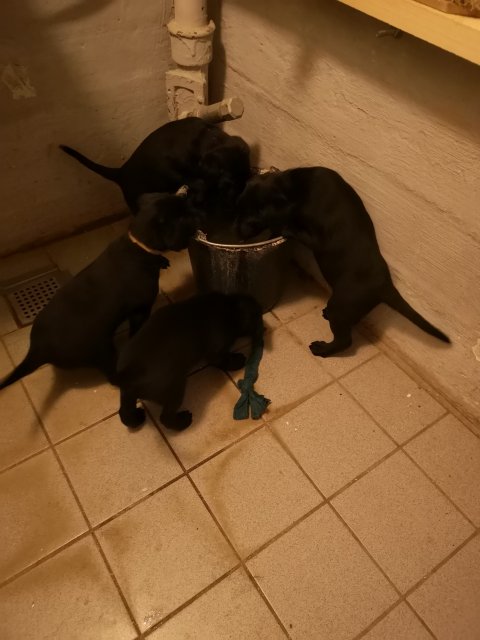 De har alle fået øjne og begyndt at bevæge sig rundt i kassen næsten som rigtig små hunde. De har også opdaget de andre hvalpe i kasse, så de er begyndt at "slås" med hinanden. De prøver også deres lyde og især når de gerne vil have mad fra Nata. De er begyndt at få opblødt hvalpefoder, som de alle spiser på hver deres forskellige måder ofte midt i maden, så de er ikke så pæne efter der har spist. Nata er god til at komme og gøre dem fine igen også får de også lidt fra Nata´s mælkebar
