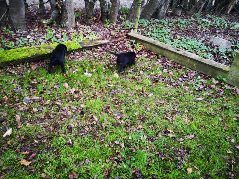 Hvalpene har næsten hverdag været udenfor deres hvalperum enten i "hvalpe børnehaven" eller udenfor når vejret har været til det, nogle gang 2 og 2, det er nemmer for os at styre, for ALT bliver samlet op når de skal på nye oplevelser. De bliver mere og mere modige, alt bliver undersøgt og de løber lidt længere væk fra os, når vi fløjter/kalder kommer de rigtig glade hen til os igen. Når de er i "hvalpebørnehaven", starter de ofte med at finde noget de kan have i munden også komme de stolte hen til os og viser det som små jagthunde. Bagefter går de på opdagelse løber frem og tilbage. prøver kræfter med sig selv og hinanden. De er også blevet svære at fotografer, for der hele tiden gang i dem.Hvalpene vil rigtig gerne snakke med os når vi kommer ned til dem og de komme ofte hen til lågen i hvalperummet og gør opmærksom på at de er i rummet, dog ikke når vi siger godnat, så er der ro i rummet indtil næste morgen. Alle hvalpene har haft besøg af deres kommende familier
