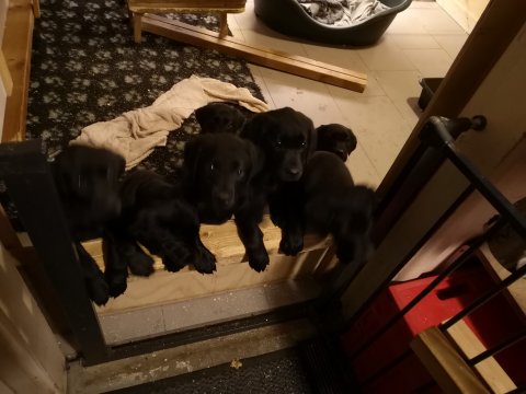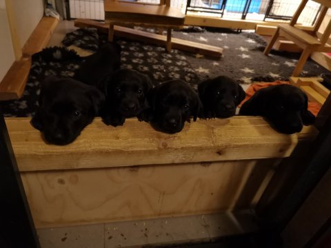 Hvalpene er blevet mere aktive og nysgerrige,så der er ikke så meget ro i hvalperummet mere. De kigger op når vi kommer forbi rummet, hvis de andre hunde kommer ned forbi, er de hurtig henne ved lågen. De har deres egne opdragelses metoder, der bliver kæmpet, leget og sovet, de er blevet godt til at bruge deres ”hunde-WC”, der er ikke så mange våde pletter mere. Hvalpene kan godt lide at komme ud i "hvalpebørnehaven" og det er ikke altid de synes at de er færdig med at lege, når vi sætter dem i rummet igen.
