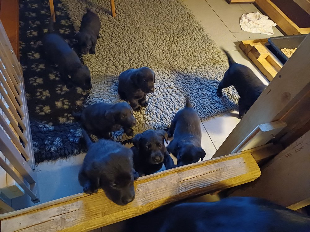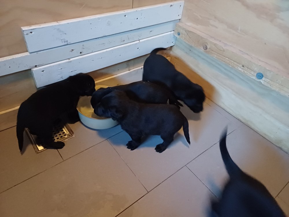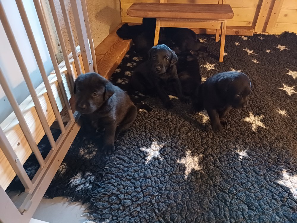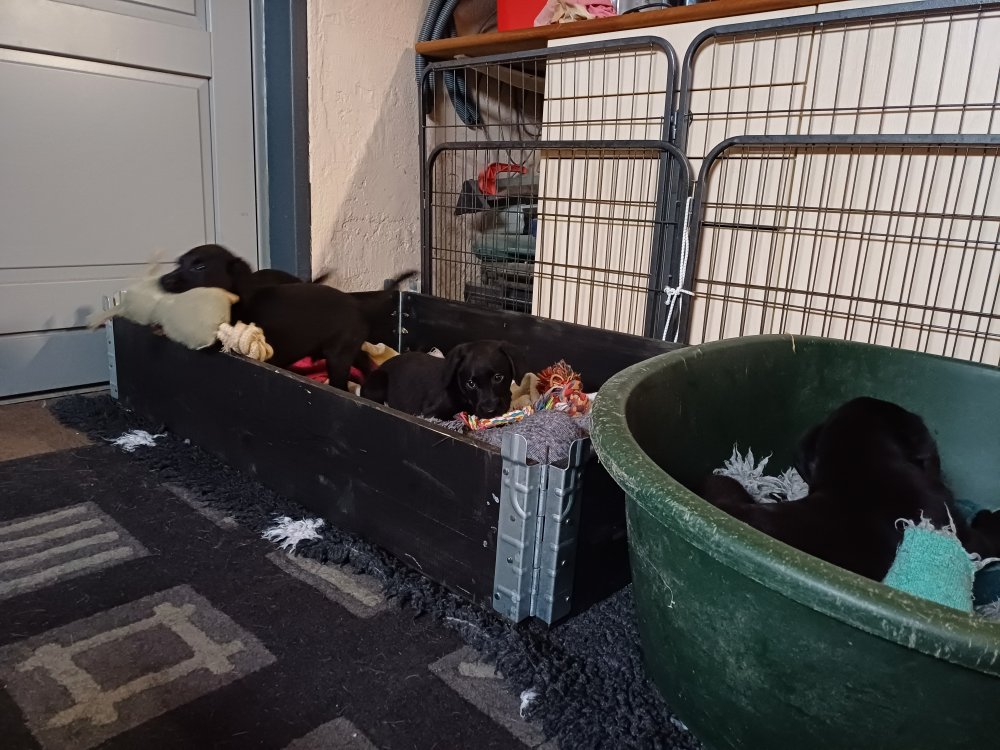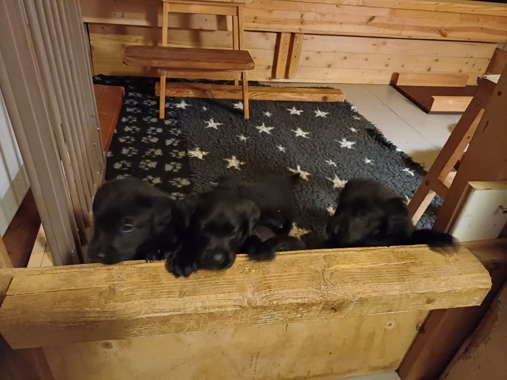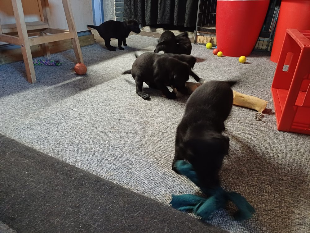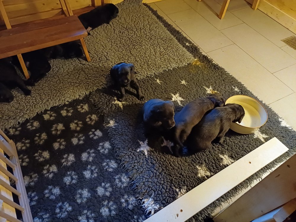 Der sker mere og mere i hvalpekassen hver dag, hvalpene bliver mere opmærksom på hvad der sker omkring dem. Når vi kommer ned til døren i rummet, er de begyndt at komme hen til lågen for at snakke med os. De har været lidt i "hvalpebørnehaven" og der går de op opdagelser, der bliver også prøvet kræfter med hinanden, så nogle gange kan man høre nogle hyl, men general er de rigtig søde. I hvalperummet er de så småt begyndt at bruge "hunde WCét" til det store. De får rigtig hundefod og de er helt klar over hvornår de skal have mad, de kommer når der bliver fløjtet, så er de klar: