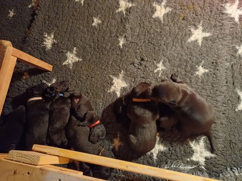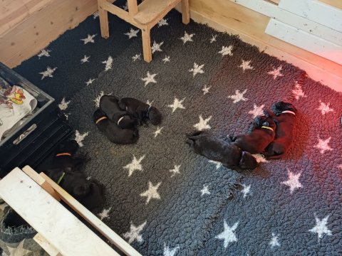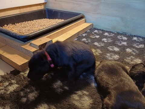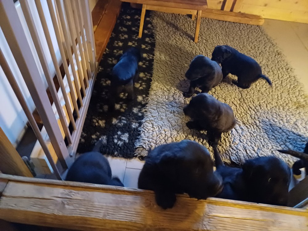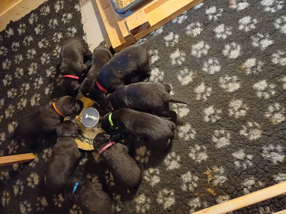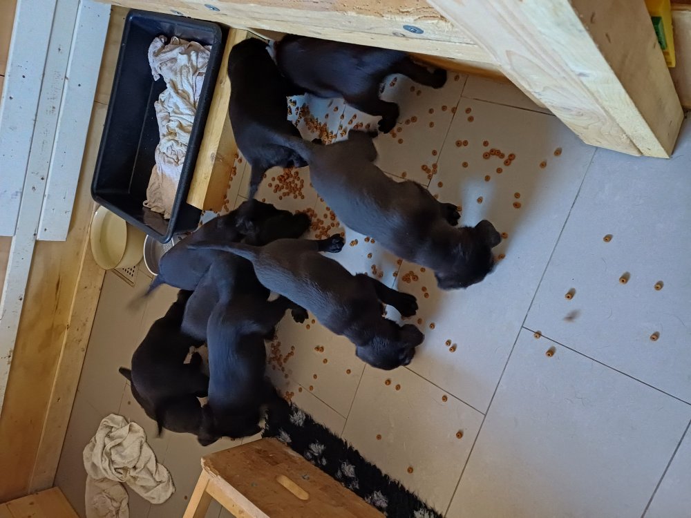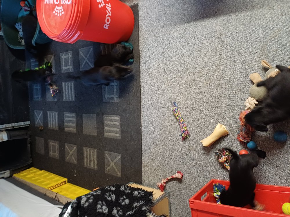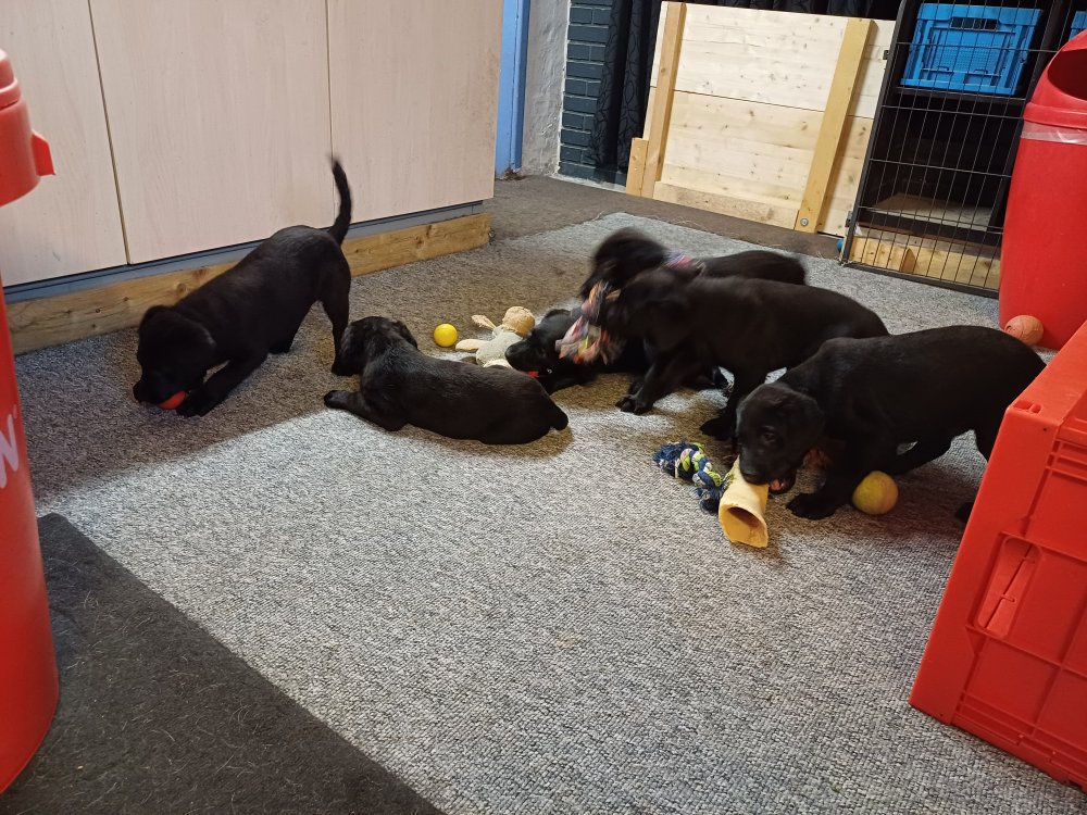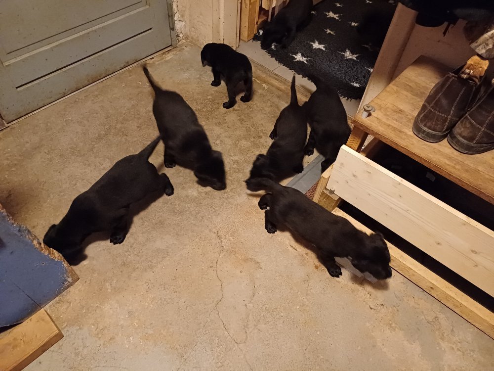 Der sker mere og mere i hvalpekassen hver dag, hvalpene bliver mere opmærksom på hvad der sker omkring dem. Når vi kommer ned til døren i rummet, er de begyndt at komme hen til lågen for at snakke med os. De har været lidt i "hvalpebørnehaven" og der går de op opdagelser, der bliver også prøvet kræfter med hinanden, så nogle gange kan man høre nogle hyl, men general er de rigtig søde. I hvalperummet er de så småt begyndt at bruge "hunde WCét" til det store. De får rigtig hundefod og de er helt klar over hvornår de skal have mad, de kommer når der bliver fløjtet, så er de klar: