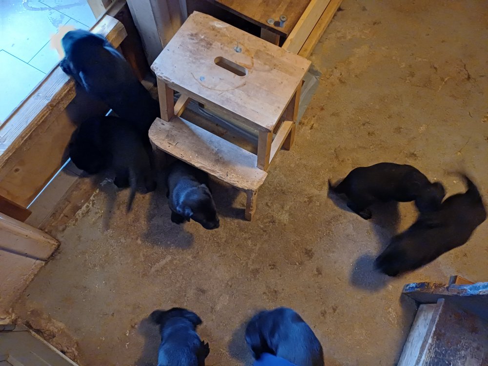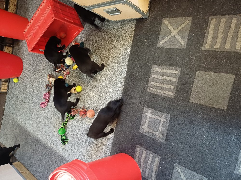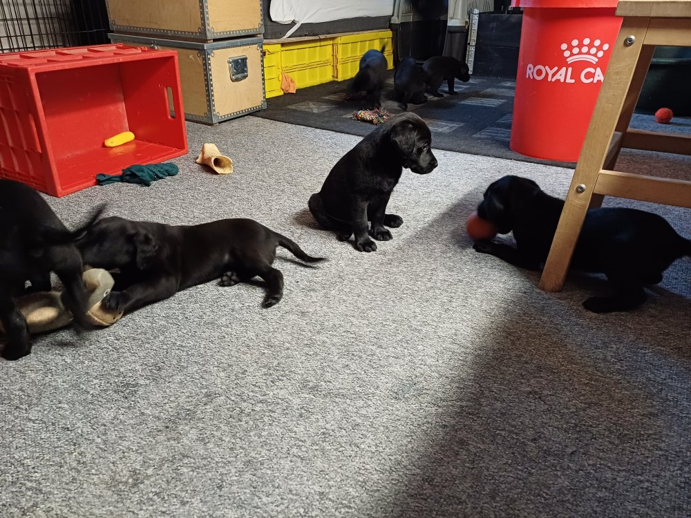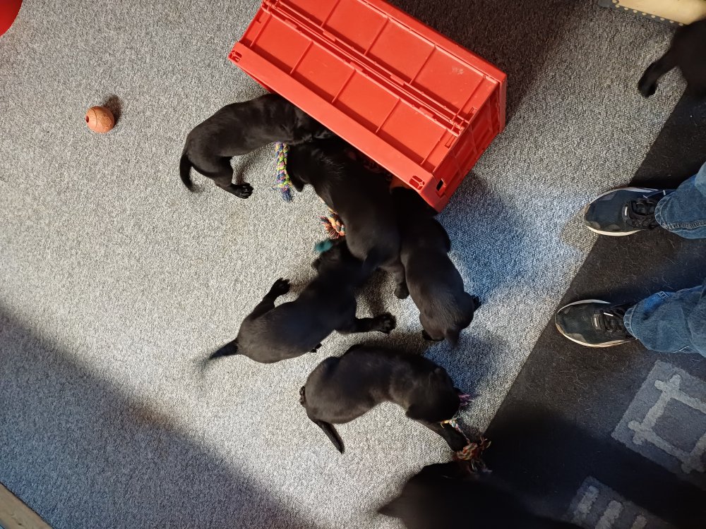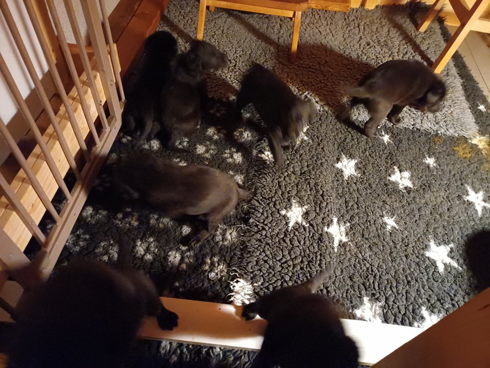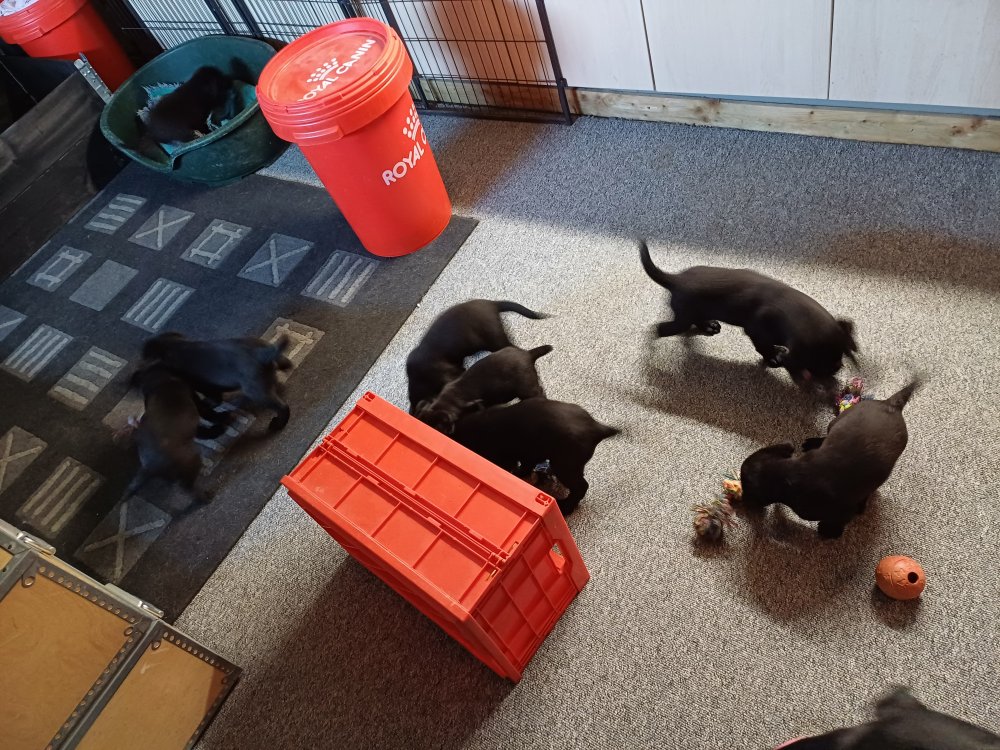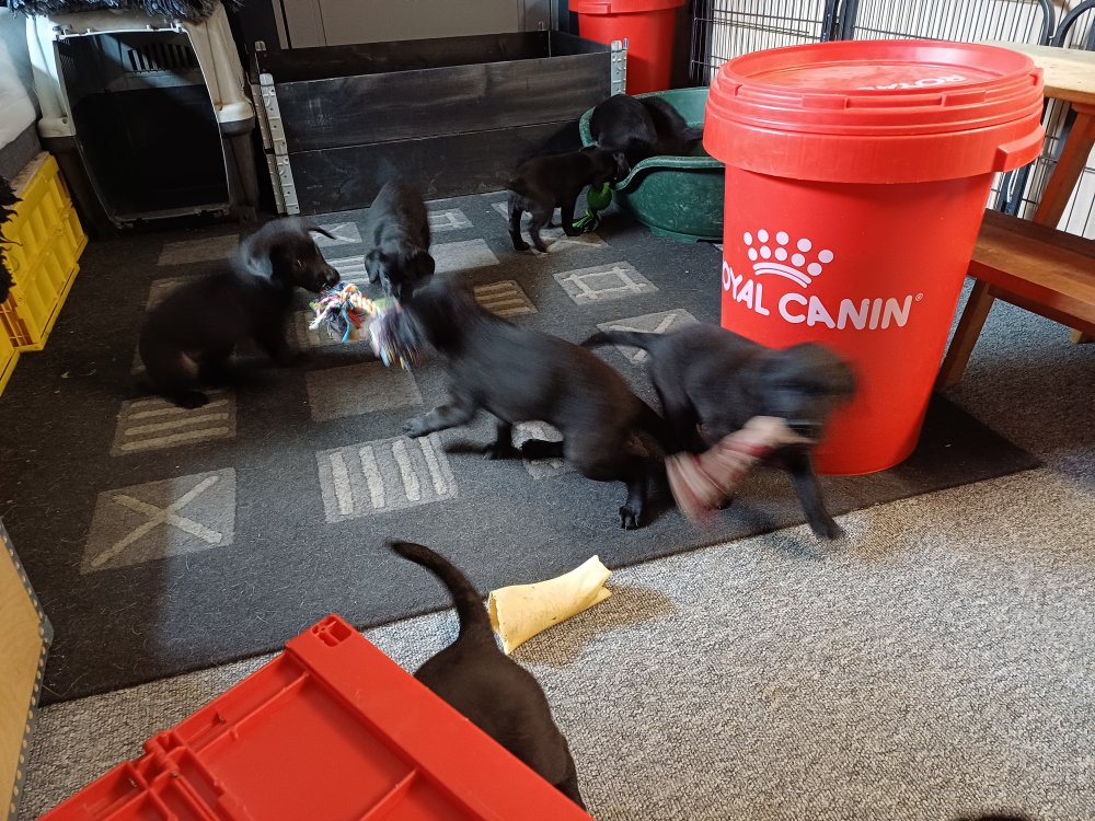 Det er den sidste uge i hvalpekassen, hvor der har været rigtig gang i rummet der er blevet tumlet, leget m.m. De er også blevet mere frække og kender deres spisetider, næsten, for de holder øje med de store hunde og når de store får mad, giver hvalpene lyd fra sig også skal de også have mad. Hvalpene elsker at komme ud af rummet, også er der gang i dem. De løber rundt, tumler og leger med hinanden og hver for sig rigtige nysgerrig hvalpe der skal prøve nye grænser.