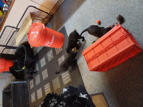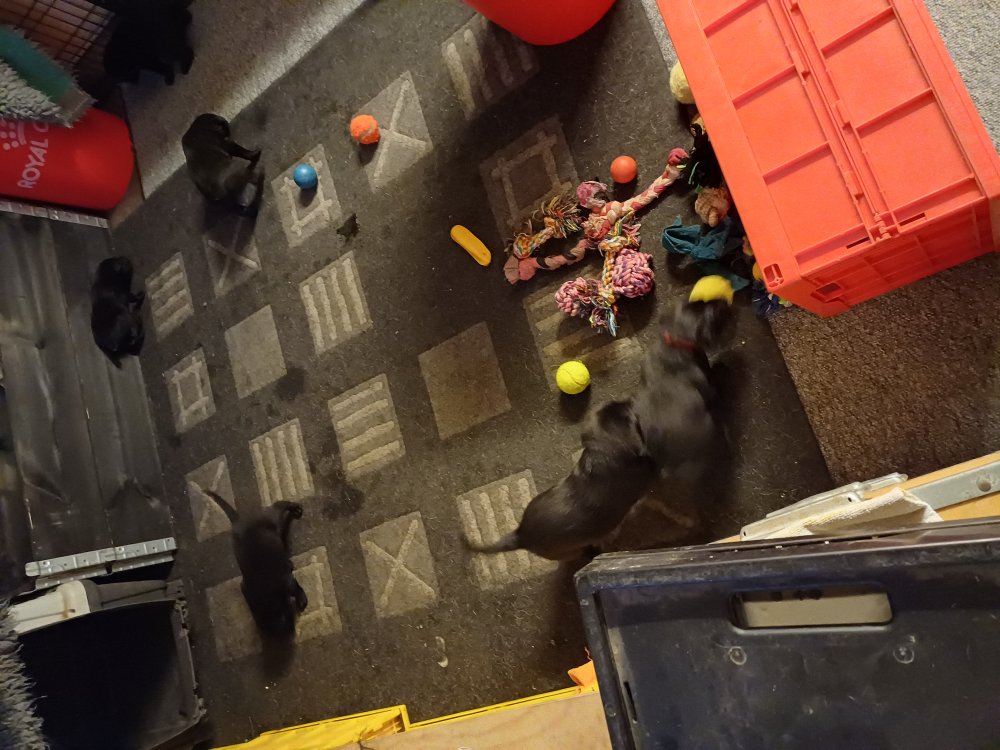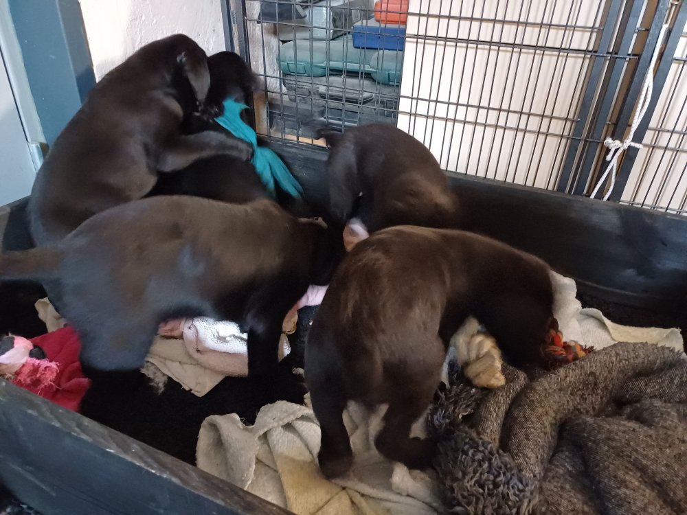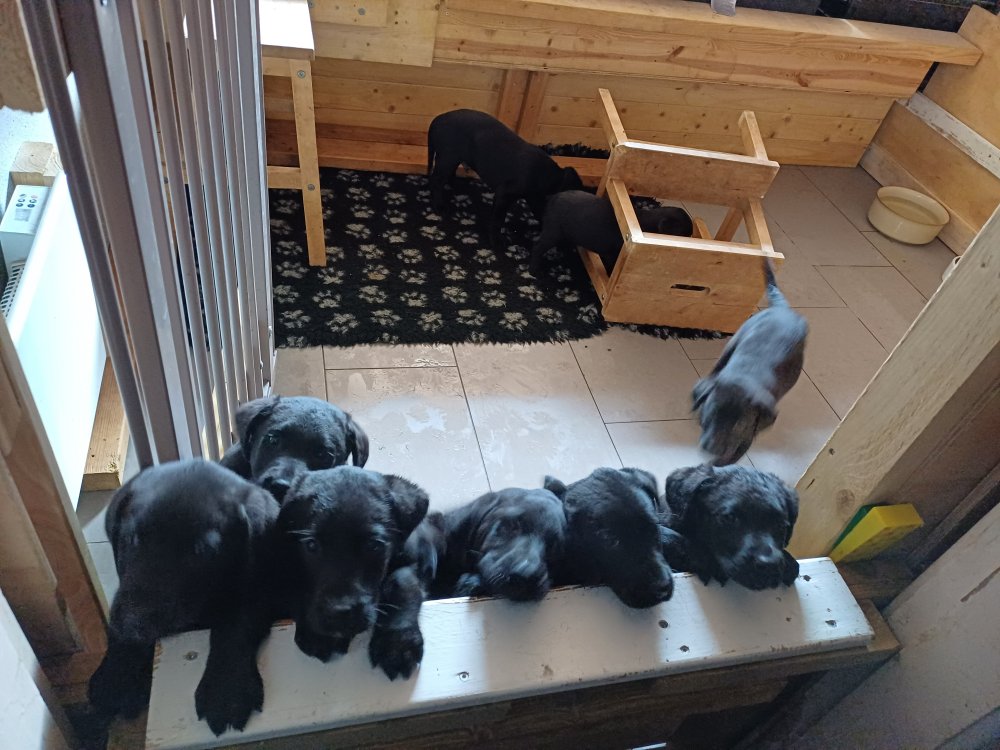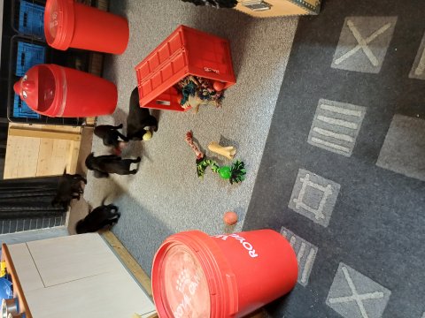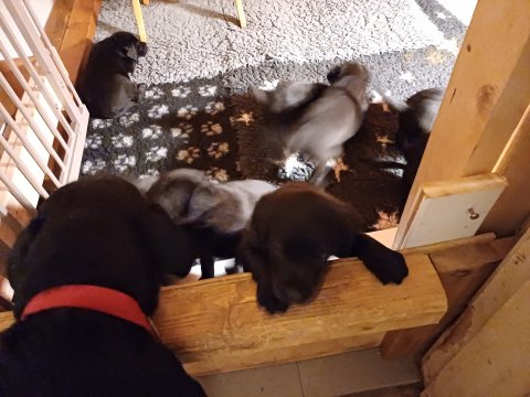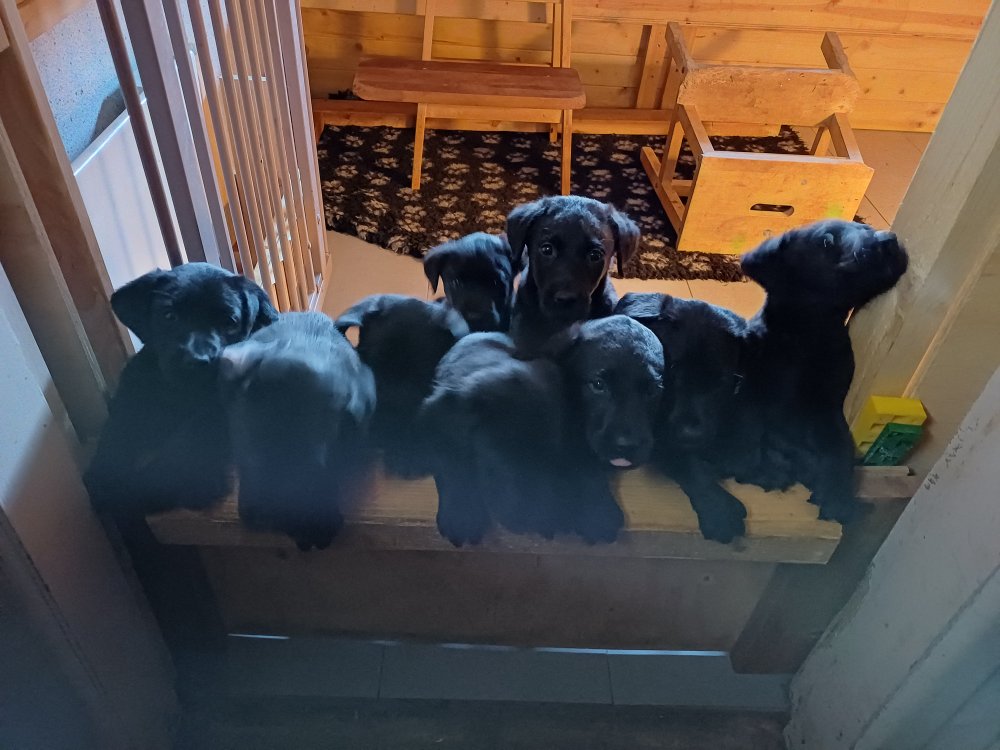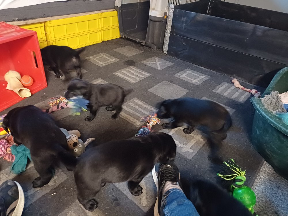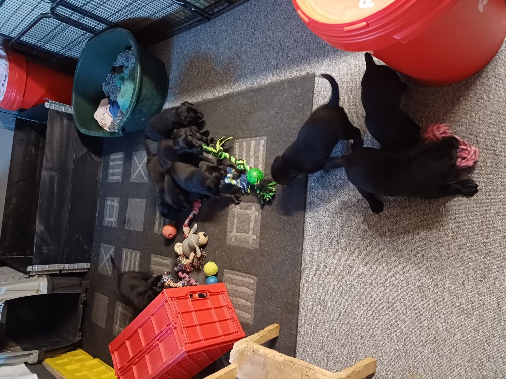Det er den sidste uge i hvalpekassen, hvor der har været rigtig gang i rummet der er blevet tumlet, leget m.m. De er også blevet mere frække og kender deres spisetider, næsten, for de holder øje med de store hunde og når de store får mad, giver hvalpene lyd fra sig også skal de også have mad. Hvalpene elsker at komme ud af rummet, også er der gang i dem. De løber rundt, tumler og leger med hinanden og hver for sig rigtige nysgerrig hvalpe der skal prøve nye grænser.