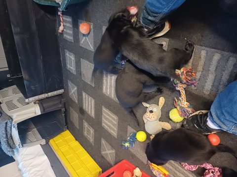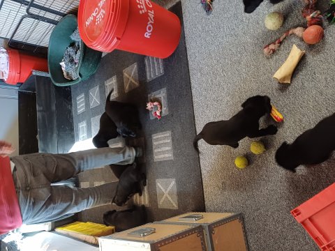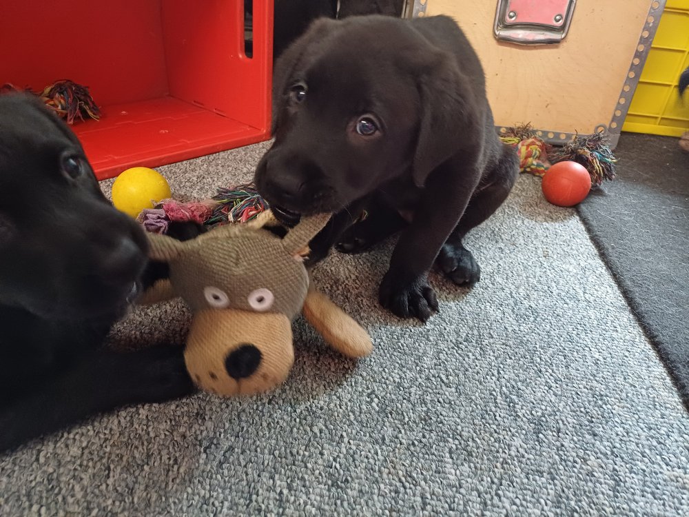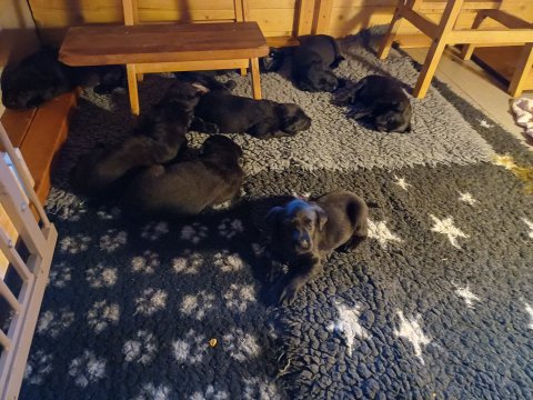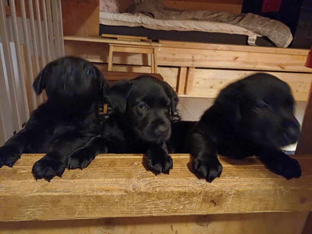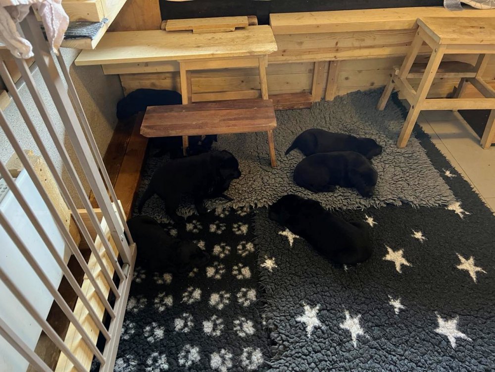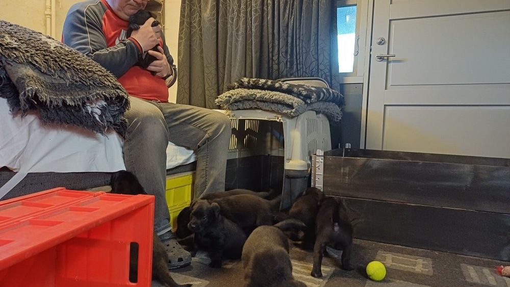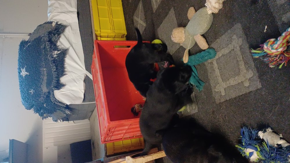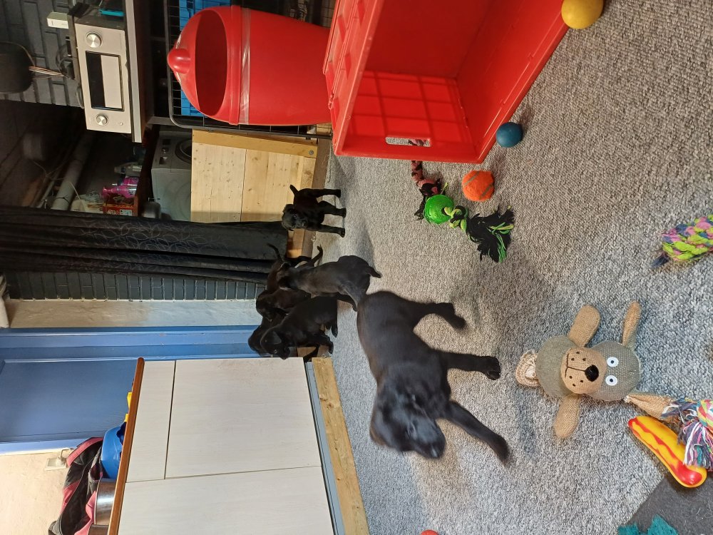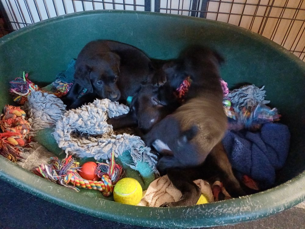 Det er den sidste uge i hvalpekassen, hvor der har været rigtig gang i rummet der er blevet tumlet, leget m.m. De er også blevet mere frække og kender deres spisetider, næsten, for de holder øje med de store hunde og når de store får mad, giver hvalpene lyd fra sig også skal de også have mad. Hvalpene elsker at komme ud af rummet, også er der gang i dem. De løber rundt, tumler og leger med hinanden og hver for sig rigtige nysgerrig hvalpe der skal prøve nye grænser.