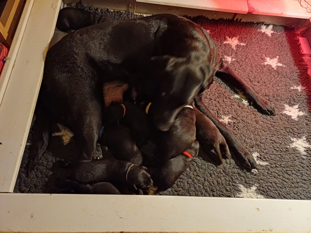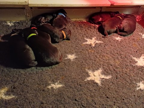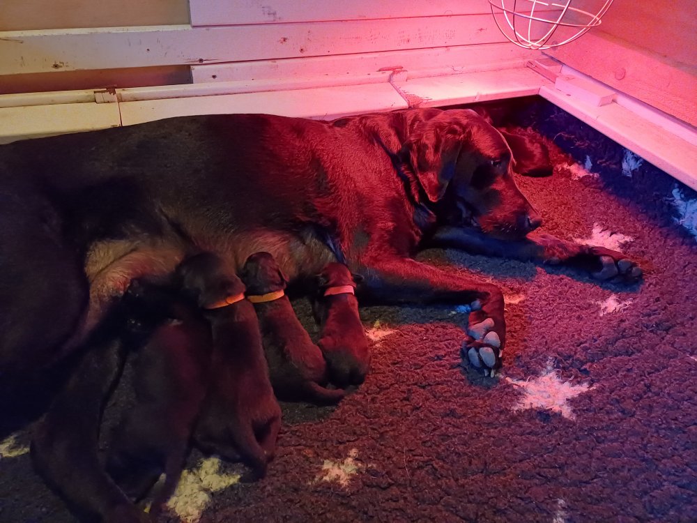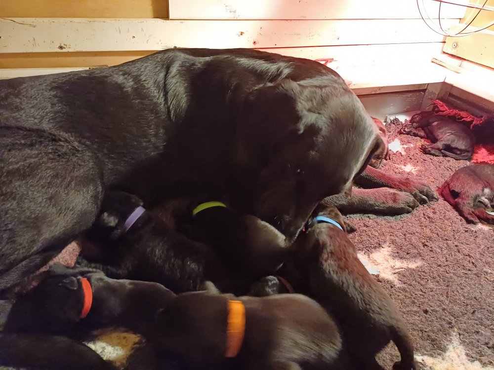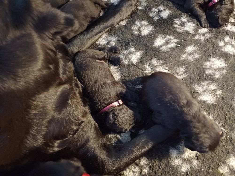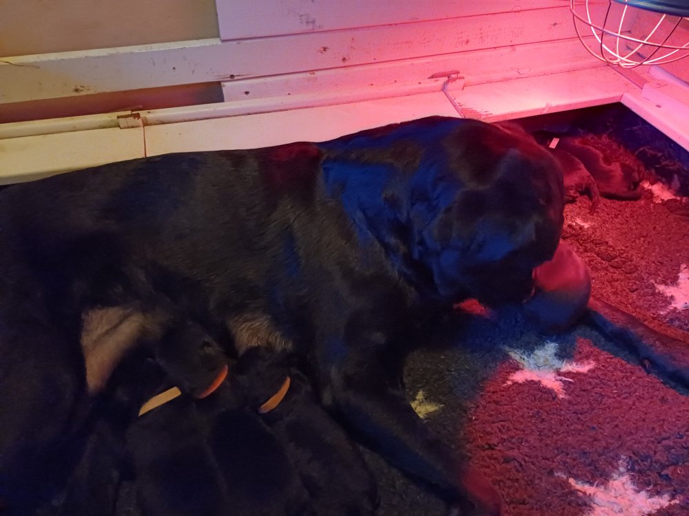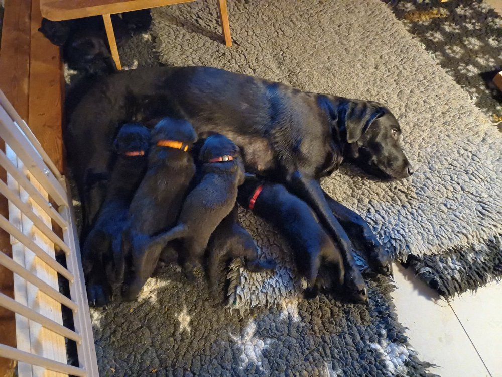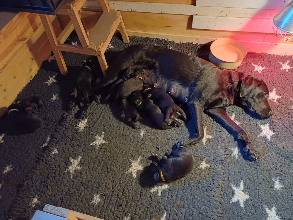 Både hvalpene og Amy har fundet en rytme med hensyn til livet i hvalpekassen, det meste af tiden går stadig med at sove og spise. Hvalpene følger deres egen vægtkurve. Amy er glad for hendes små hvalpe og vise os dem gerne både til os og de andre hunde, når hvalpene er mætte og sover kommer Amy gerne op til resten af familie, men hun vil også rigtig gerne være sammen med hendes hvalpe.