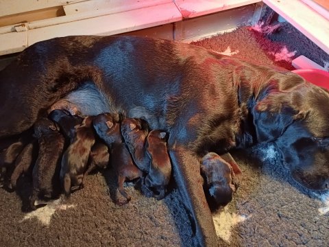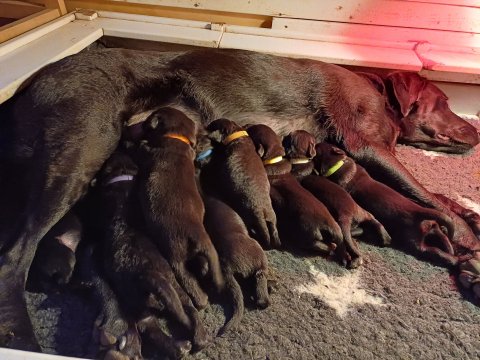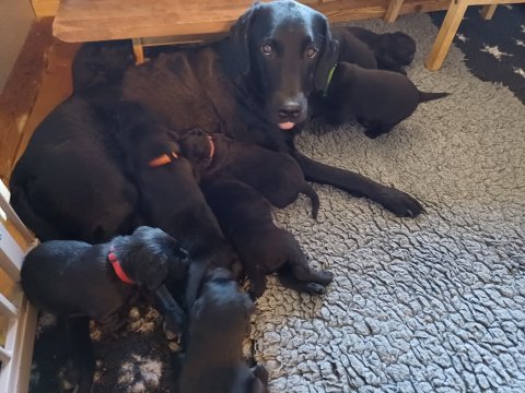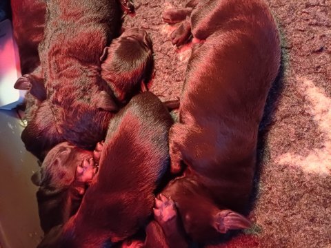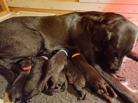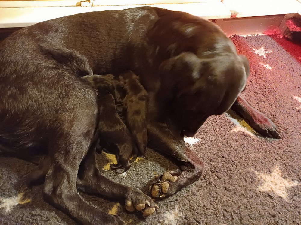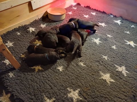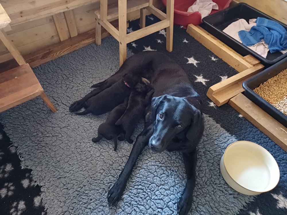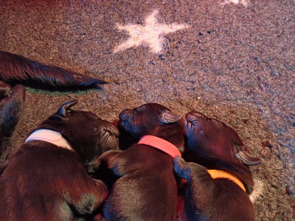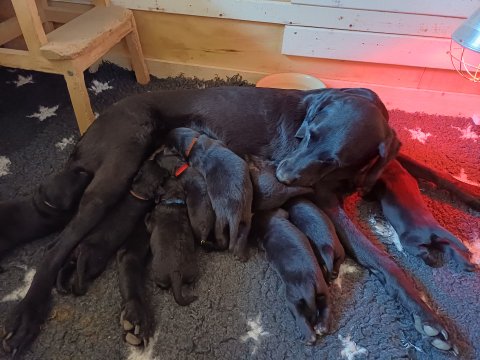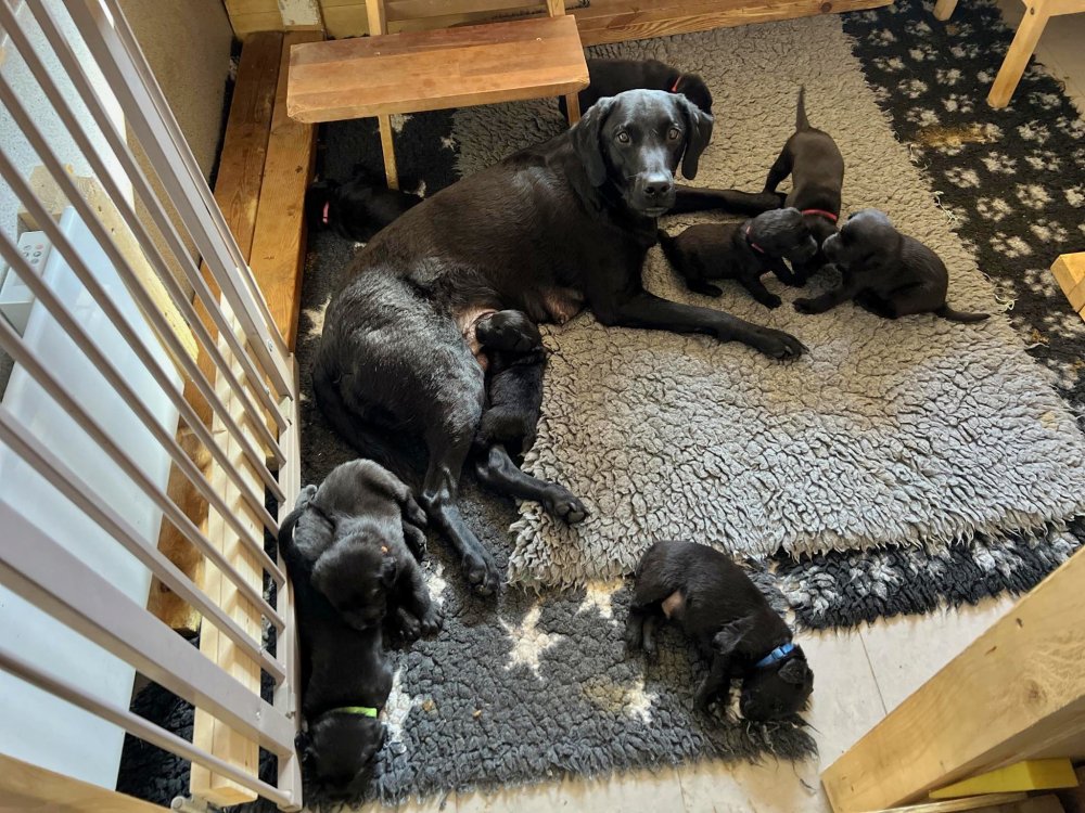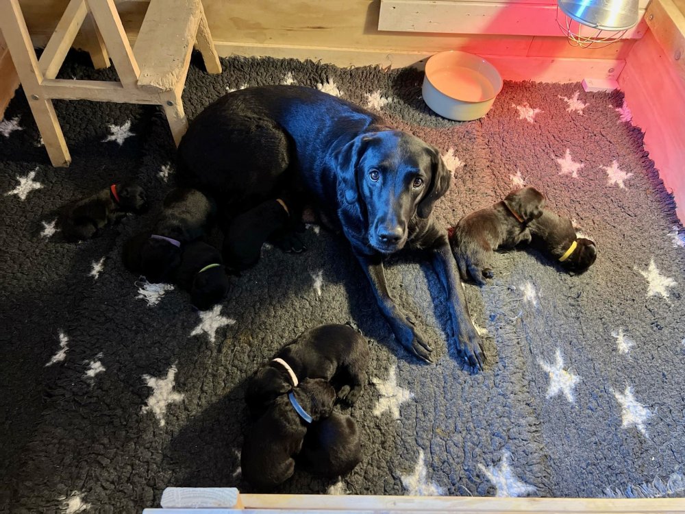 Både hvalpene og Amy har fundet en rytme med hensyn til livet i hvalpekassen, det meste af tiden går stadig med at sove og spise. Hvalpene følger deres egen vægtkurve. Amy er glad for hendes små hvalpe og vise os dem gerne både til os og de andre hunde, når hvalpene er mætte og sover kommer Amy gerne op til resten af familie, men hun vil også rigtig gerne være sammen med hendes hvalpe.
