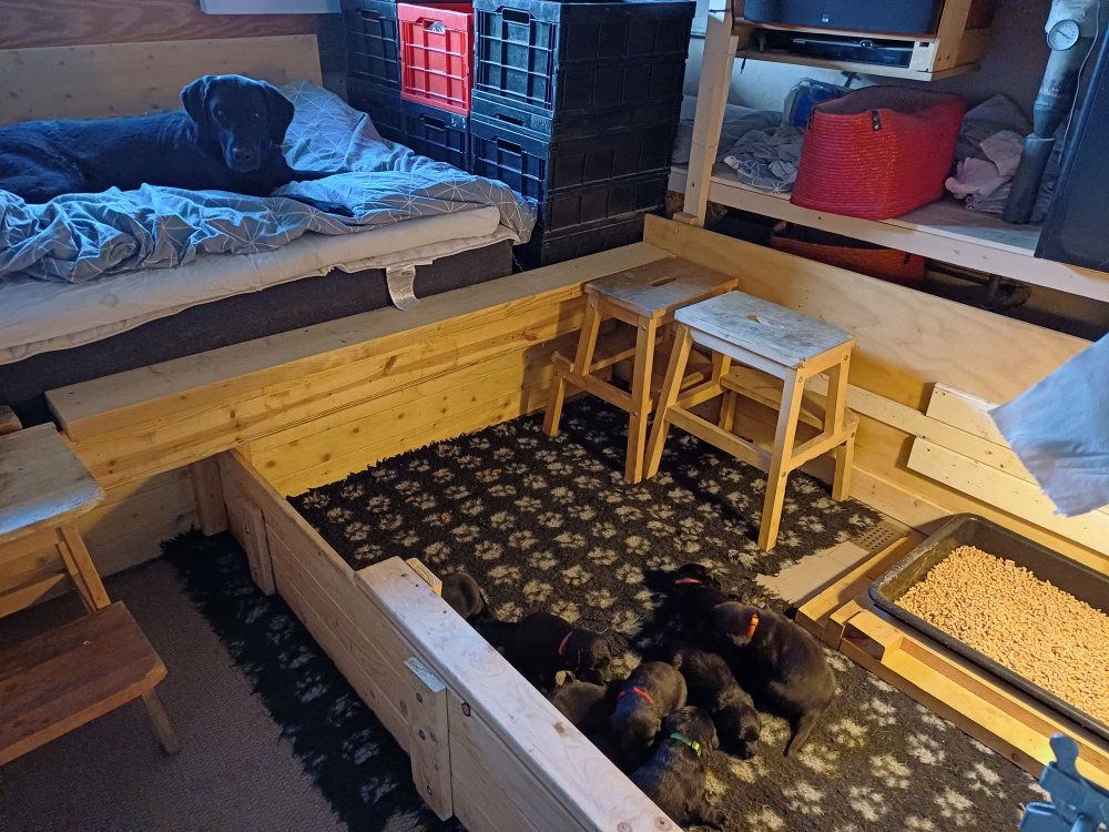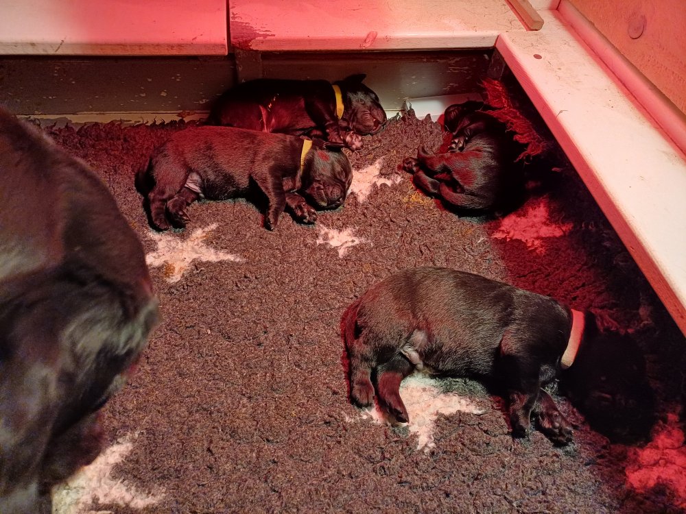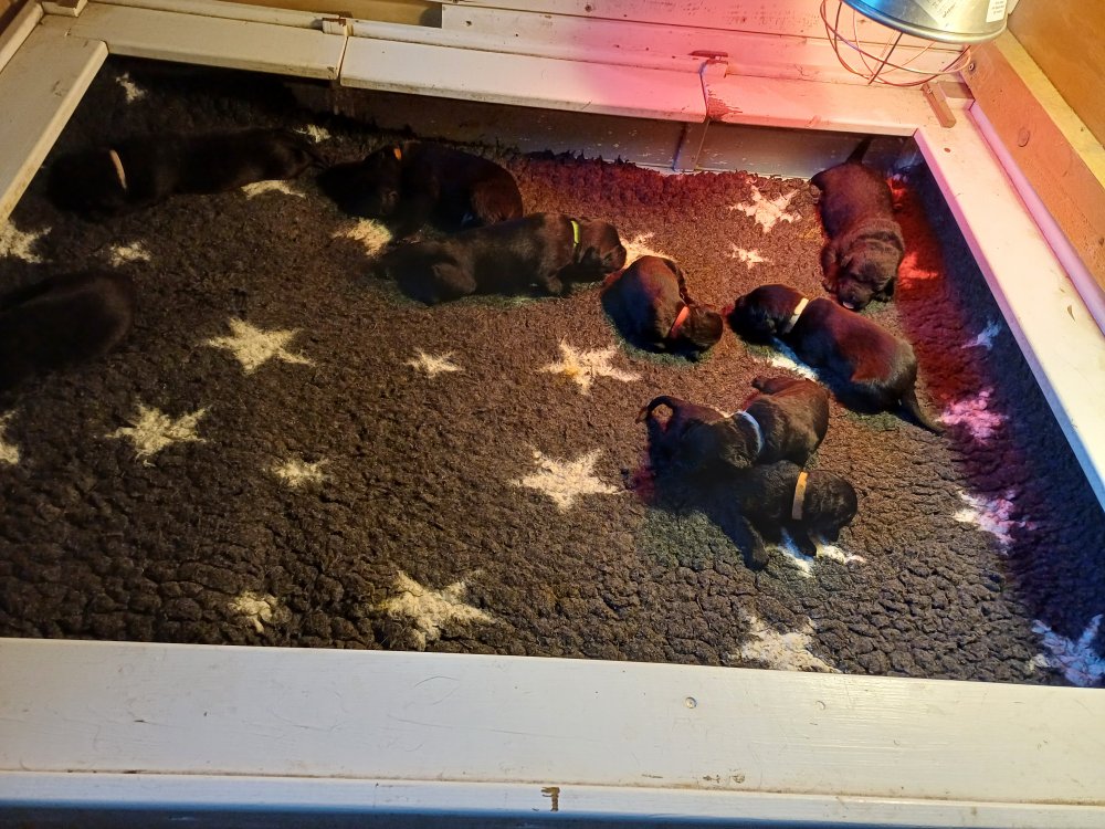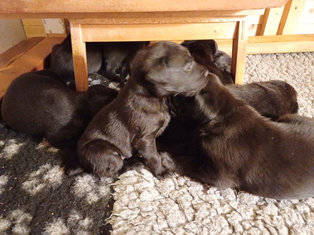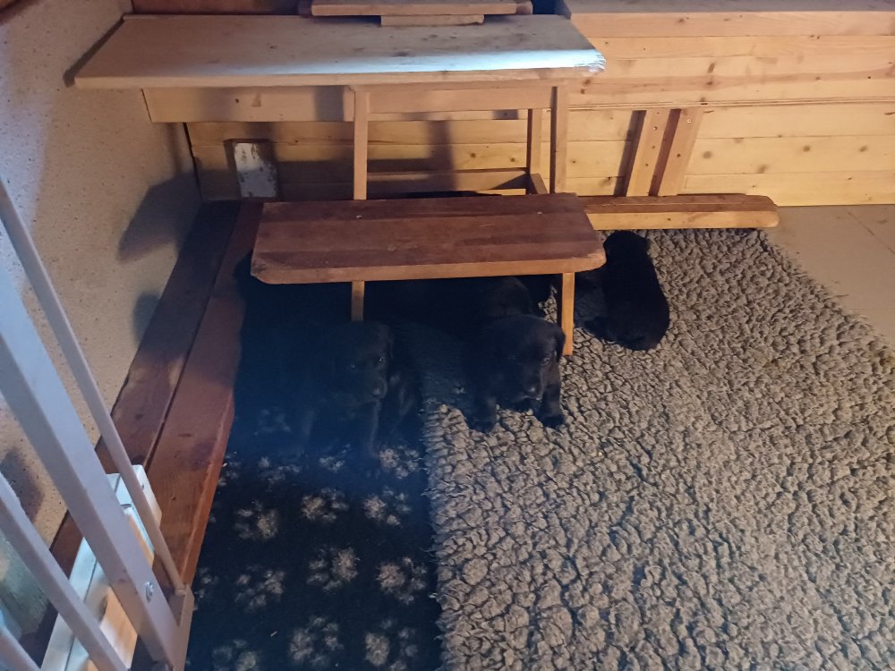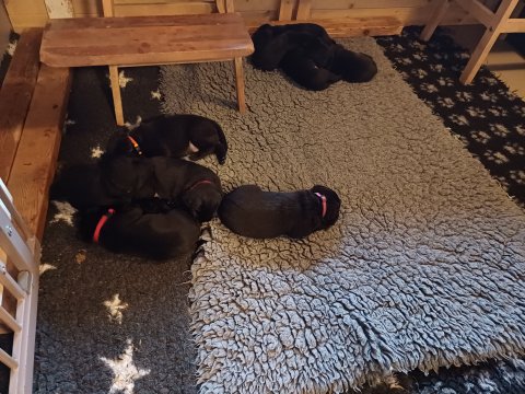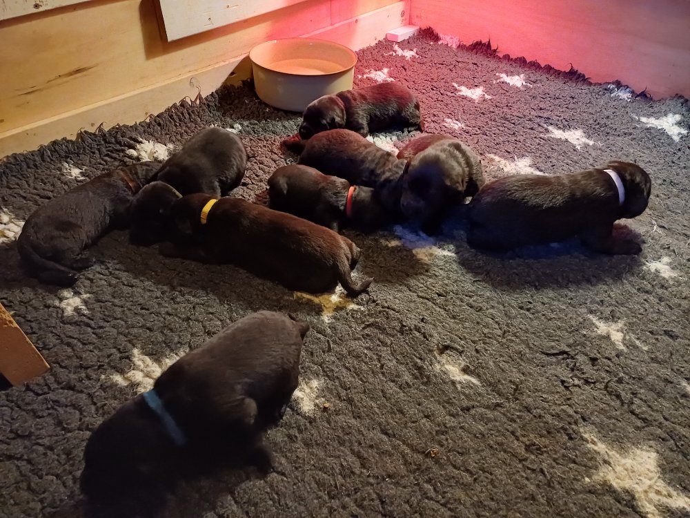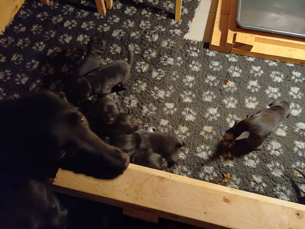 De har fået mere plads, hvalpekassen er kommet ud. Hvalpene er begyndt at bevæge sig lidt mere i en blanding mellem at krybe og forsøge på at bruge benene til at gå. Det er sjovt at se dem prøve at komme rundt i hvalpekassen. Vi er begyndt at kunne ane små sprækker ved øjnene, så det bliver så spændende at se de små øjne når de kommer frem.