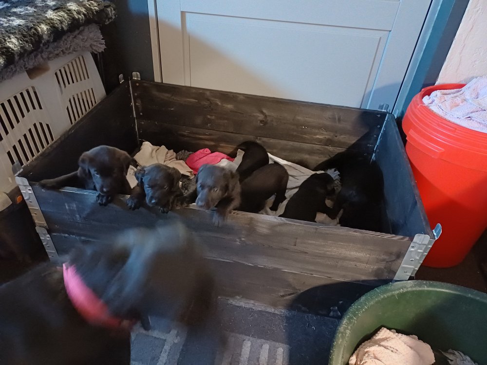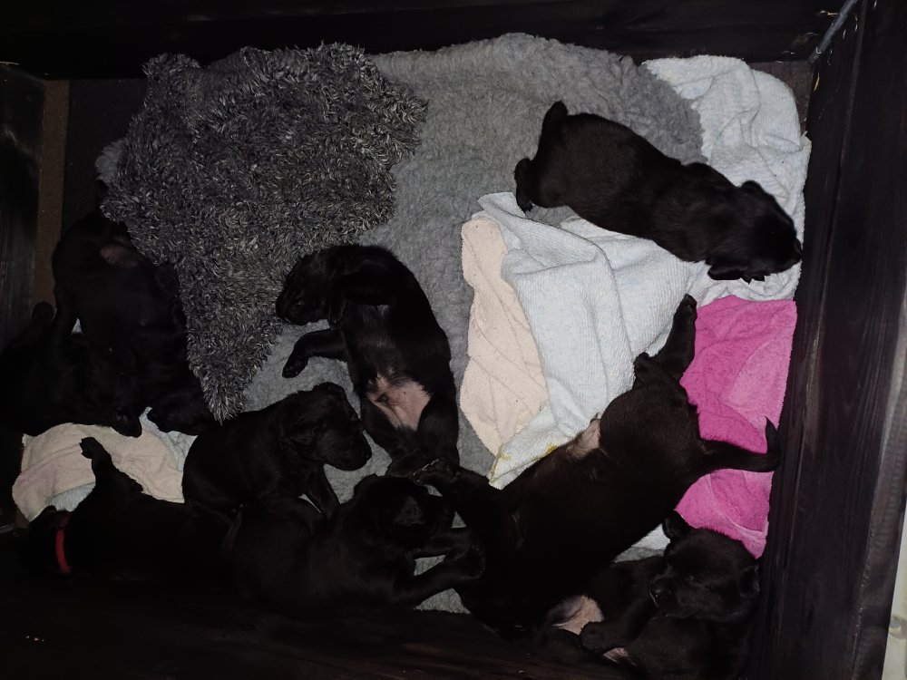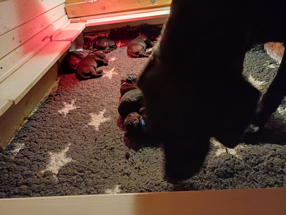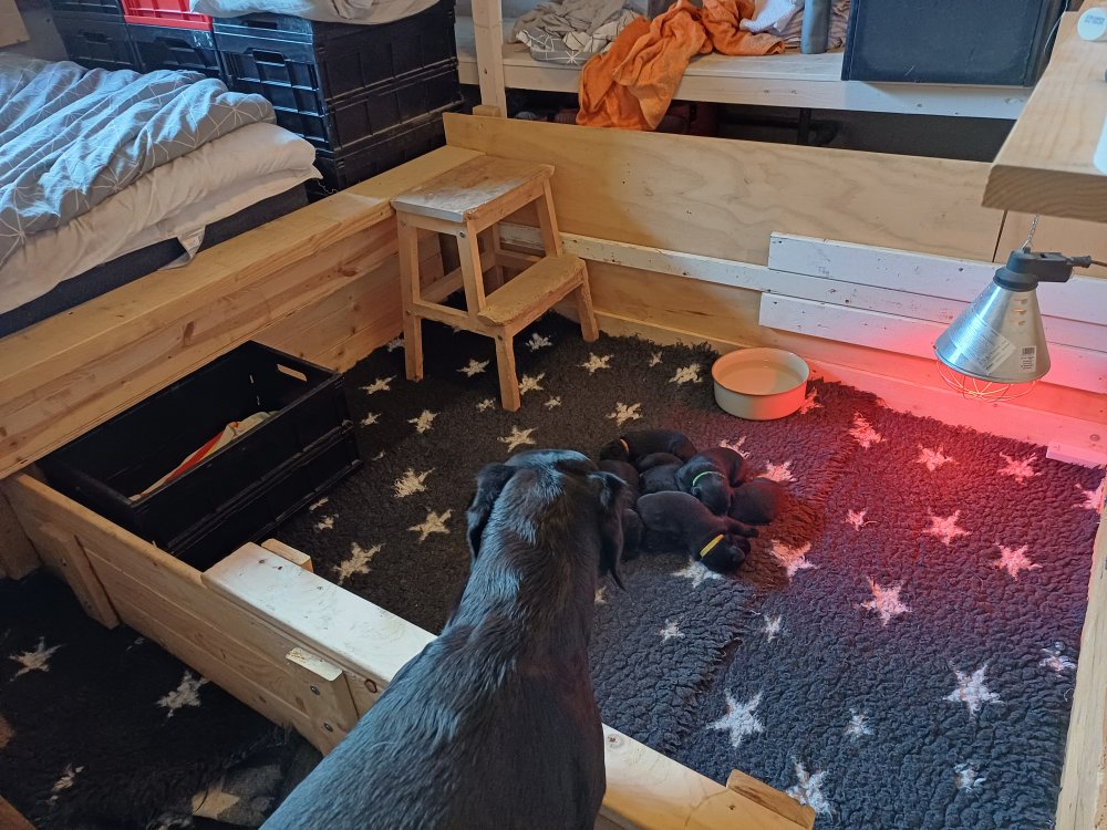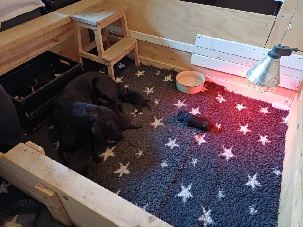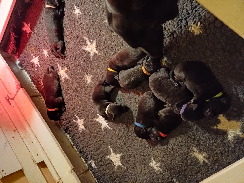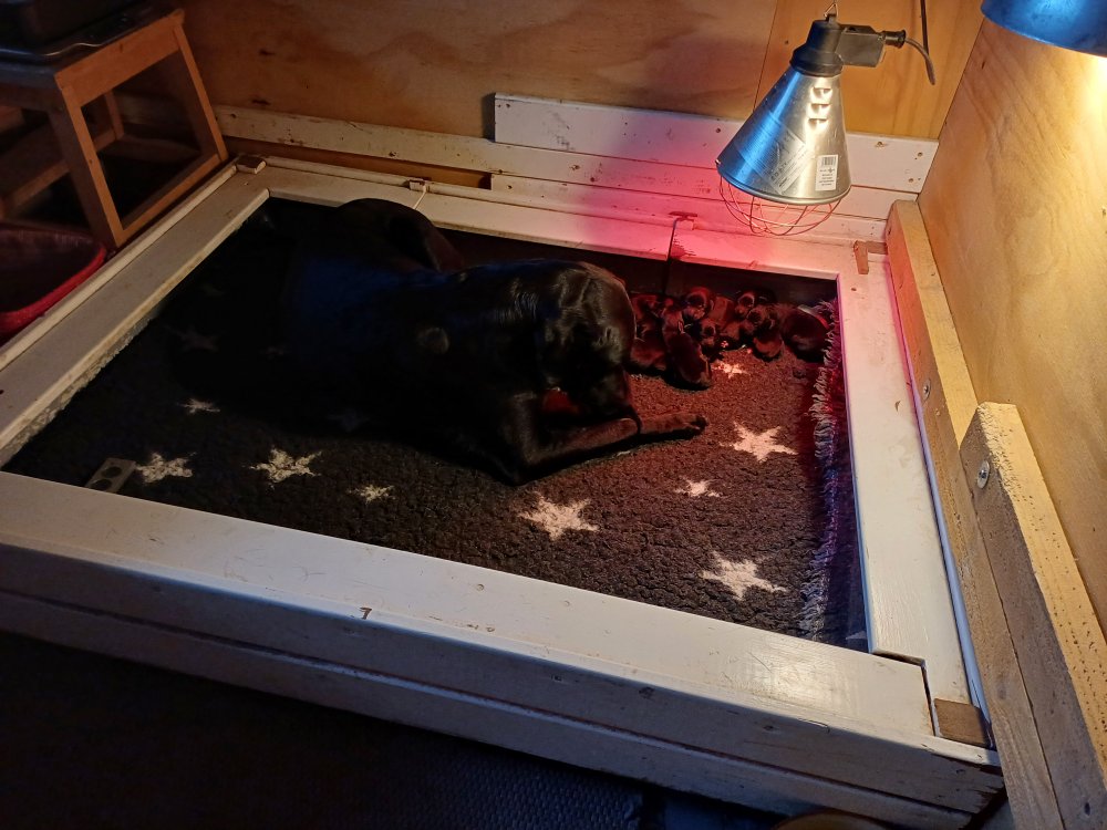 De har fået mere plads, hvalpekassen er kommet ud. Hvalpene er begyndt at bevæge sig lidt mere i en blanding mellem at krybe og forsøge på at bruge benene til at gå. Det er sjovt at se dem prøve at komme rundt i hvalpekassen. Vi er begyndt at kunne ane små sprækker ved øjnene, så det bliver så spændende at se de små øjne når de kommer frem.
