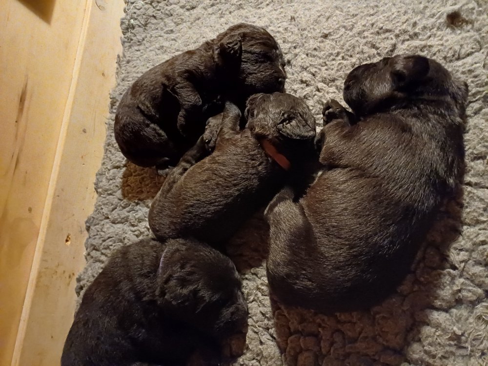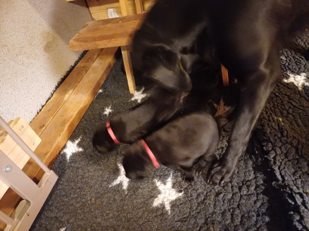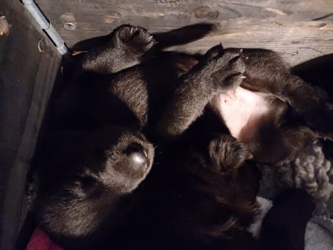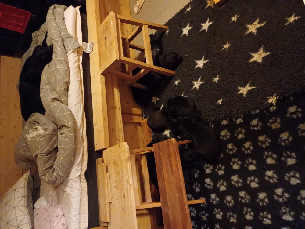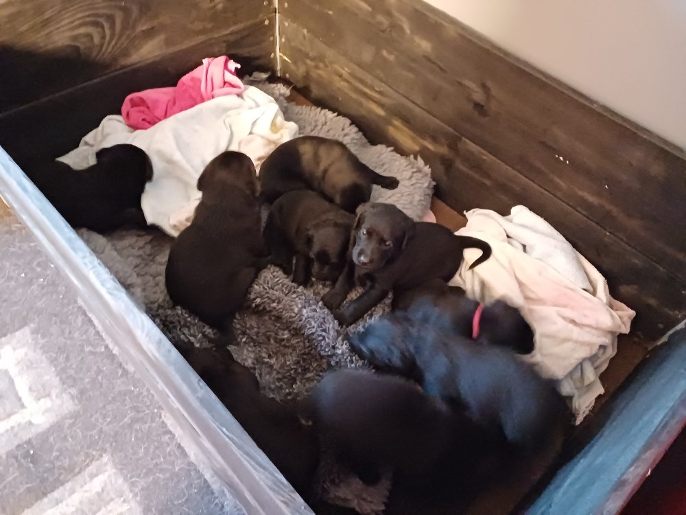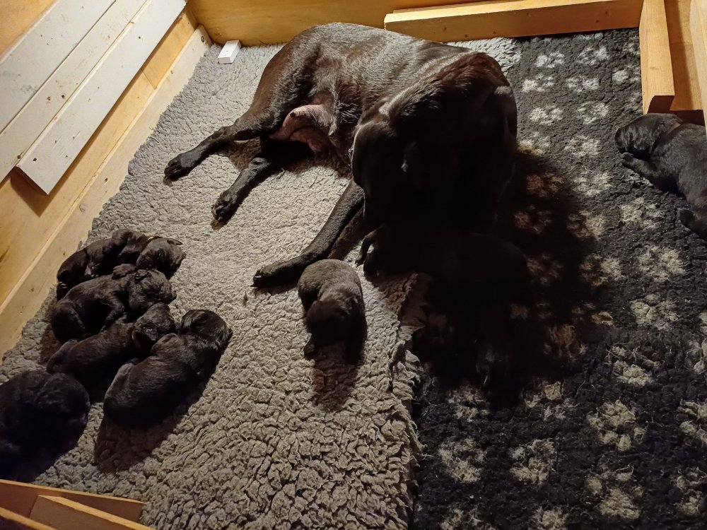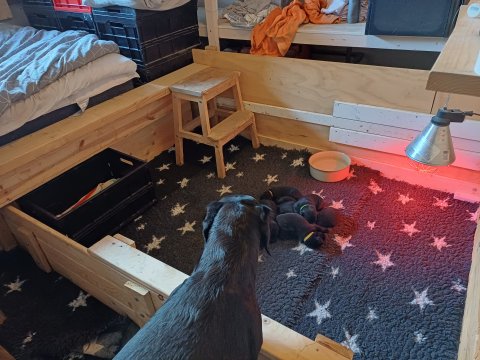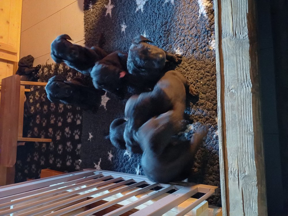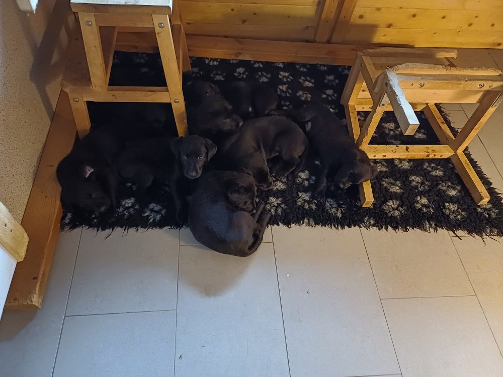 De har fået mere plads, hvalpekassen er kommet ud. Hvalpene er begyndt at bevæge sig lidt mere i en blanding mellem at krybe og forsøge på at bruge benene til at gå. Det er sjovt at se dem prøve at komme rundt i hvalpekassen. Vi er begyndt at kunne ane små sprækker ved øjnene, så det bliver så spændende at se de små øjne når de kommer frem.