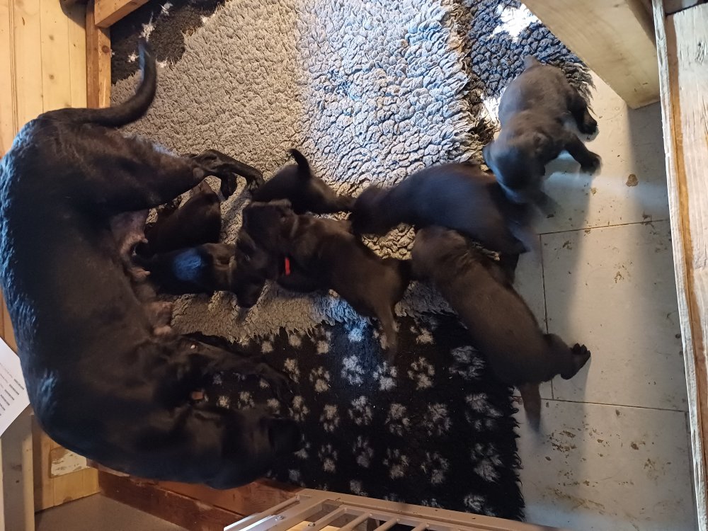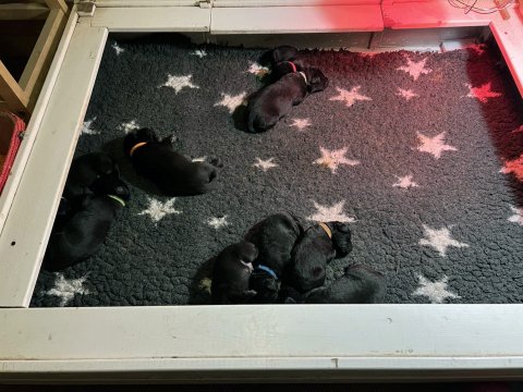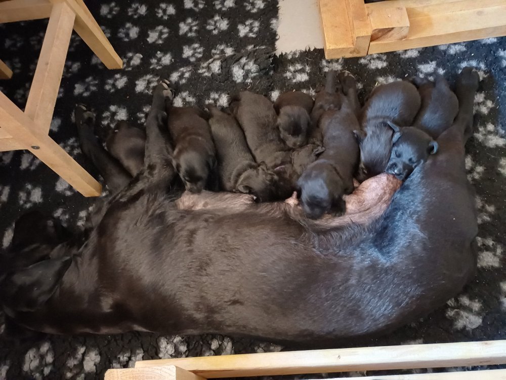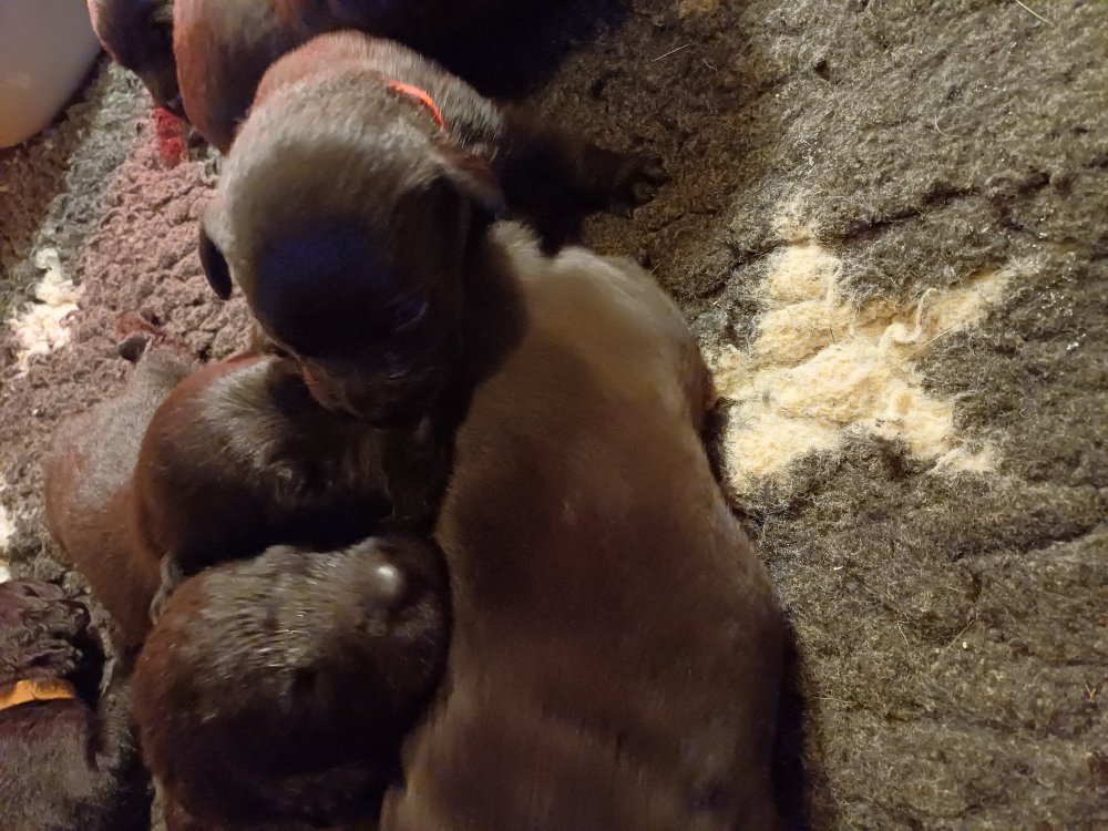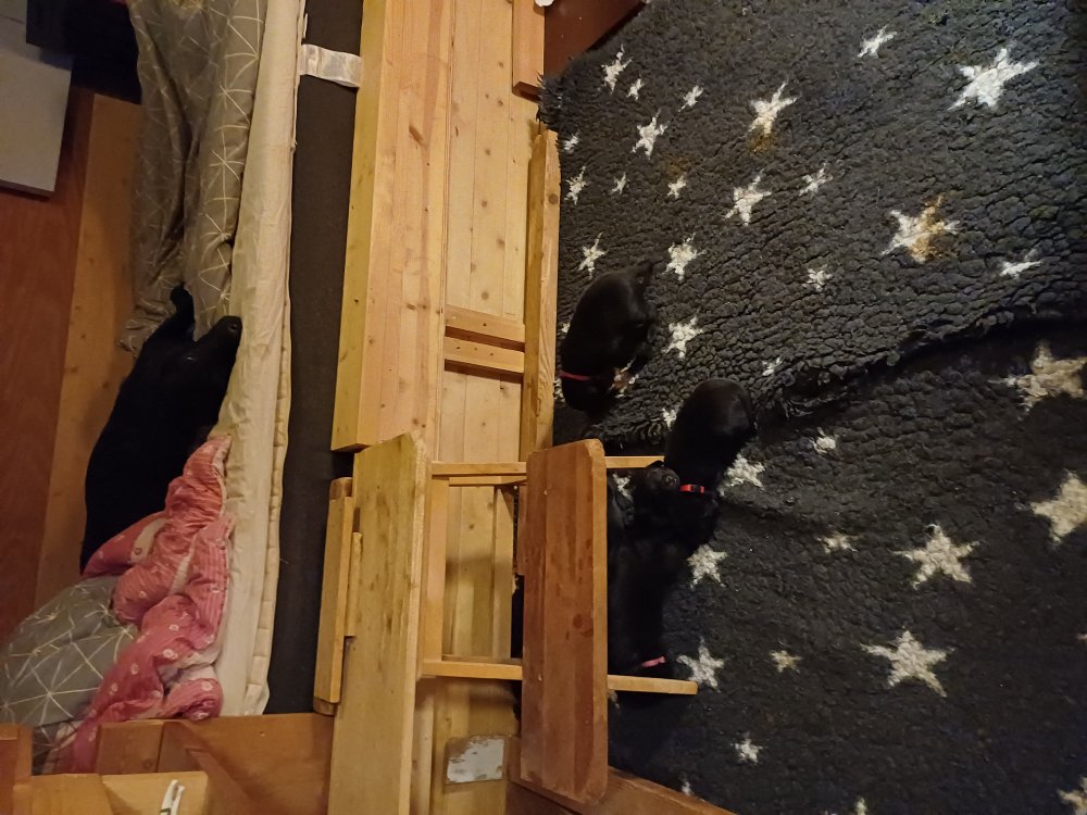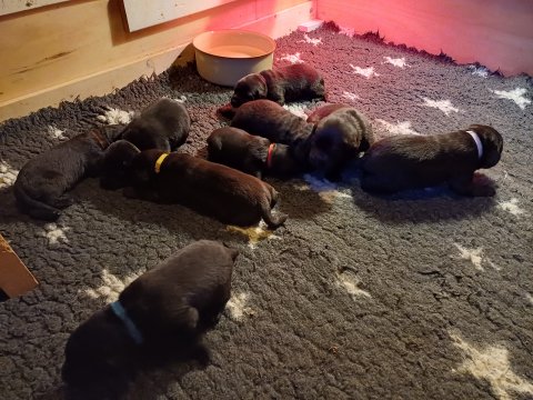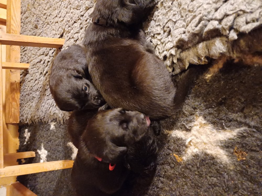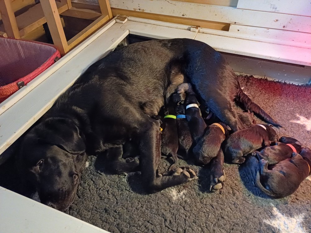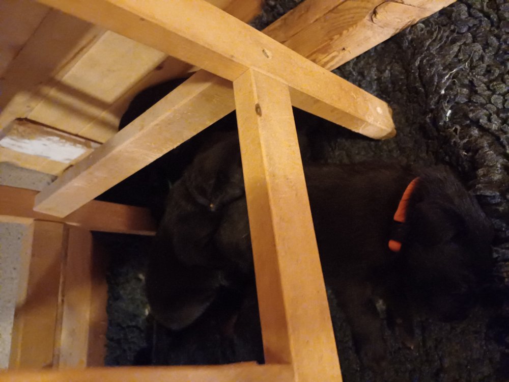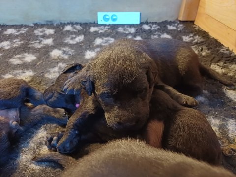 De har fået mere plads, hvalpekassen er kommet ud. Hvalpene er begyndt at bevæge sig lidt mere i en blanding mellem at krybe og forsøge på at bruge benene til at gå. Det er sjovt at se dem prøve at komme rundt i hvalpekassen. Vi er begyndt at kunne ane små sprækker ved øjnene, så det bliver så spændende at se de små øjne når de kommer frem.