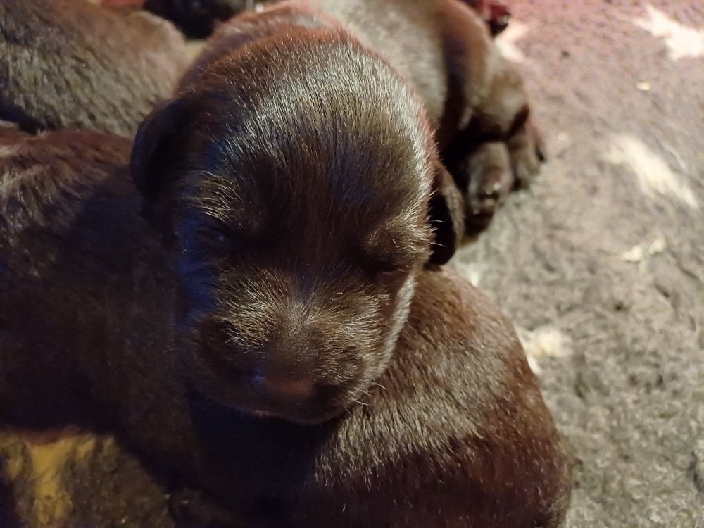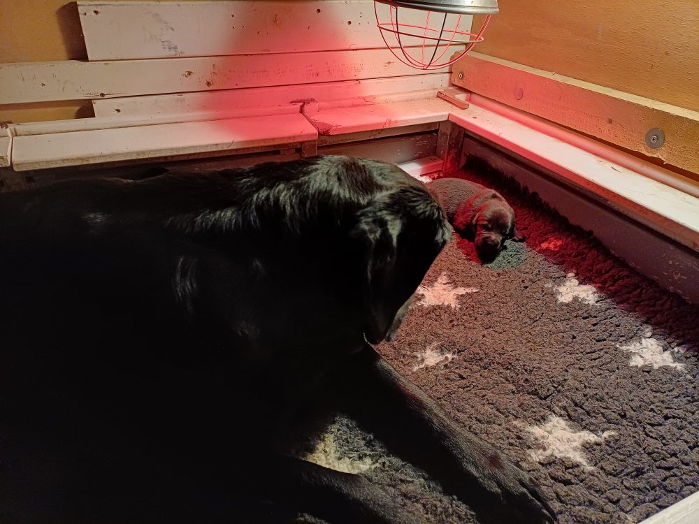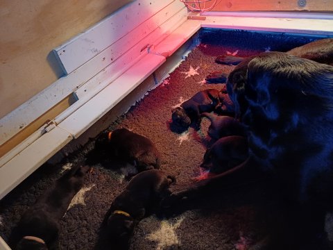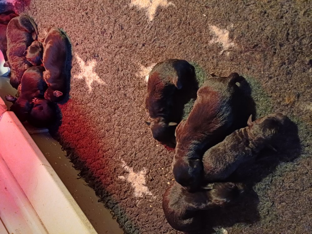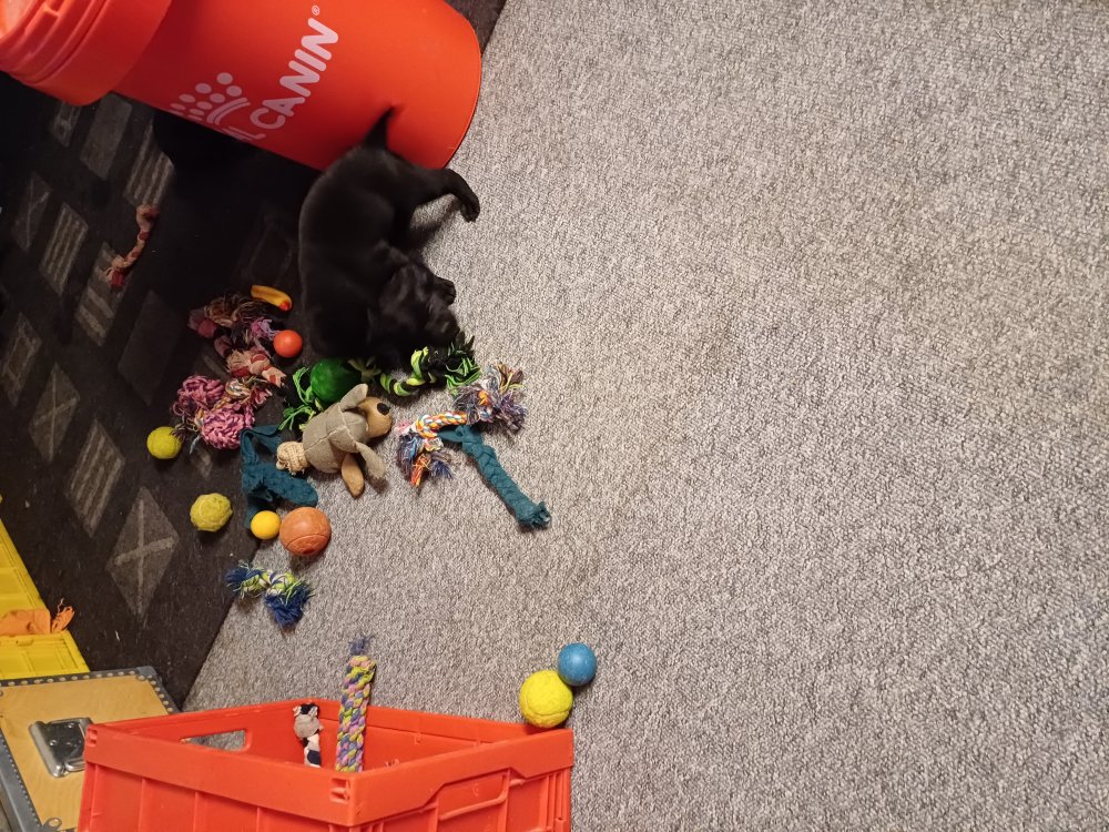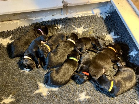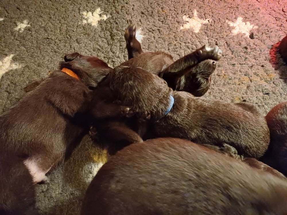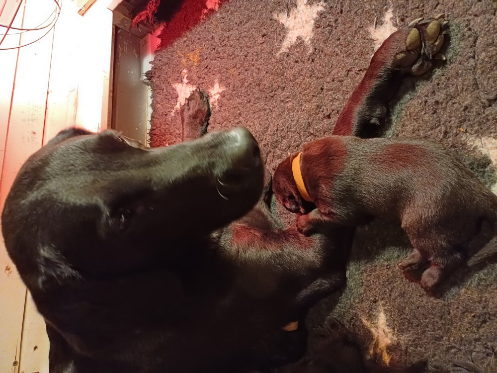 De har fået mere plads, hvalpekassen er kommet ud. Hvalpene er begyndt at bevæge sig lidt mere i en blanding mellem at krybe og forsøge på at bruge benene til at gå. Det er sjovt at se dem prøve at komme rundt i hvalpekassen. Vi er begyndt at kunne ane små sprækker ved øjnene, så det bliver så spændende at se de små øjne når de kommer frem.