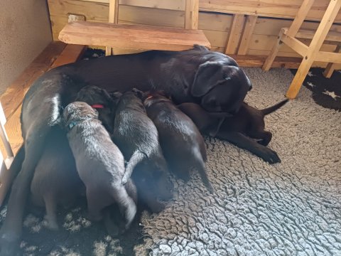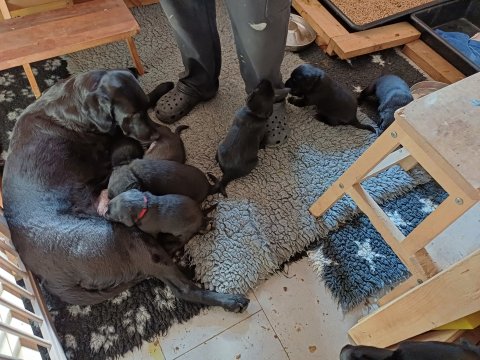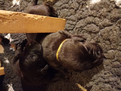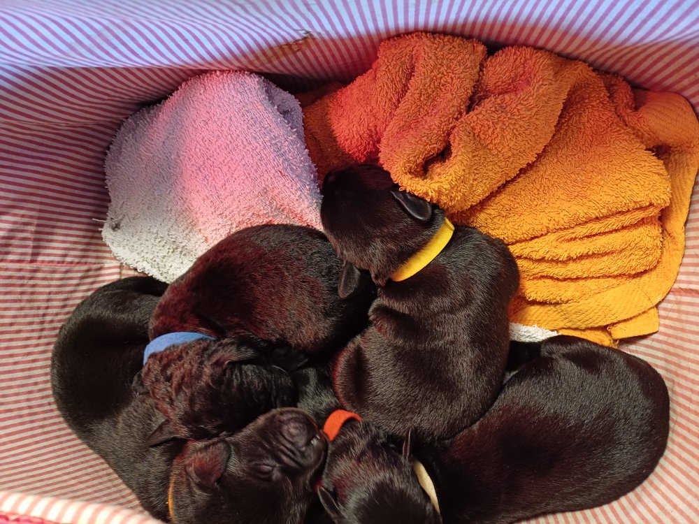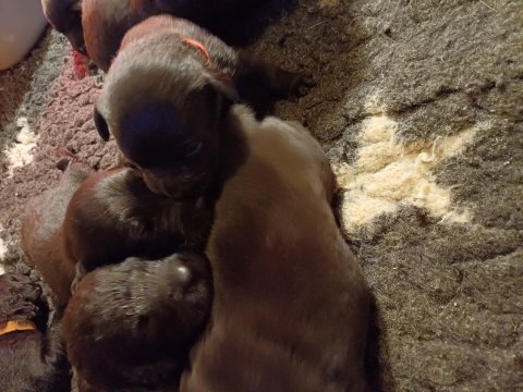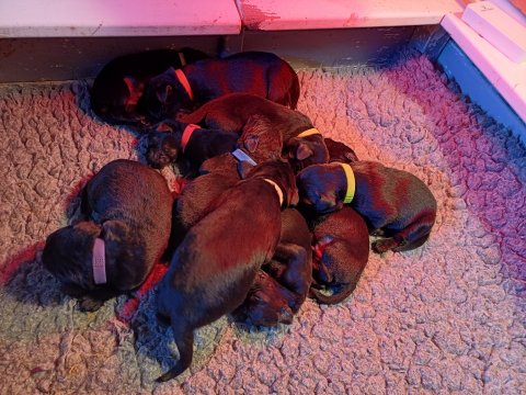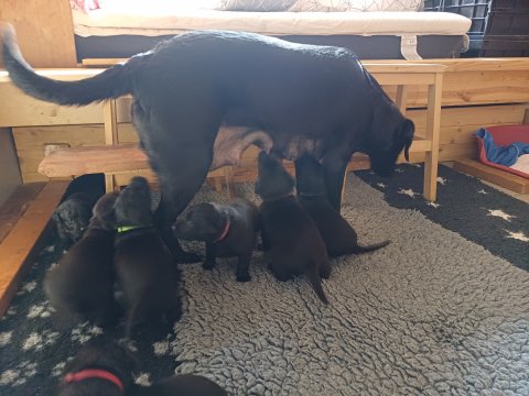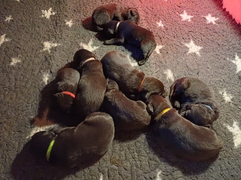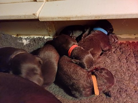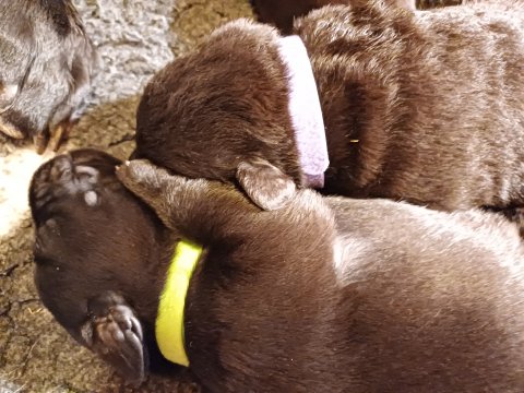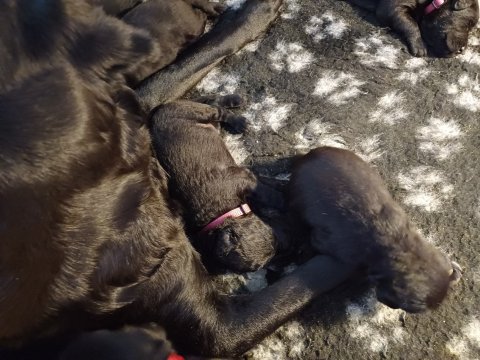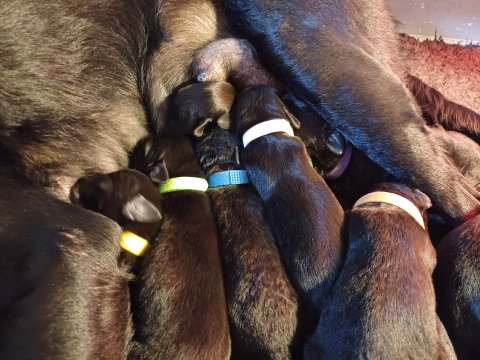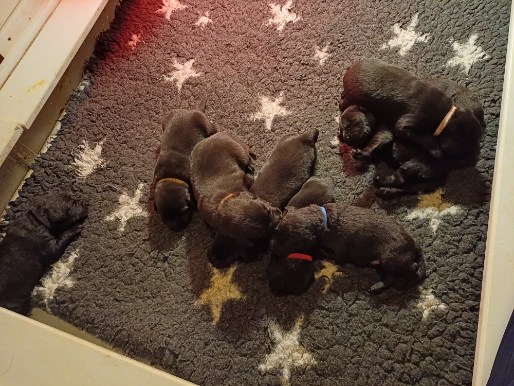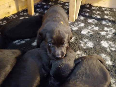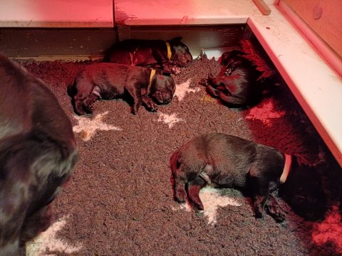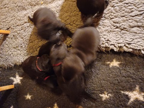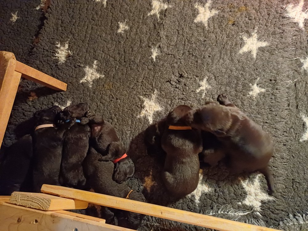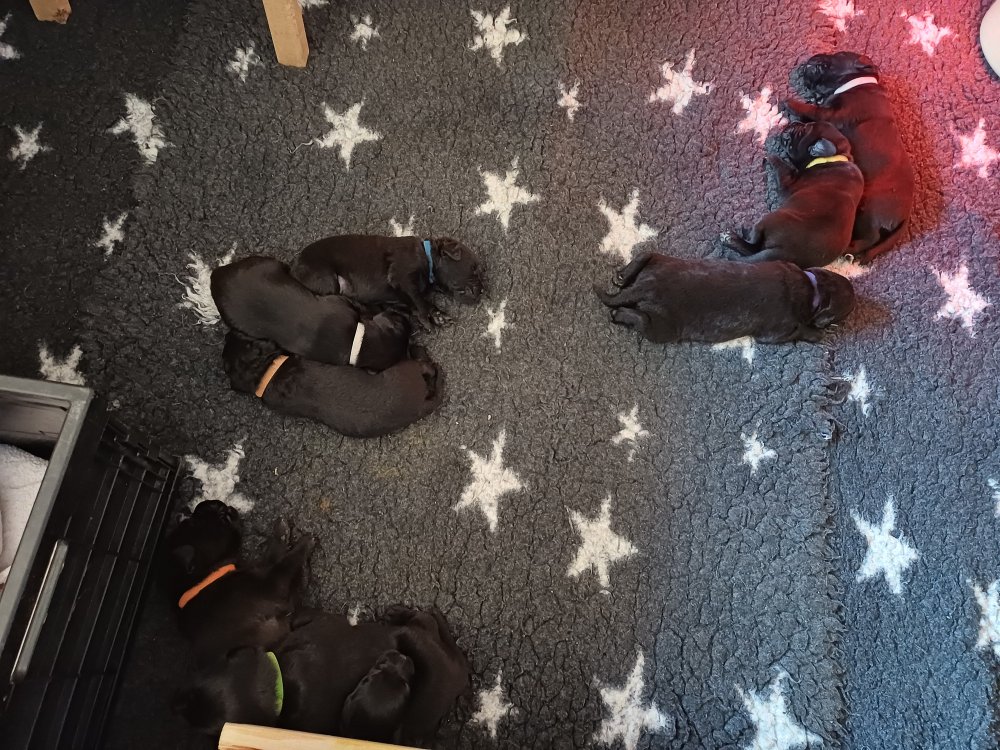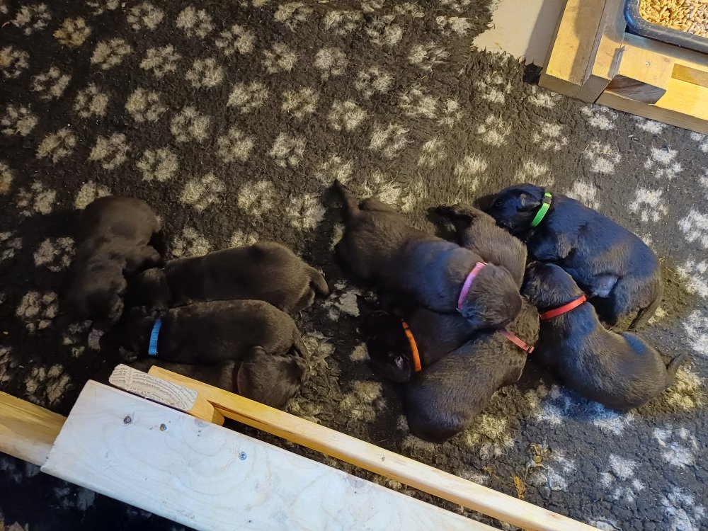 I denne uge er der sket meget med hvalpene. De har fået øjne og bevæger sig rundt i kassen, næsten som rigtige hunde. De har også opdaget de andre, så de er begyndt at "slåse" med hinanden og med deres mor. Vi kan nu begynde at mærke deres små tænder.De er begyndt få opblødt hvalpemad, nået de meget hurtig fandt ud af smager godt, men de er stadig tilhænger af Amy´s mælkebar. I dag søndag har de fået skiftet halsbånd og der er flere med samme farve, da både hunner og hanner har fået samme farve, da vi ikke have flere farve