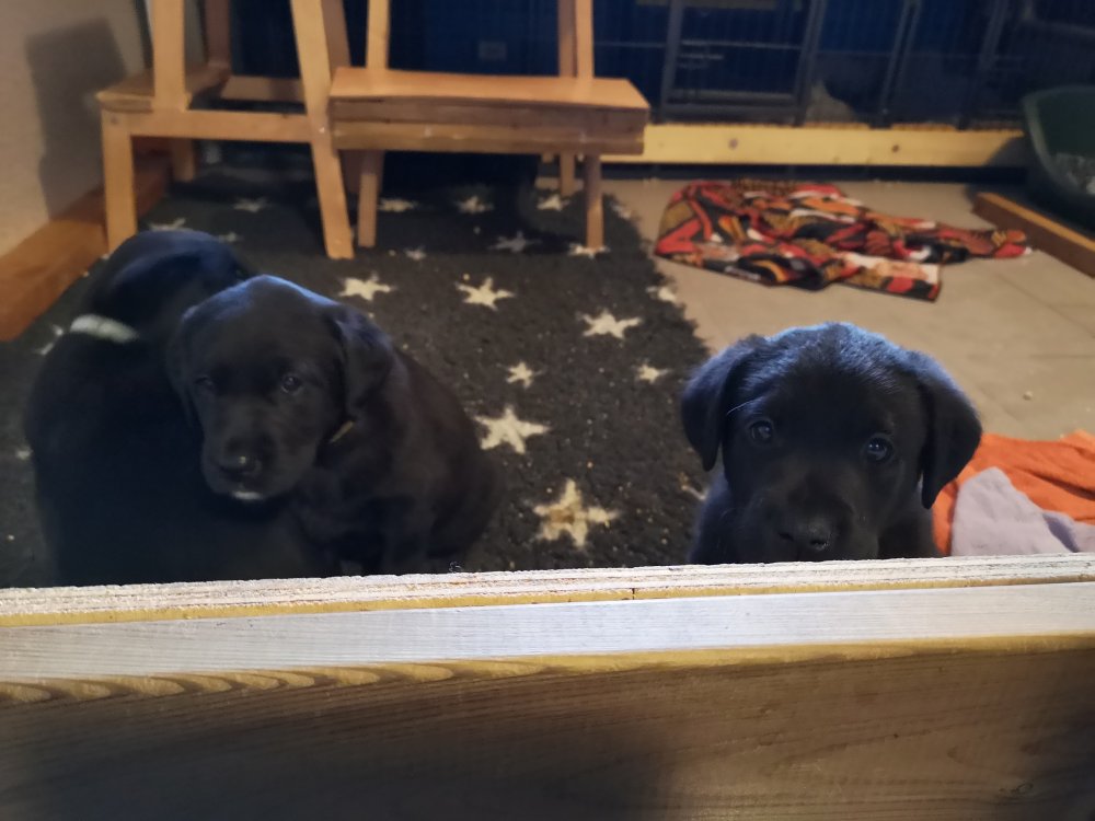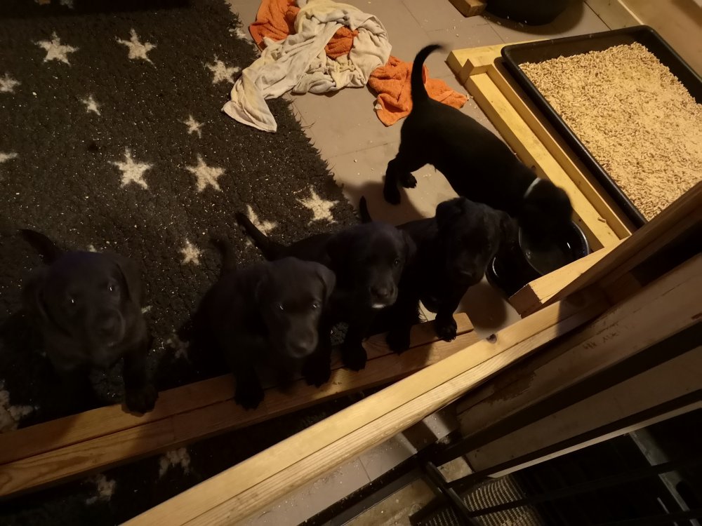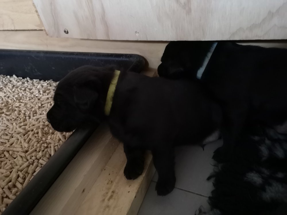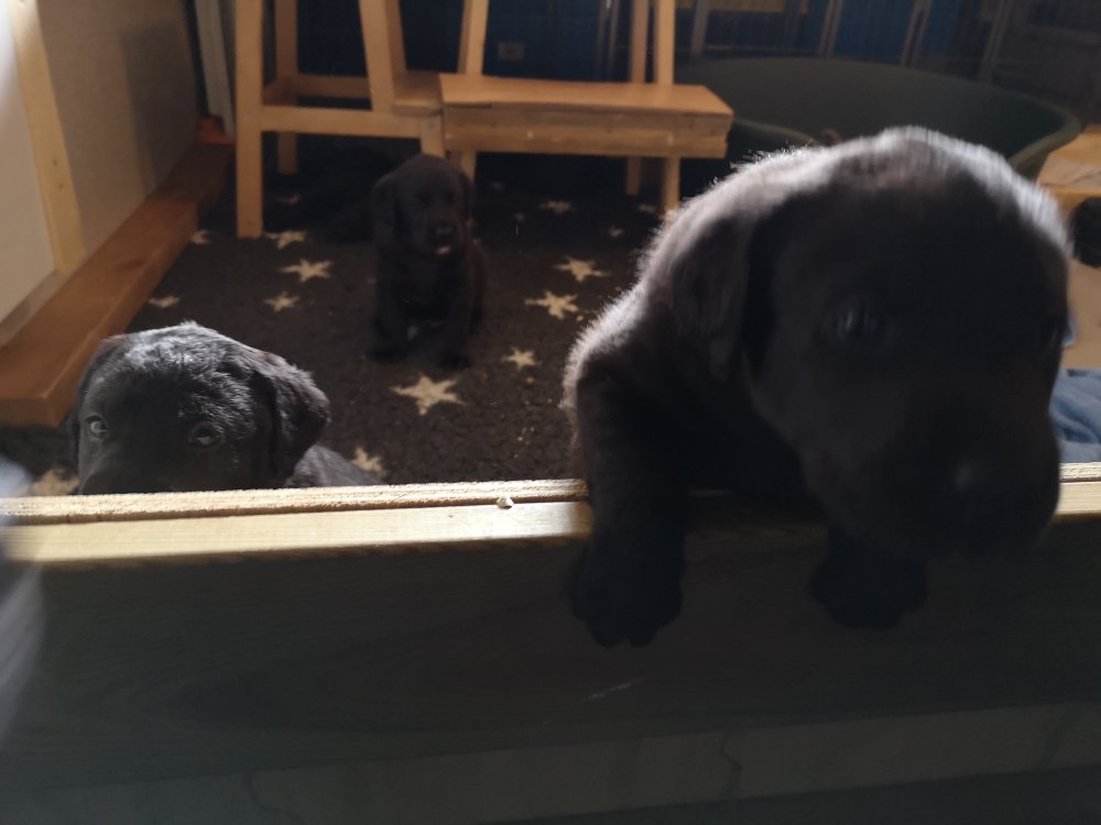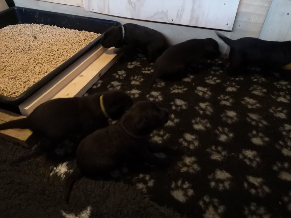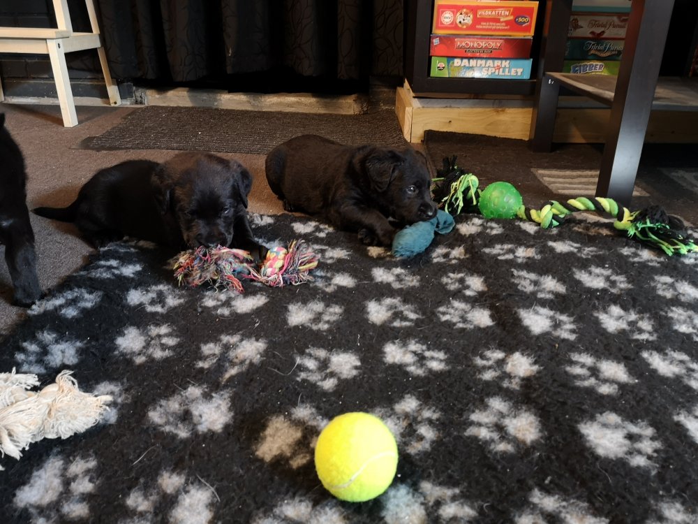 Hvalpene er blevet mere aktive og nysgerrige. Når vi kommer forbi rummet, kigger de op og kommer til lågen hvis vi kalder på dem. Når de andre hunde kommer ned, er de hurtig til at kommer hen til lågen. I hvalperummer er de blevet gode til at bruge deres "hunde-WC" og der er ikke så mange våde pletter mere. De har deres egne opdragelses metoder, der bliver kæmpet, leget og sovet. De elsker når de kommer ud i hvalpebørnehaven og lidt ud i haven, når vejret er til det. De går mere og mere på opdagelse sammen og hver for sig