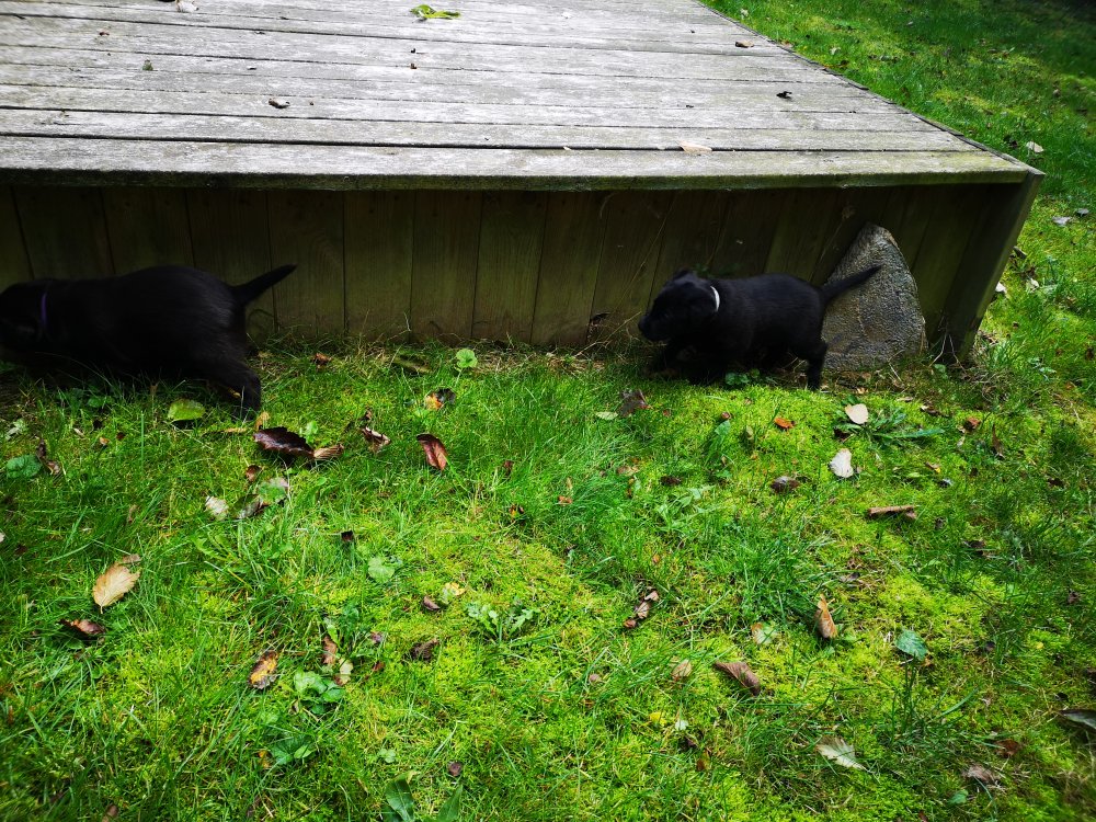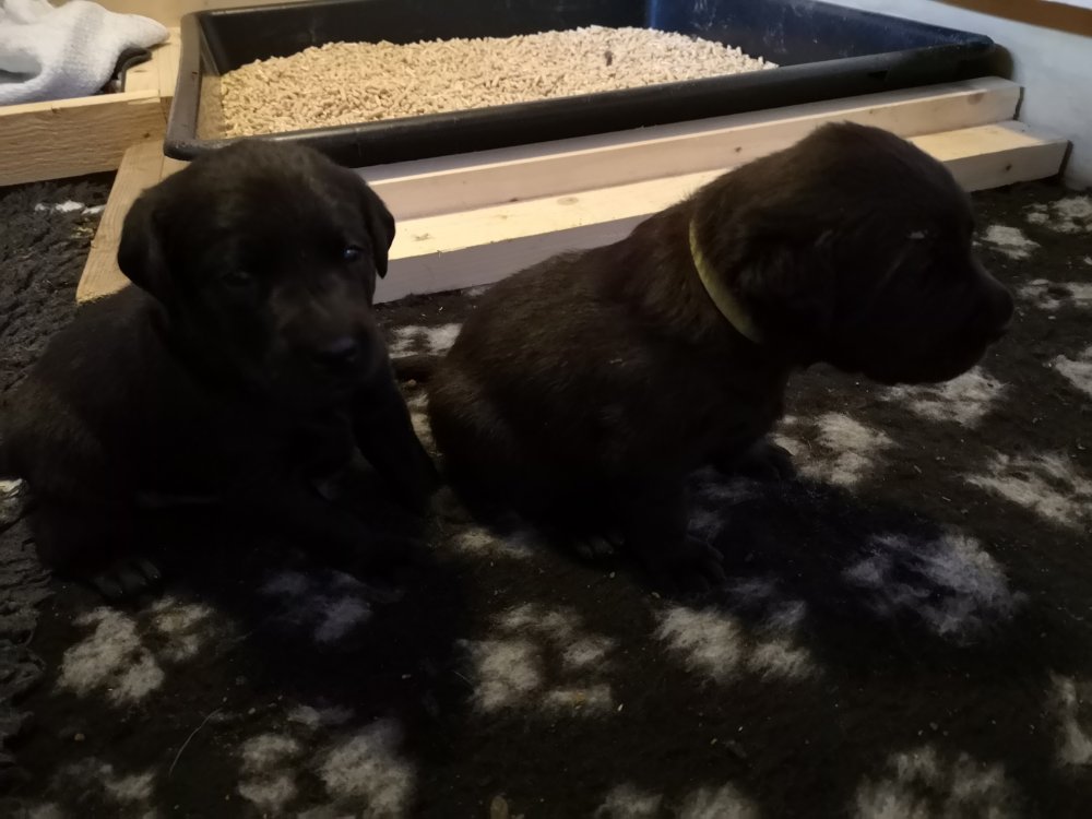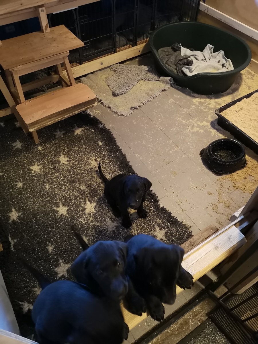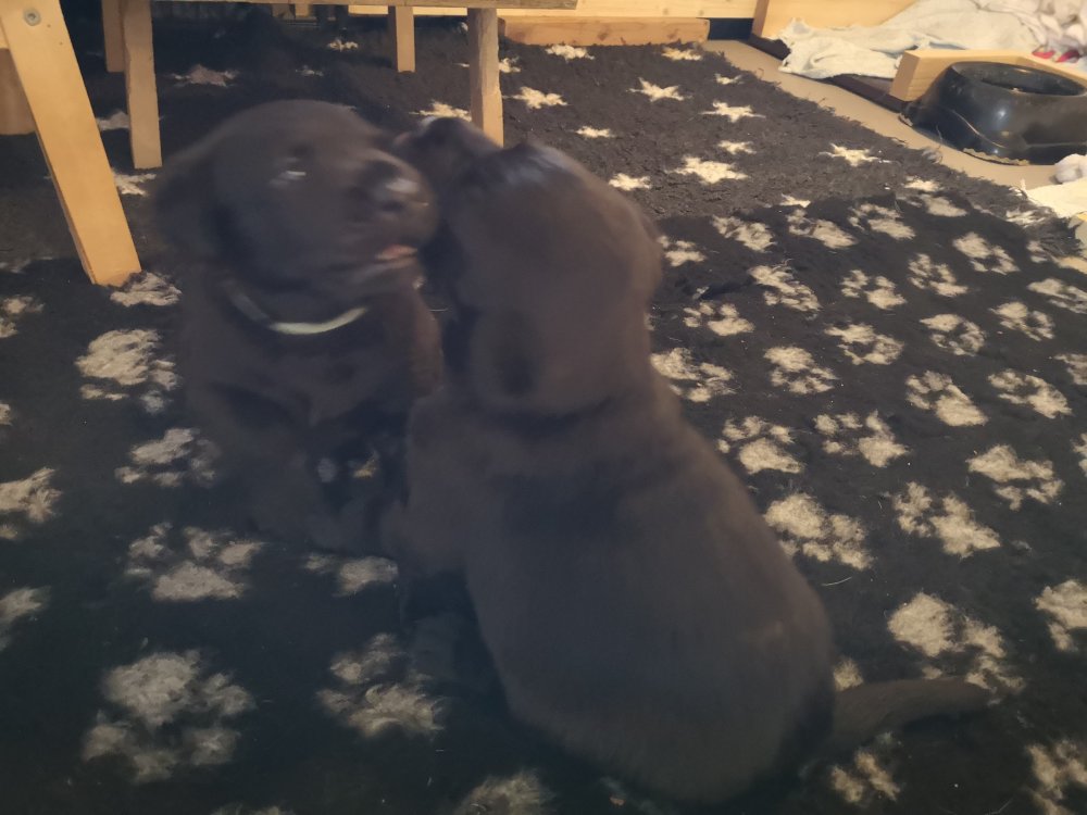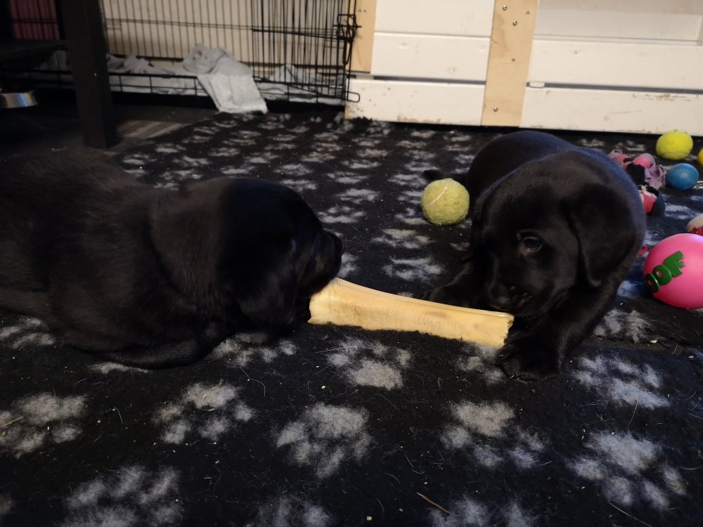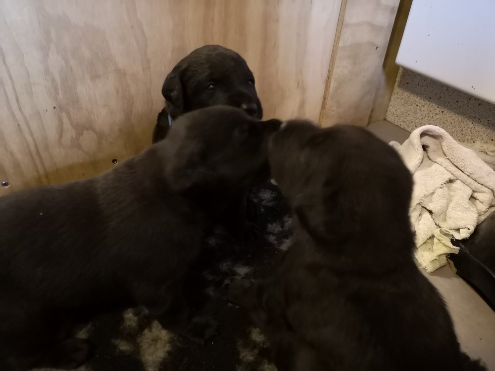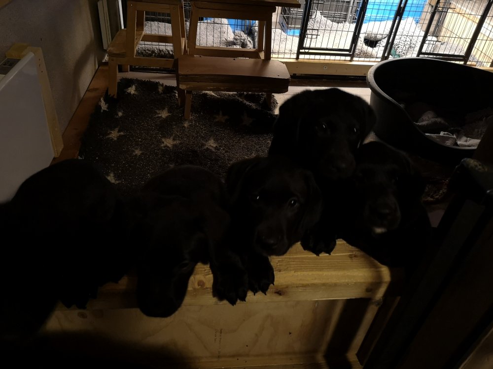 Hvalpene er blevet mere aktive og nysgerrige. Når vi kommer forbi rummet, kigger de op og kommer til lågen hvis vi kalder på dem. Når de andre hunde kommer ned, er de hurtig til at kommer hen til lågen. I hvalperummer er de blevet gode til at bruge deres "hunde-WC" og der er ikke så mange våde pletter mere. De har deres egne opdragelses metoder, der bliver kæmpet, leget og sovet. De elsker når de kommer ud i hvalpebørnehaven og lidt ud i haven, når vejret er til det. De går mere og mere på opdagelse sammen og hver for sig