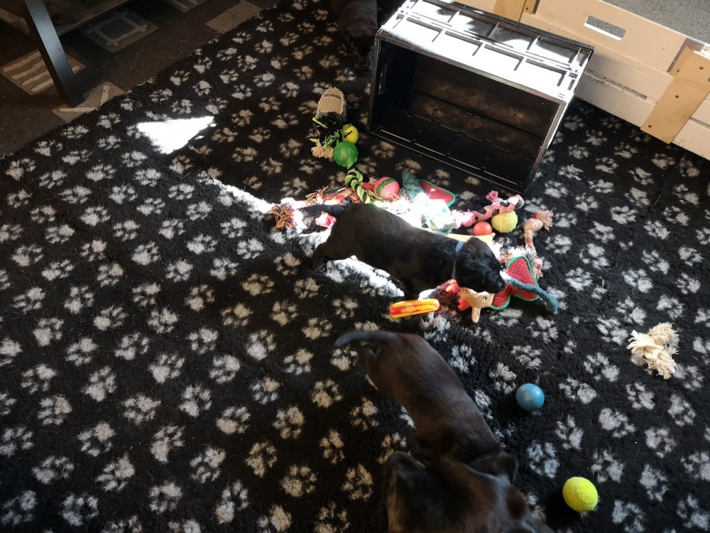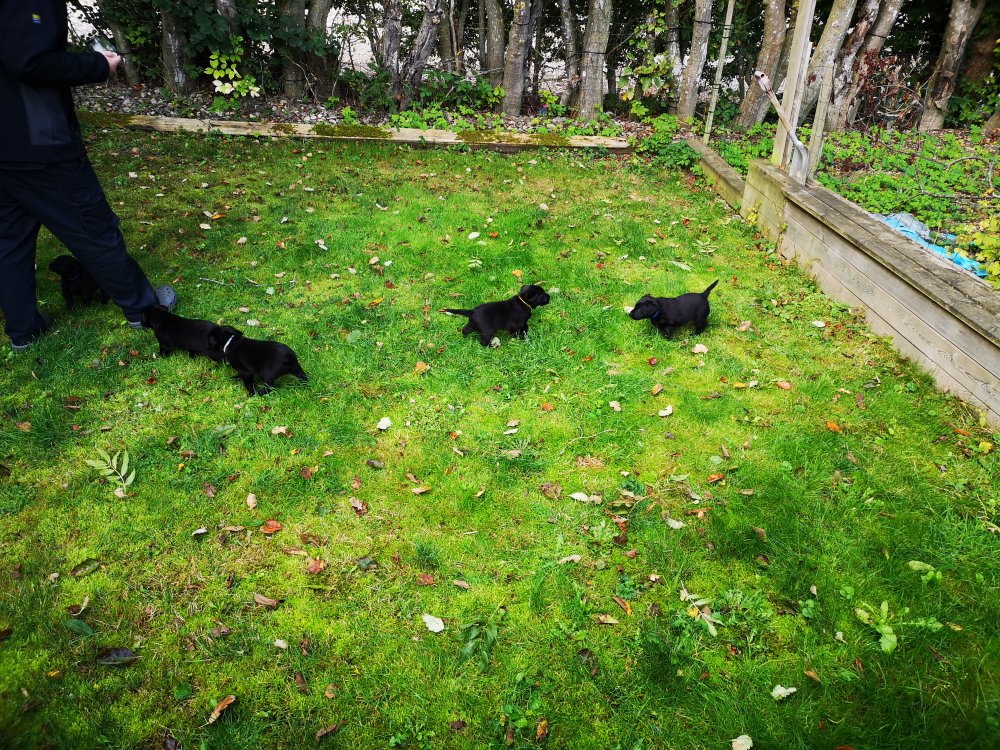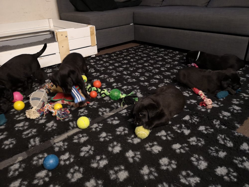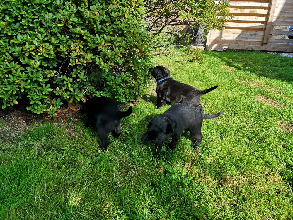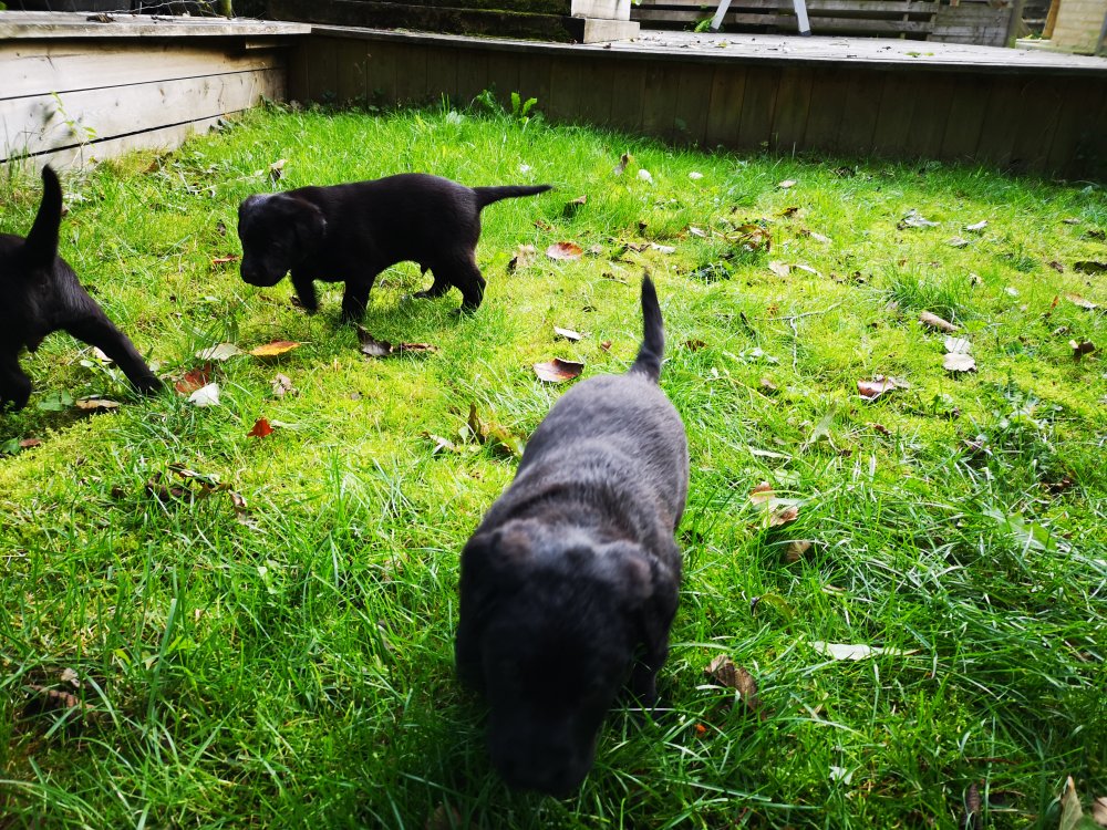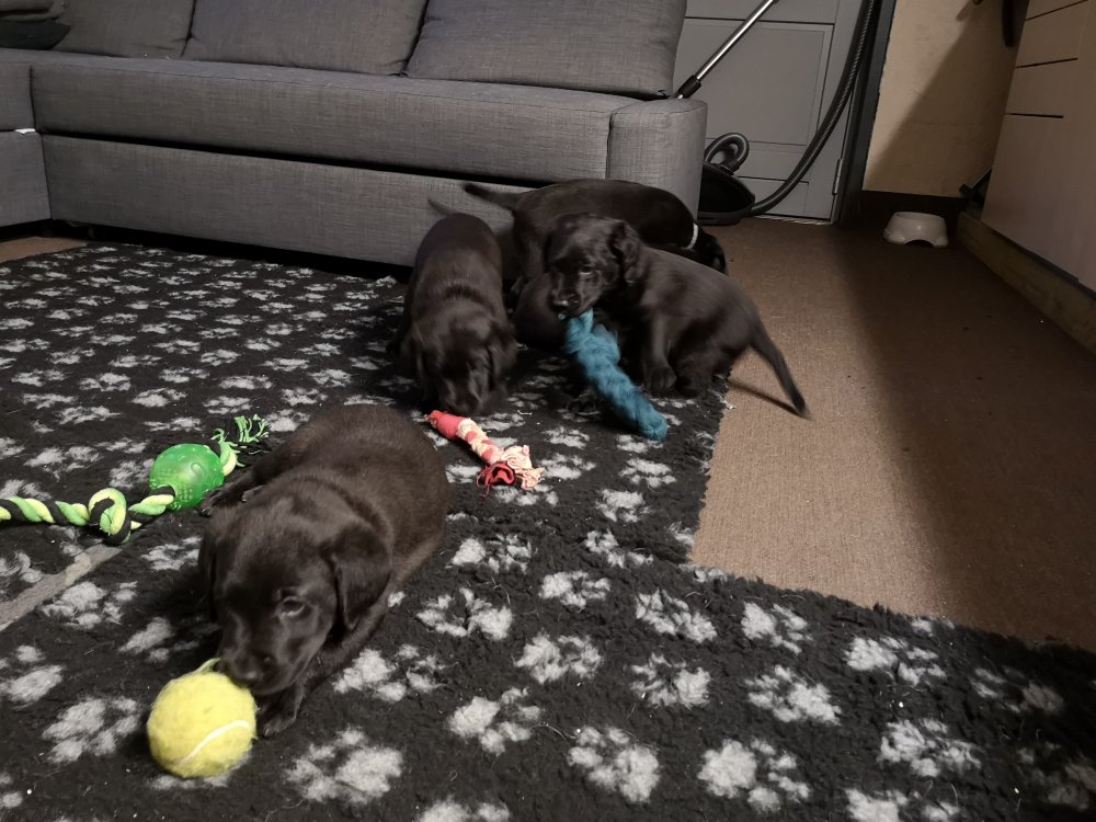 Hvalpene er blevet mere aktive og nysgerrige. Når vi kommer forbi rummet, kigger de op og kommer til lågen hvis vi kalder på dem. Når de andre hunde kommer ned, er de hurtig til at kommer hen til lågen. I hvalperummer er de blevet gode til at bruge deres "hunde-WC" og der er ikke så mange våde pletter mere. De har deres egne opdragelses metoder, der bliver kæmpet, leget og sovet. De elsker når de kommer ud i hvalpebørnehaven og lidt ud i haven, når vejret er til det. De går mere og mere på opdagelse sammen og hver for sig