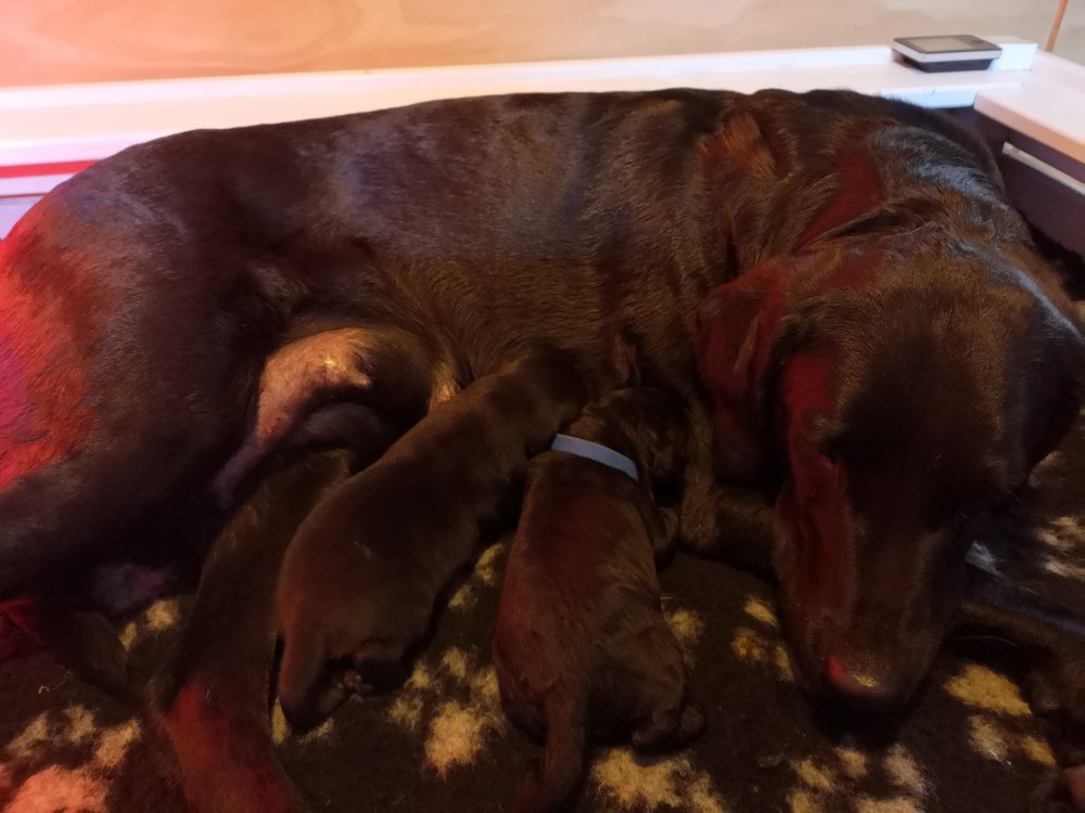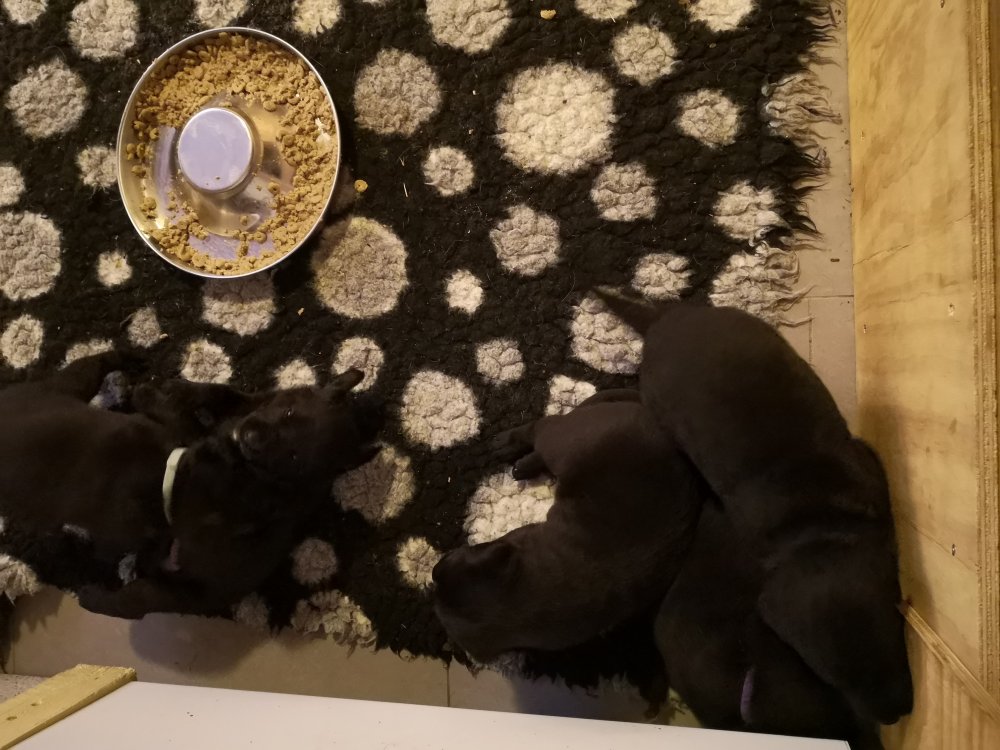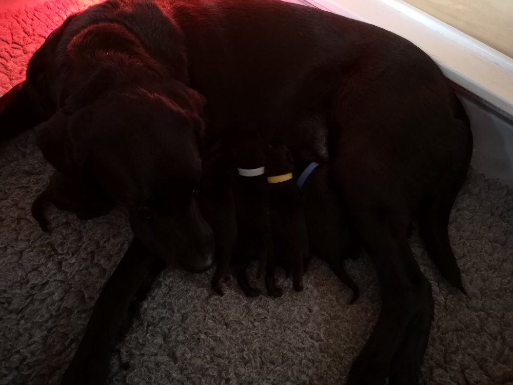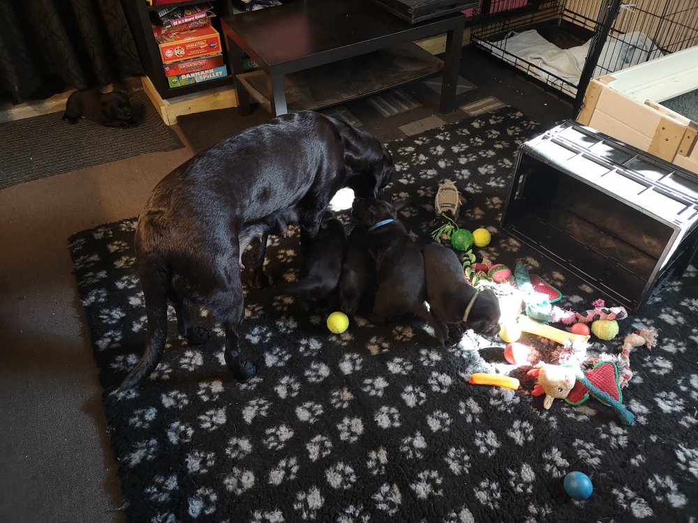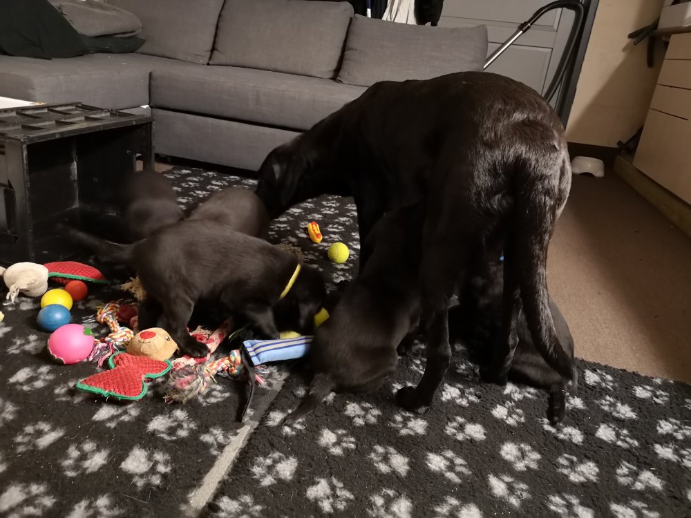 Hvalpene får masse af mælk, så Amy kan godt forlade dem og være lidt sammen med resten af familie, men der går ikke i ret lang tid så hun ligger hun ved dem igen :-)
