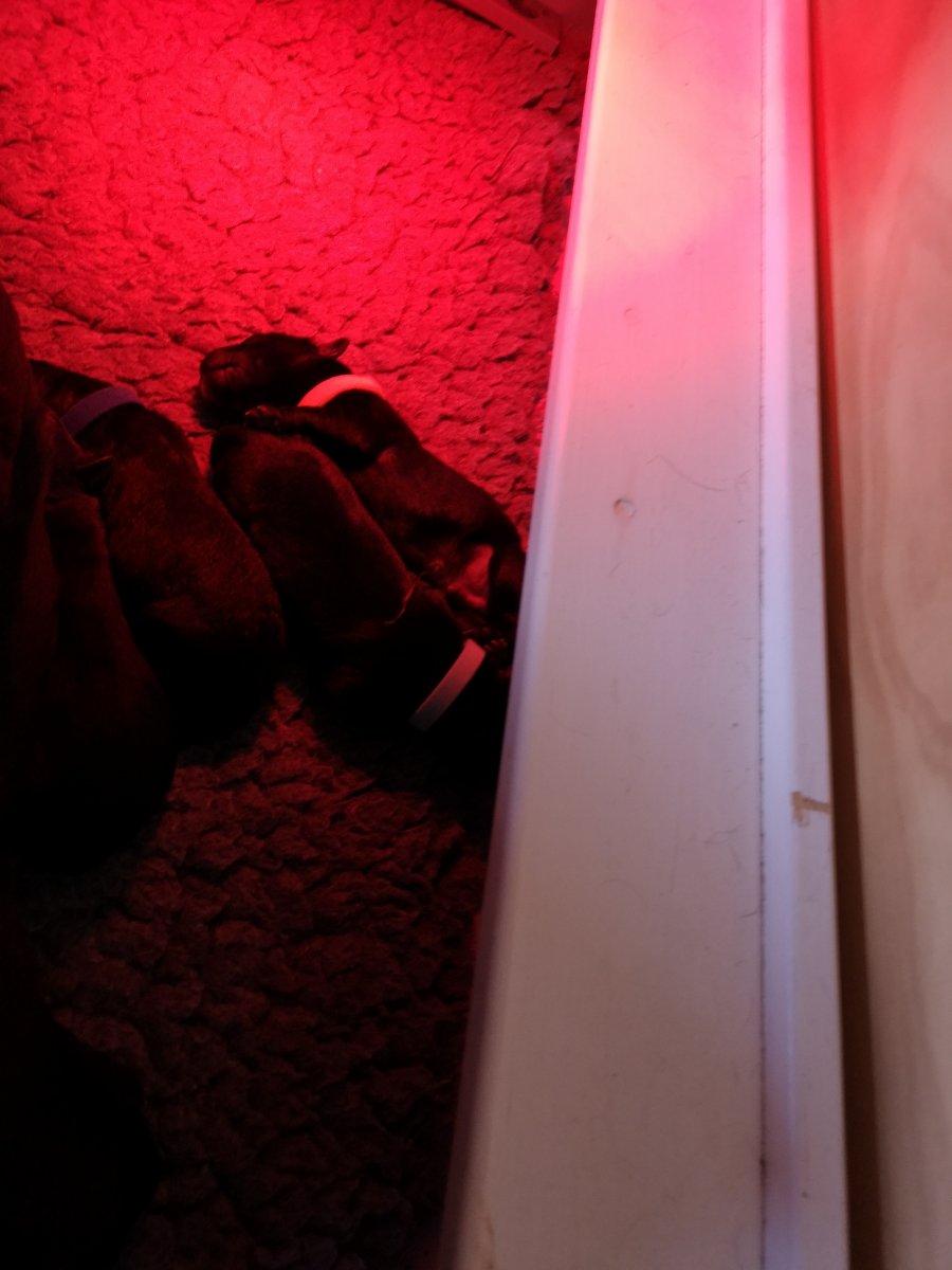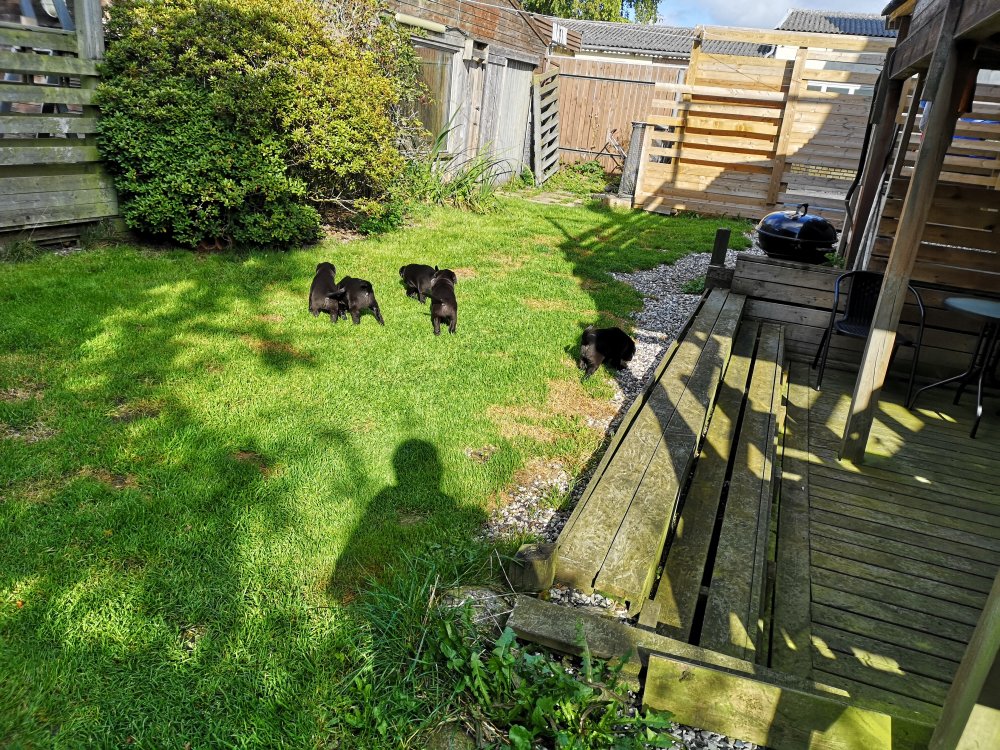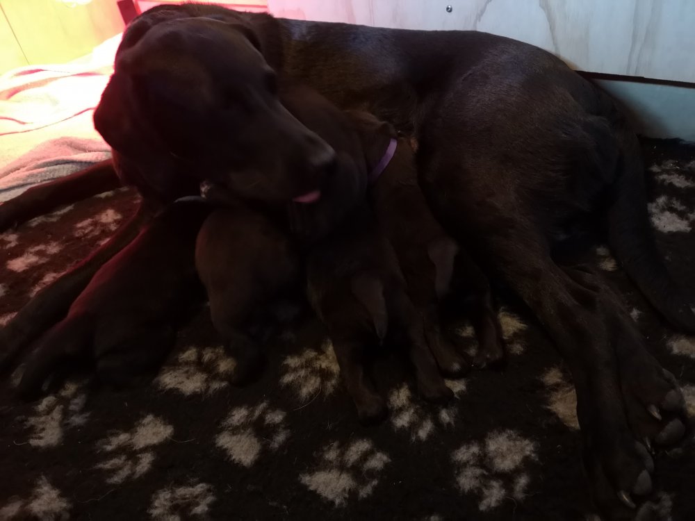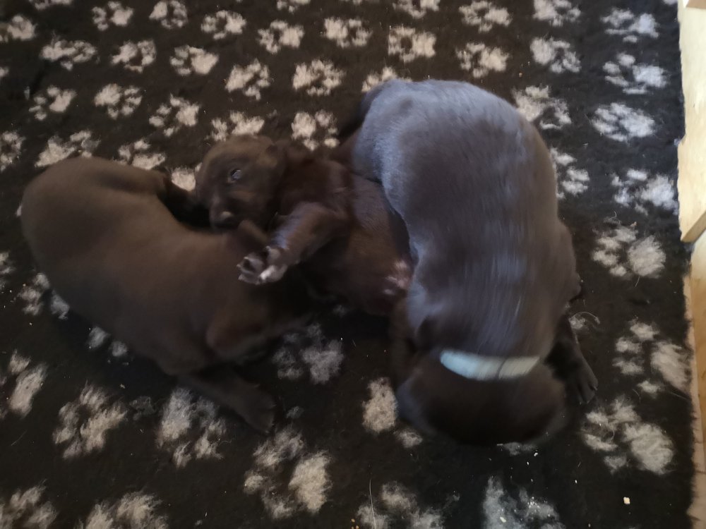Hvalpene får masse af mælk, så Amy kan godt forlade dem og være lidt sammen med resten af familie, men der går ikke i ret lang tid så hun ligger hun ved dem igen :-)