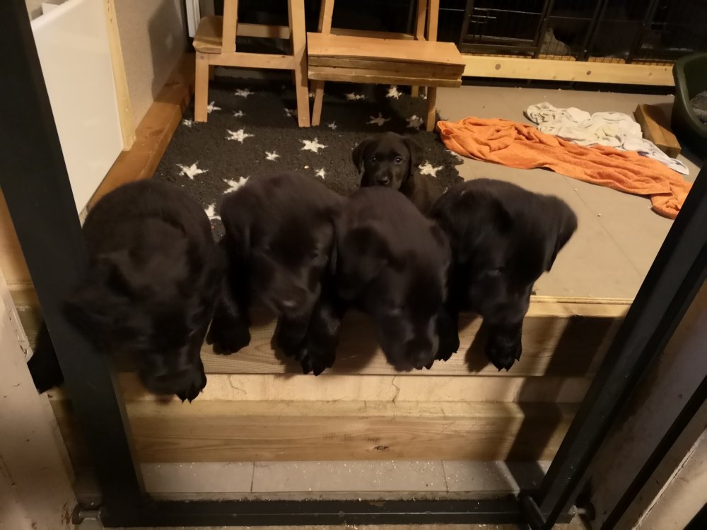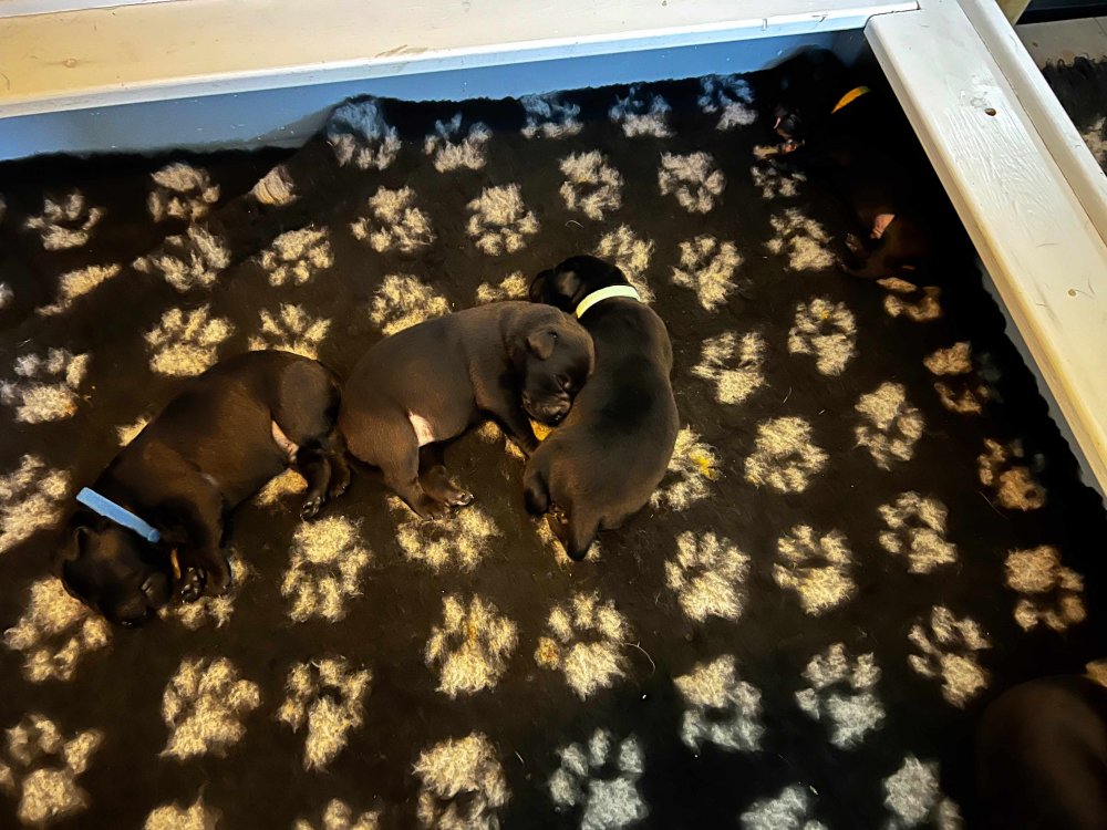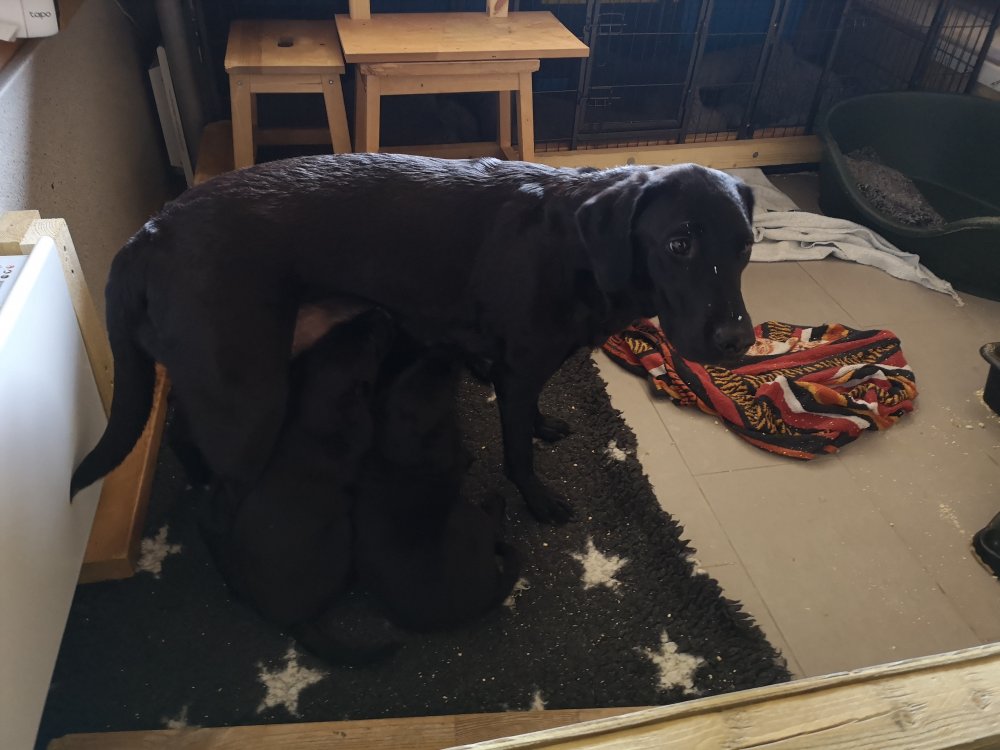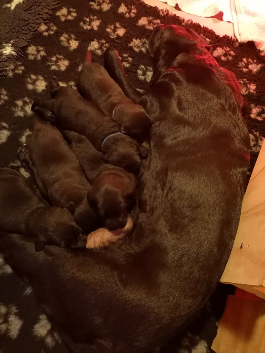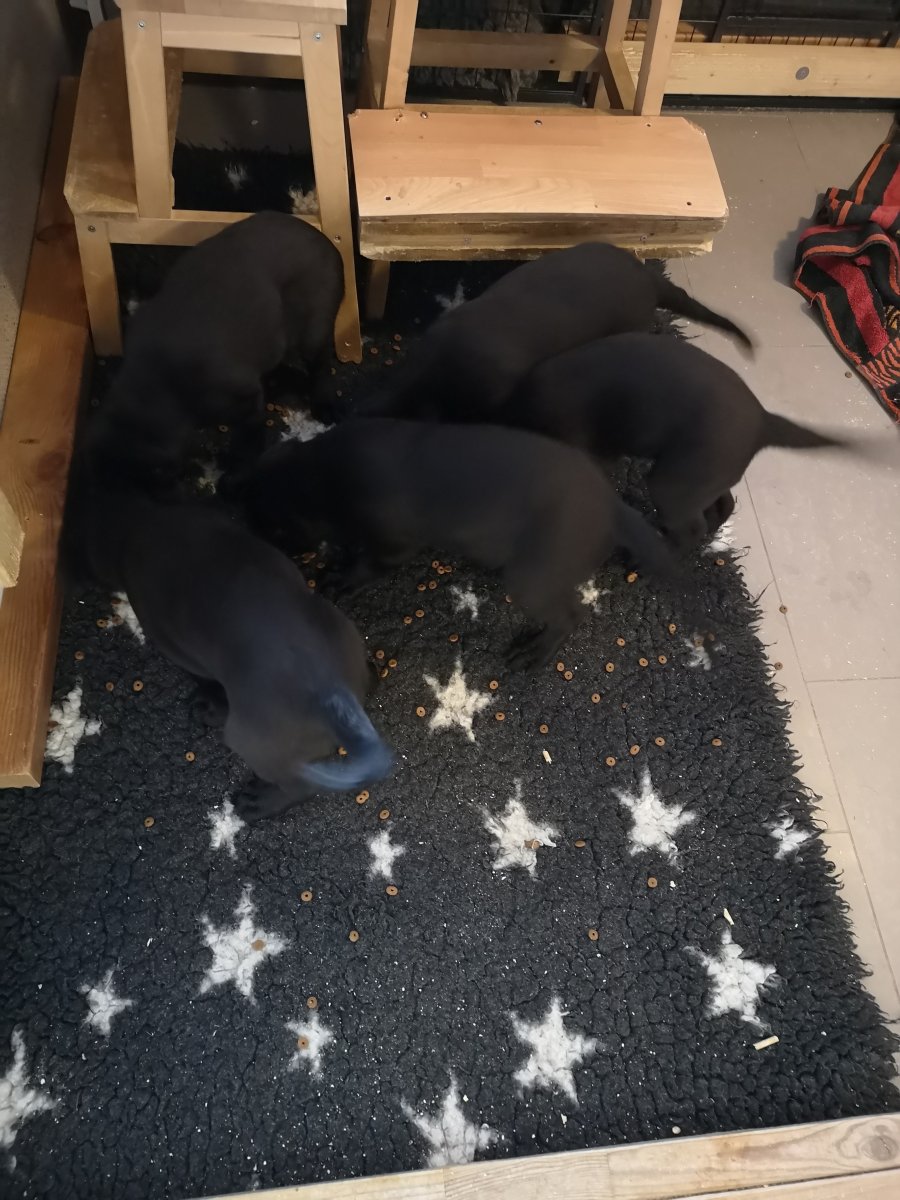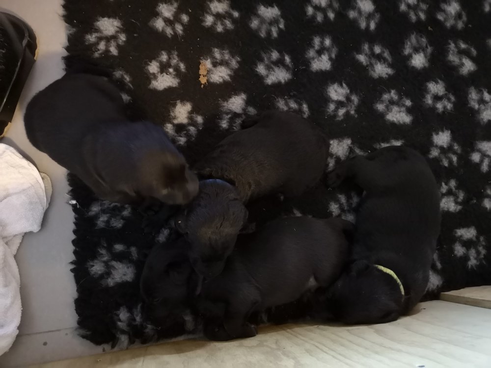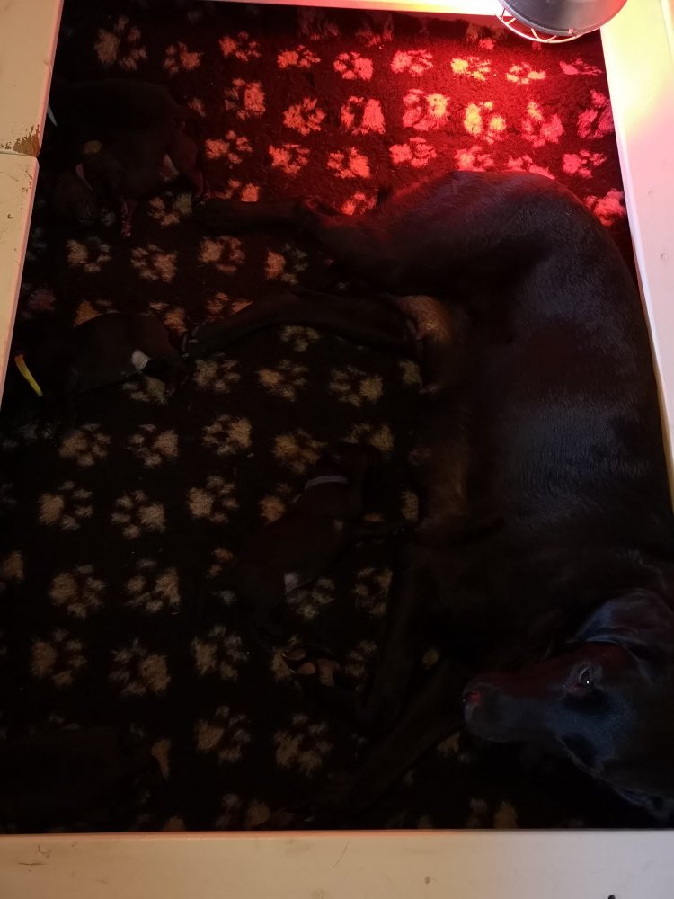 Amy har født 5 store sorte hvalpe, 1 tæve og 4 hanner.