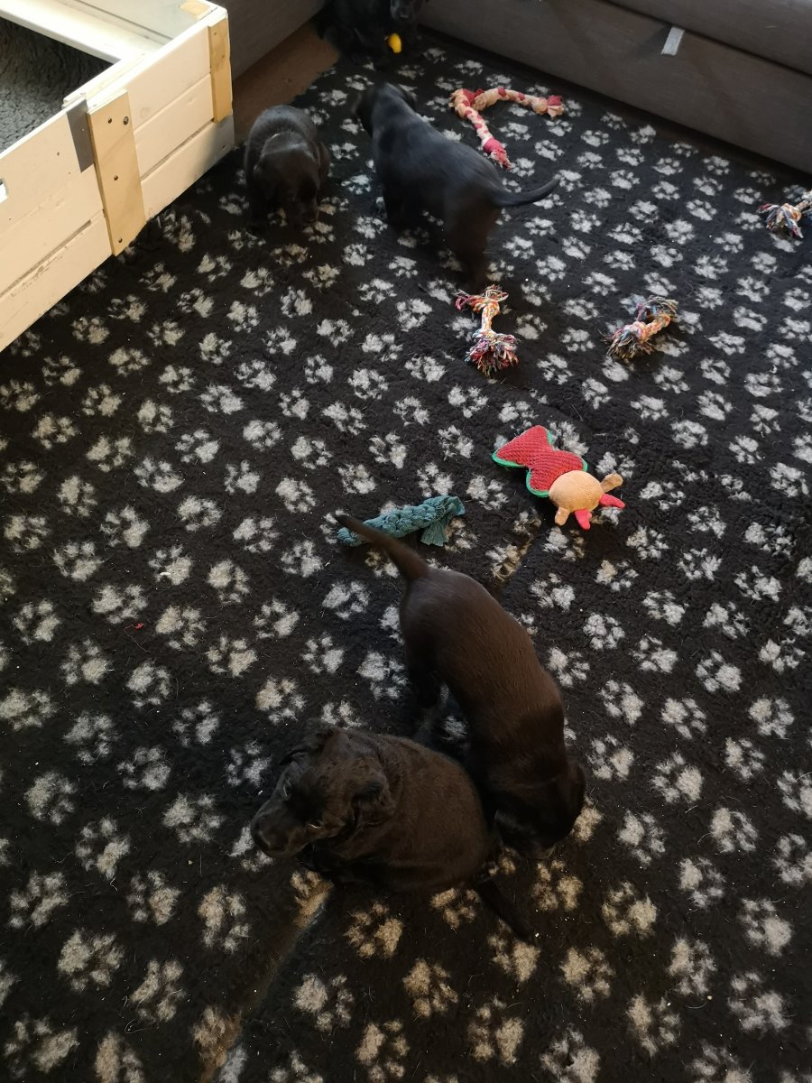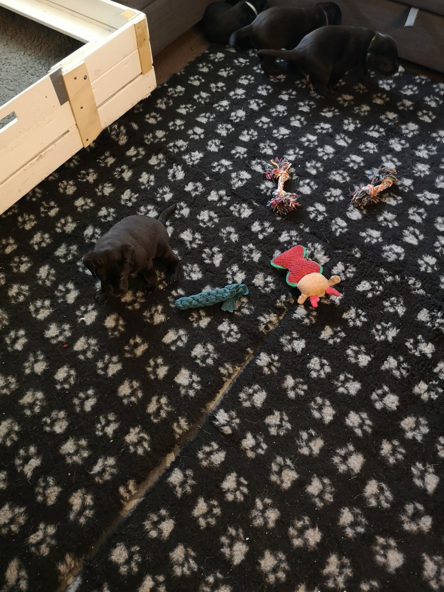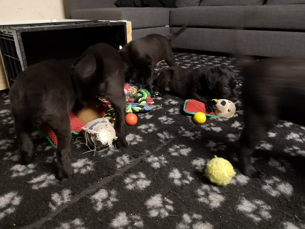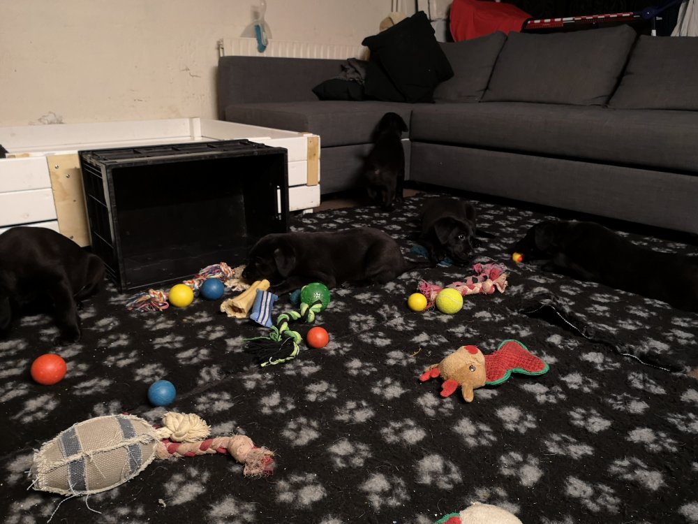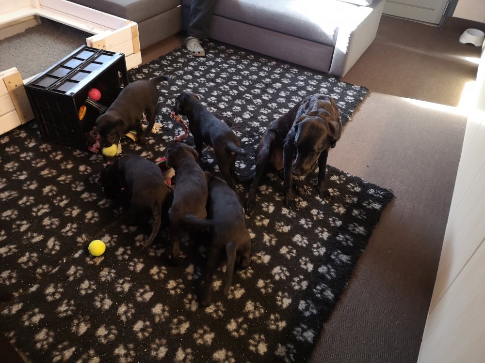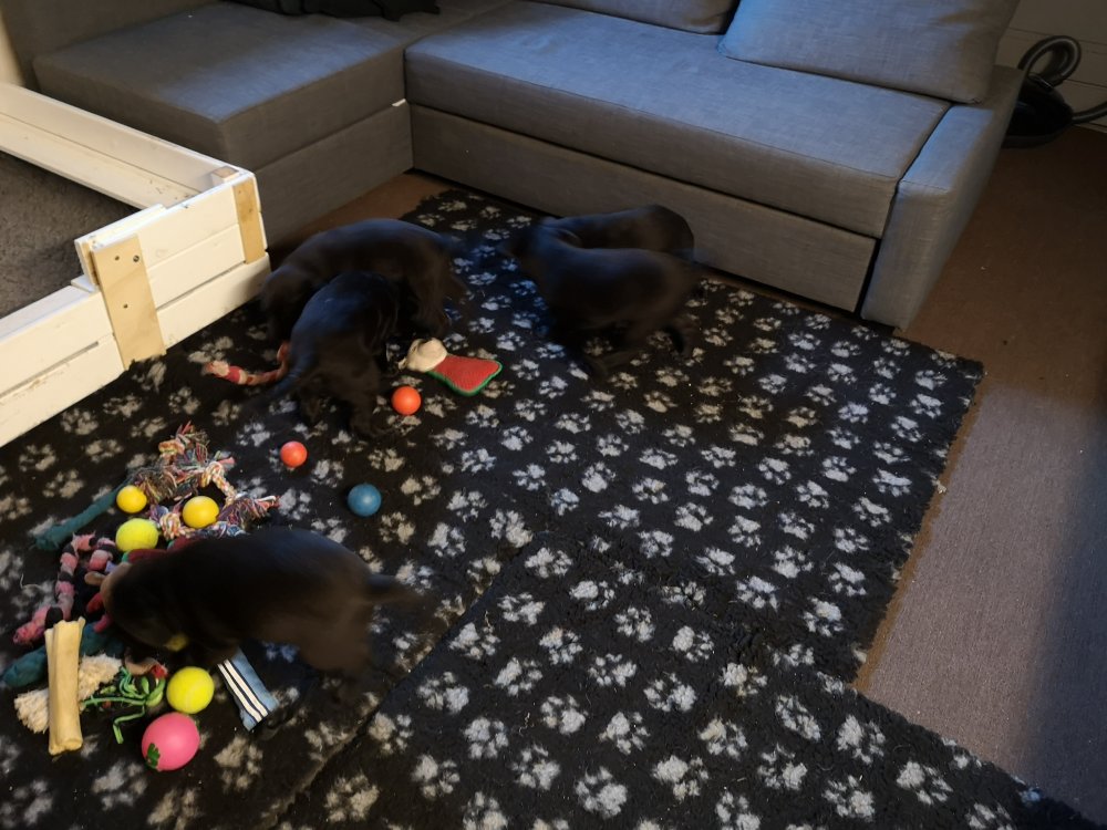 Det er den sidste uge i hvalpekassen, hvor der har været rigtig gang i rummet der er blevet tumlet, leget m.m. Flokken hygger sig i rummet, det store hit er at få savsmuld og vand ud på gulvet.Hvalpene vil rigtig gerne udenfor rummet og prøve nye grænser af.. Når vi kommer ind rummet er der med det samme og vil meget gerne snakkes med