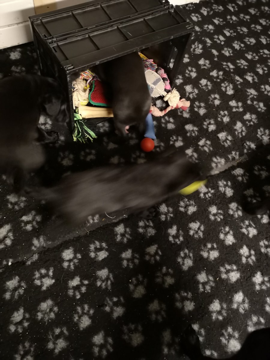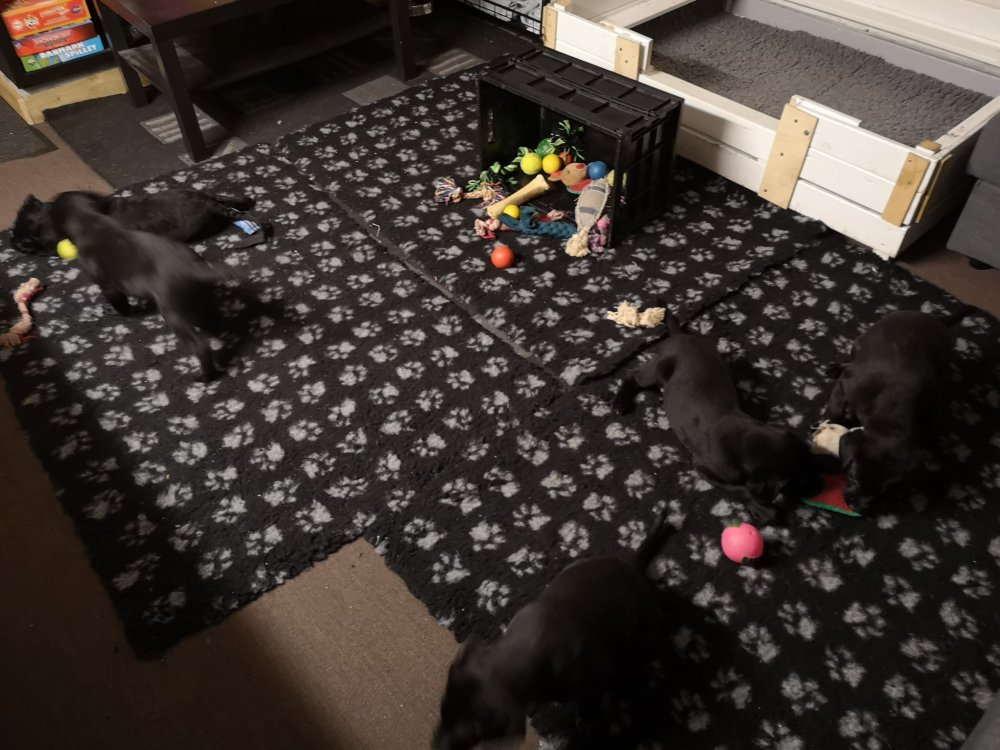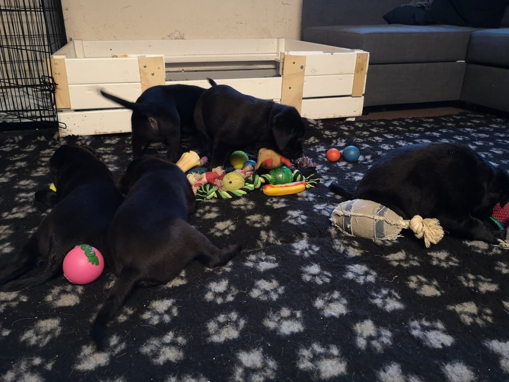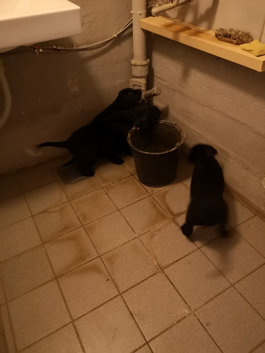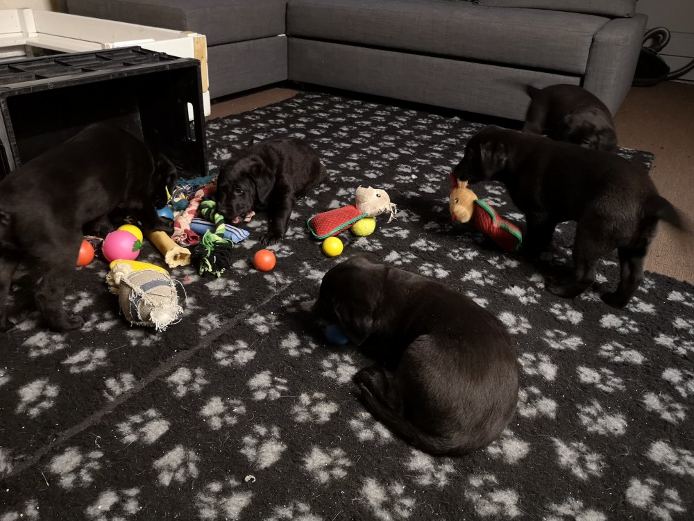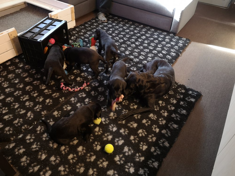 Det er den sidste uge i hvalpekassen, hvor der har været rigtig gang i rummet der er blevet tumlet, leget m.m. Flokken hygger sig i rummet, det store hit er at få savsmuld og vand ud på gulvet.Hvalpene vil rigtig gerne udenfor rummet og prøve nye grænser af.. Når vi kommer ind rummet er der med det samme og vil meget gerne snakkes med
