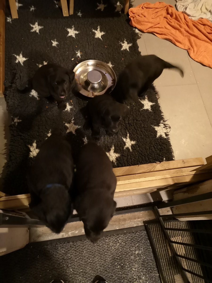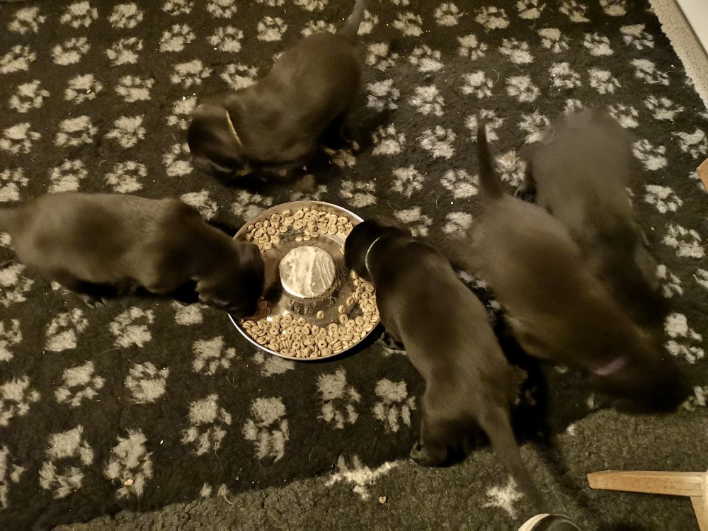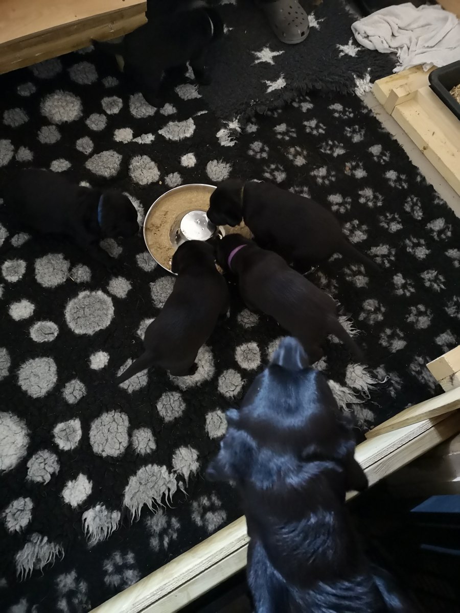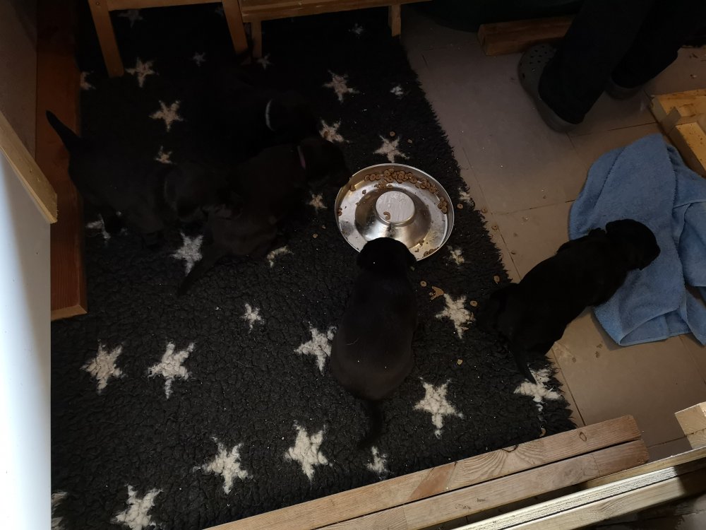 De har også været uden for rummet og i "hvalpebørnehave". De synes det var lidt spænde med nye omgivelser. De er nysgeri og vil undersøge nye ting især vores snørrebånd. Hvalpene får nu fast føde,opblødt hvalpefoder, og de er klar over at når der bliver fløjet kommer mad, så kommer de hurtíg hen til madskålen og bagefter er får mælk fra Amy´s mælkebar. Hvalpene har fået små fine hvalpetænder, så det er ikke altid rart at være Amy de bider sig fast, men hun nyder at ligge sammen med hendes hvalpe.