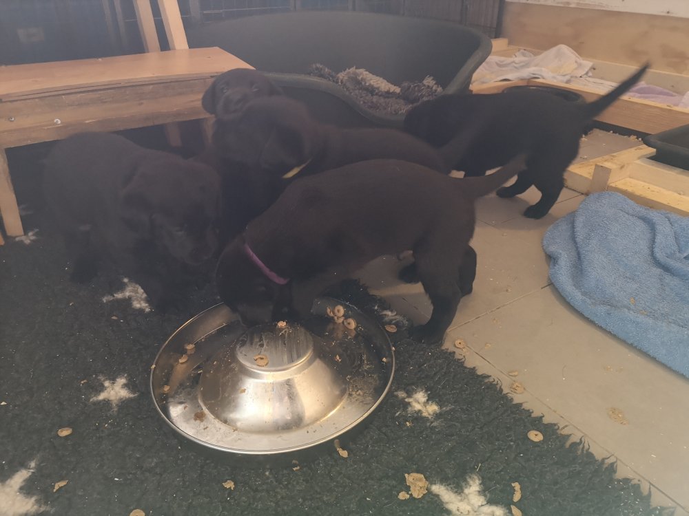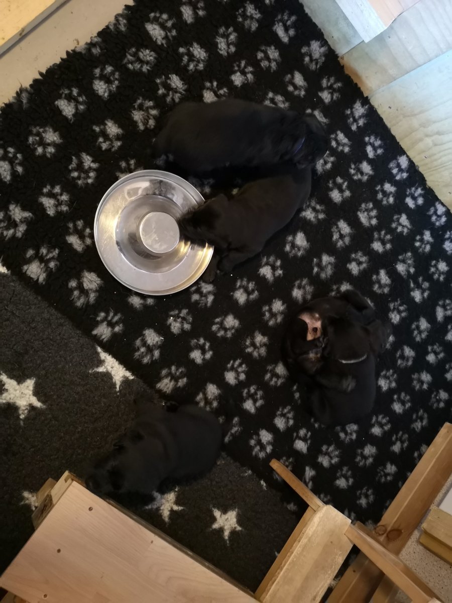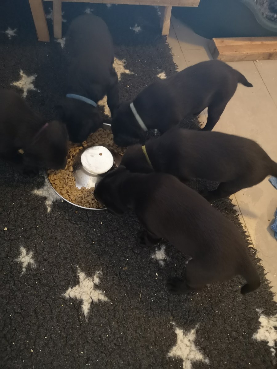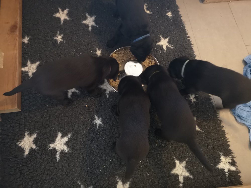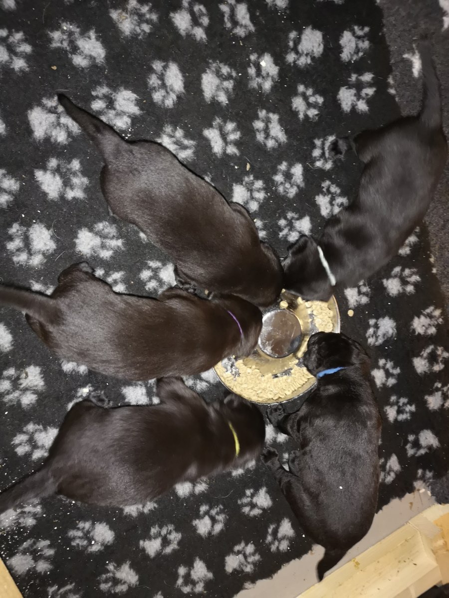 De har også været uden for rummet og i "hvalpebørnehave". De synes det var lidt spænde med nye omgivelser. De er nysgeri og vil undersøge nye ting især vores snørrebånd. Hvalpene får nu fast føde,opblødt hvalpefoder, og de er klar over at når der bliver fløjet kommer mad, så kommer de hurtíg hen til madskålen og bagefter er får mælk fra Amy´s mælkebar. Hvalpene har fået små fine hvalpetænder, så det er ikke altid rart at være Amy de bider sig fast, men hun nyder at ligge sammen med hendes hvalpe.