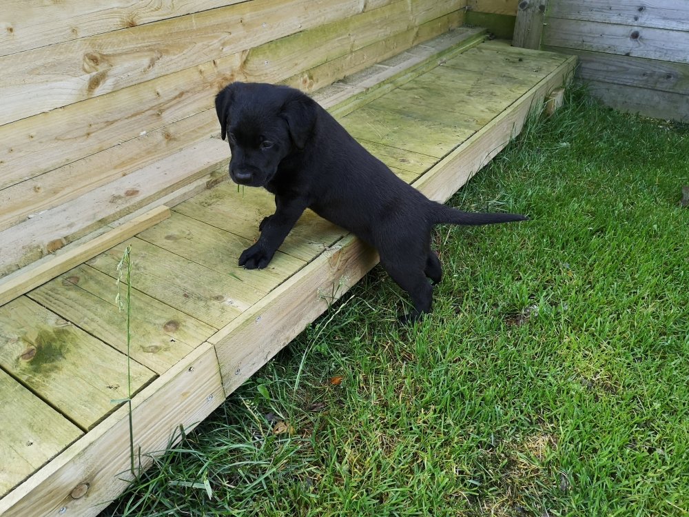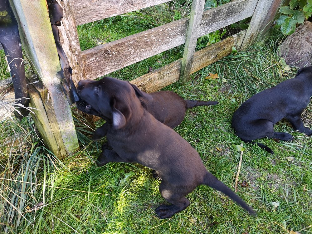 Hvalpene har i denne uge været lidt ude i haven, hvor de straks var på opdagelse sammen med deres mor, som også havde mælkebaren med. Der blev også lavet stort og småt lige som store hunde. De har også været i "hvalpebørnehave". I hvalperummet sker der også mere og mere, der bliver prøvet kræfter, så nogle gange kan man høre nogle hyl, men general er de rigtig søde. Når vi kommer ned til døren i rummet, begynder de at komme hen til lågen og sidder og kigger. De er også begyndt at bruge "hunde WCét" til det store. De får nu hundemad suppleret med Amy´s mælkebar