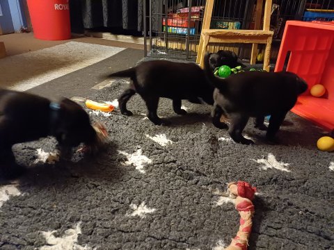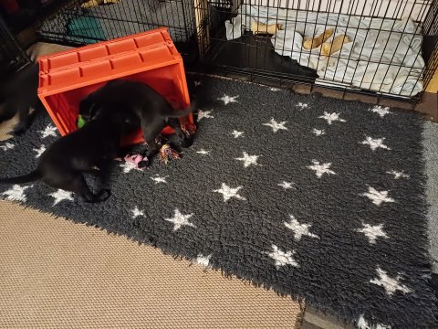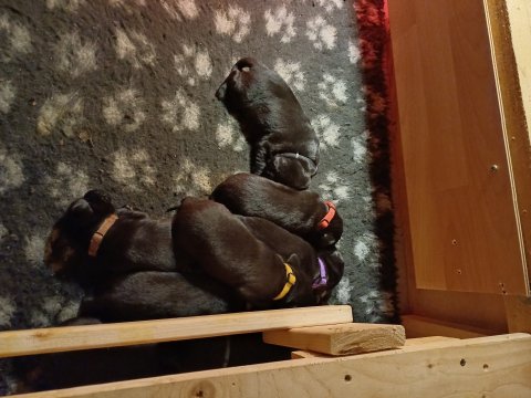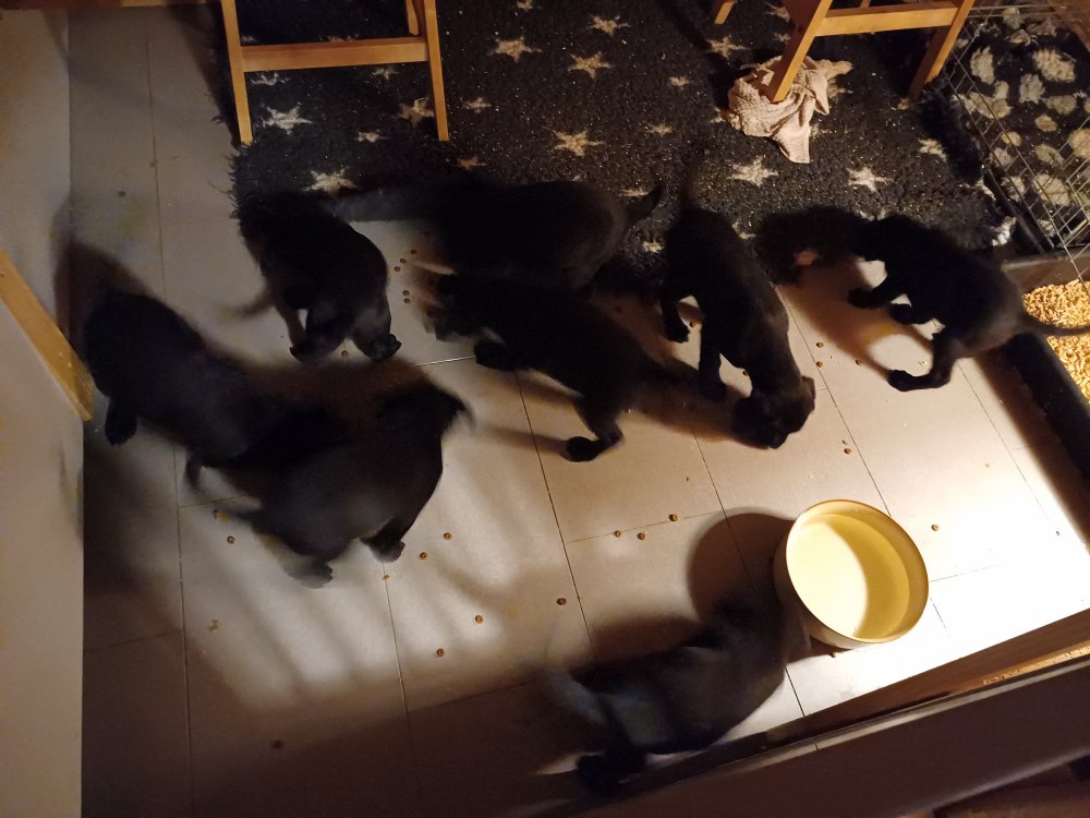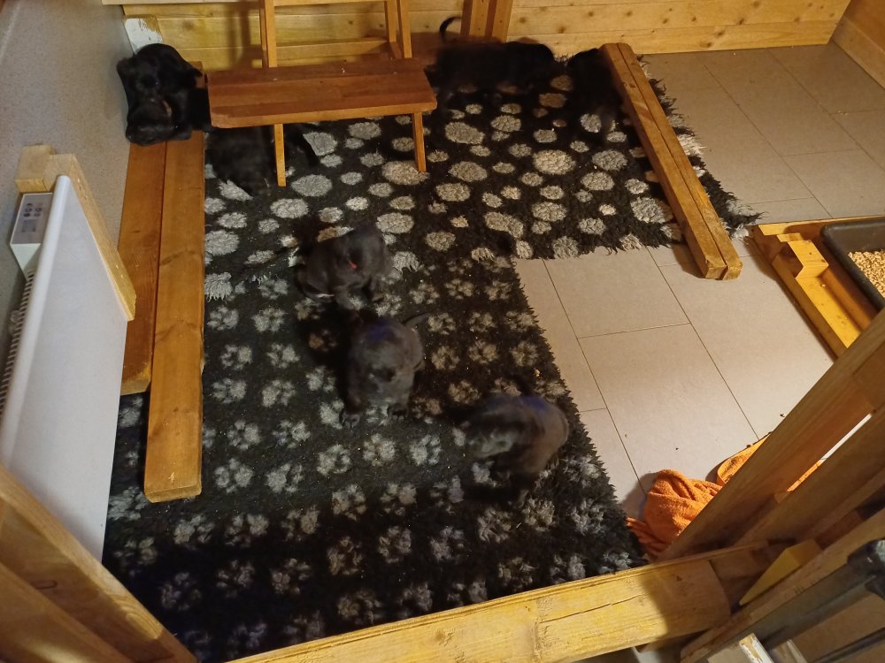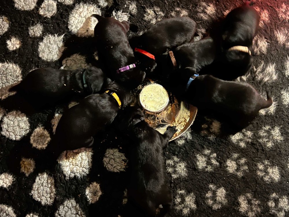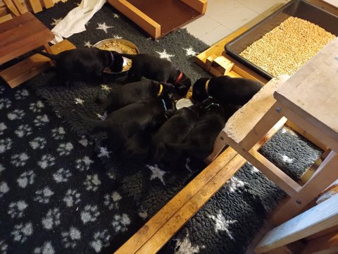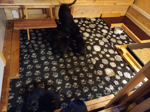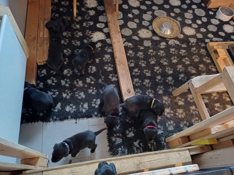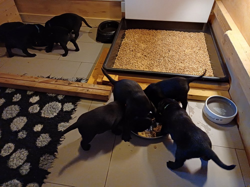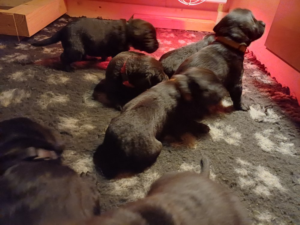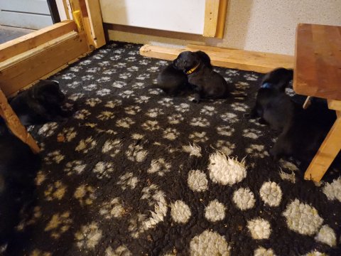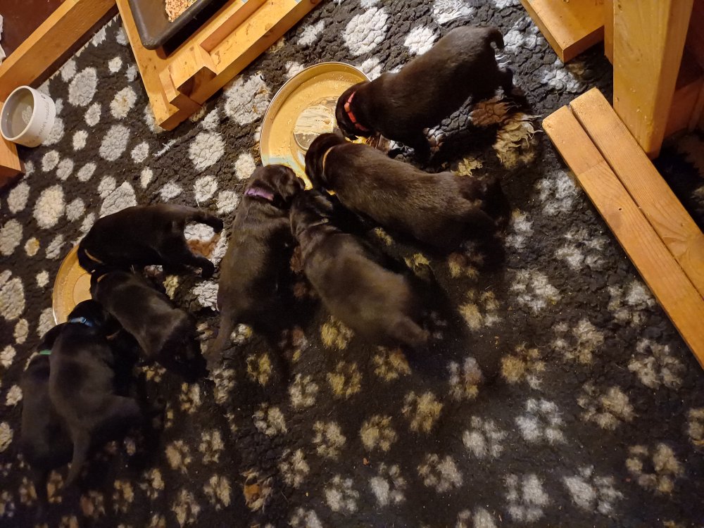 Der er kommet mere liv i hvalperummet, hvalpene har nu hel rummet og hvalpetoilette er kommet ind. De er ved at finde deres egen lyd, så vi kan ofte høre små bjæf. Når de er vågne, bliver der tumlet og prøvet kræfter med hinanden. Vi kan også se at de små hvalpetænder er ved at komme frem, så alt skal undersøges og når de er i hvalpe børnehaven går de på opdagelse, lige nu er det kun i kort tid, så komme de hen til os også lægger sig til at sove.De får nu fast føde opblødt i vand, og de er ved at lærer at de ikke må gå i maden. De elsker at få mælk hos deres Nata og når de har fået mælk, kan de godt ligge og hygge lege med Nata.
