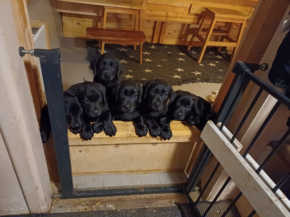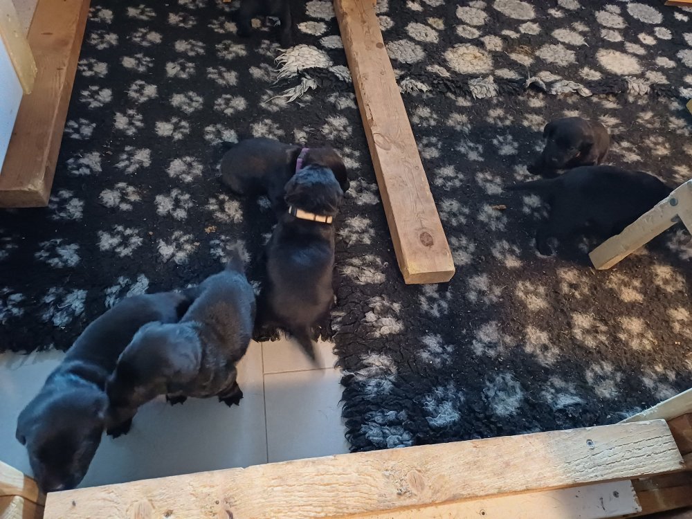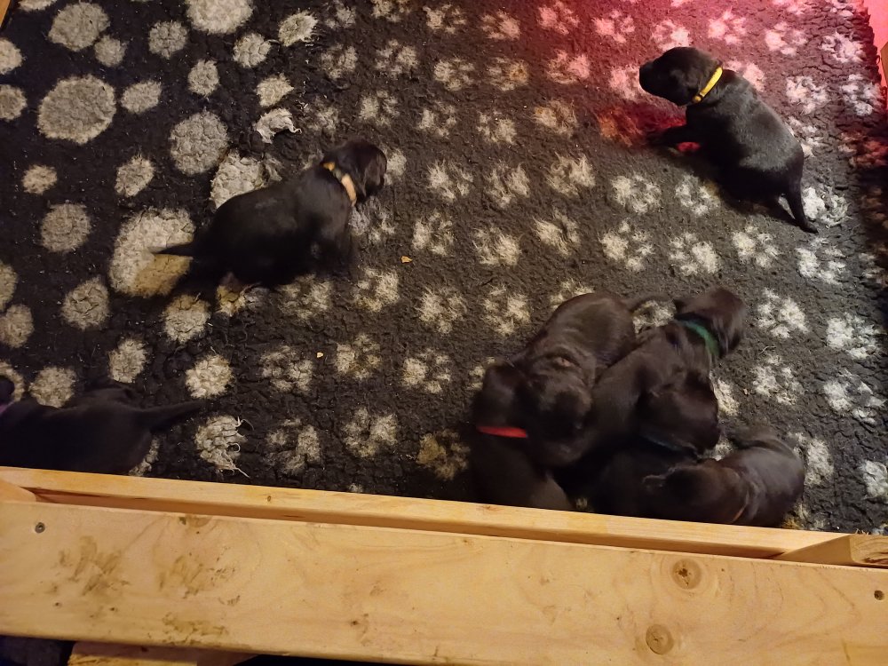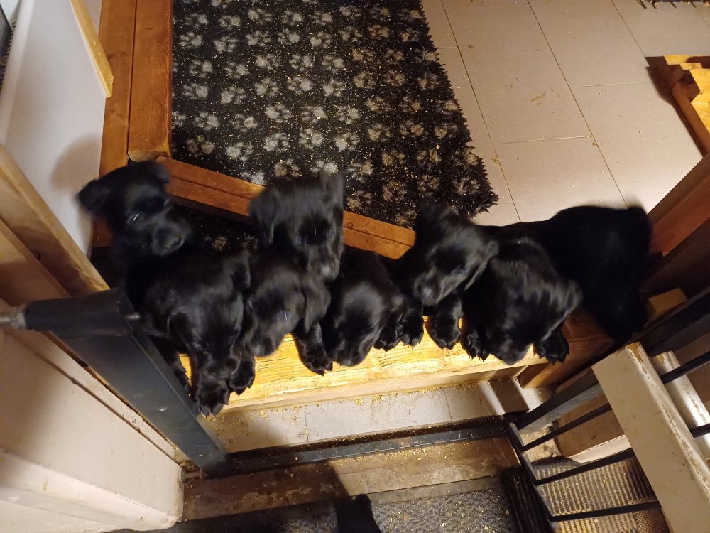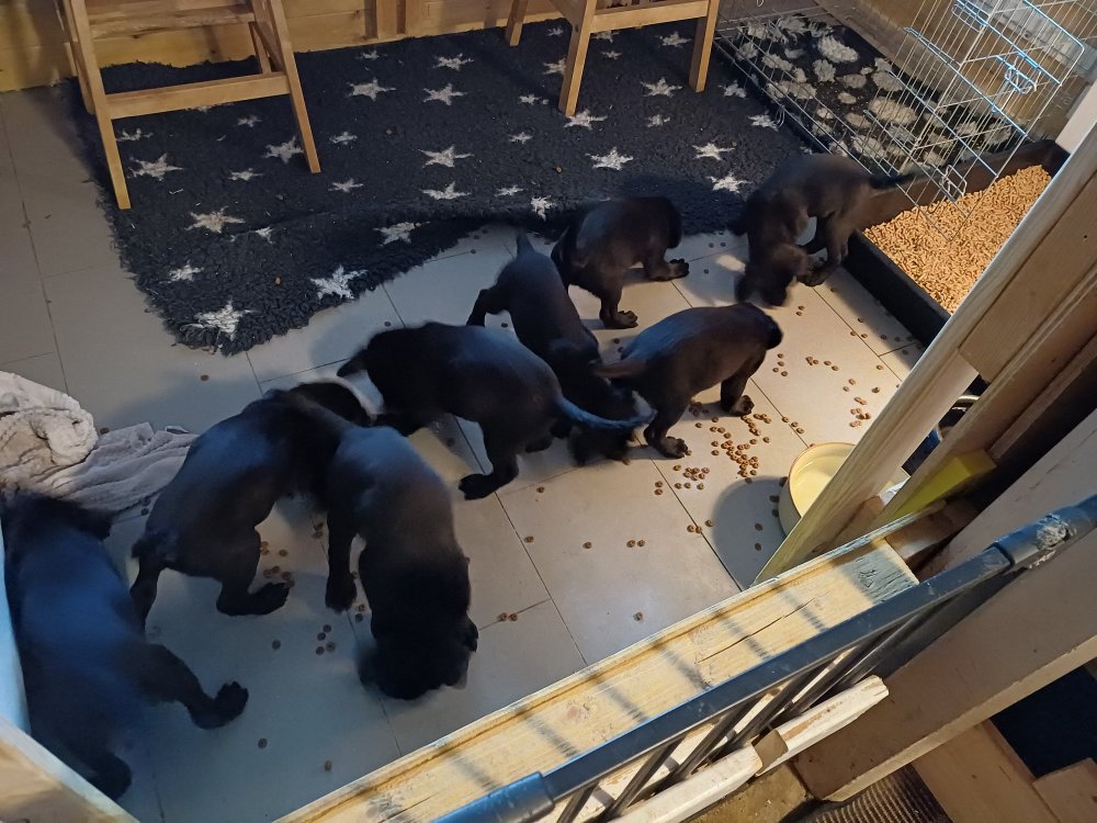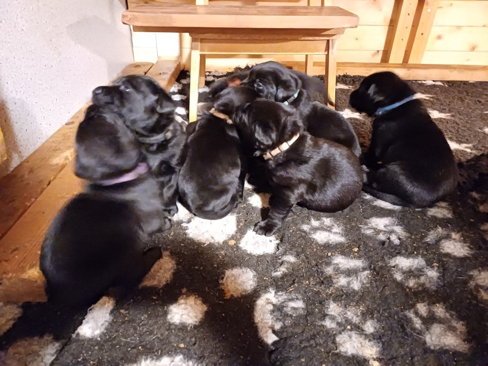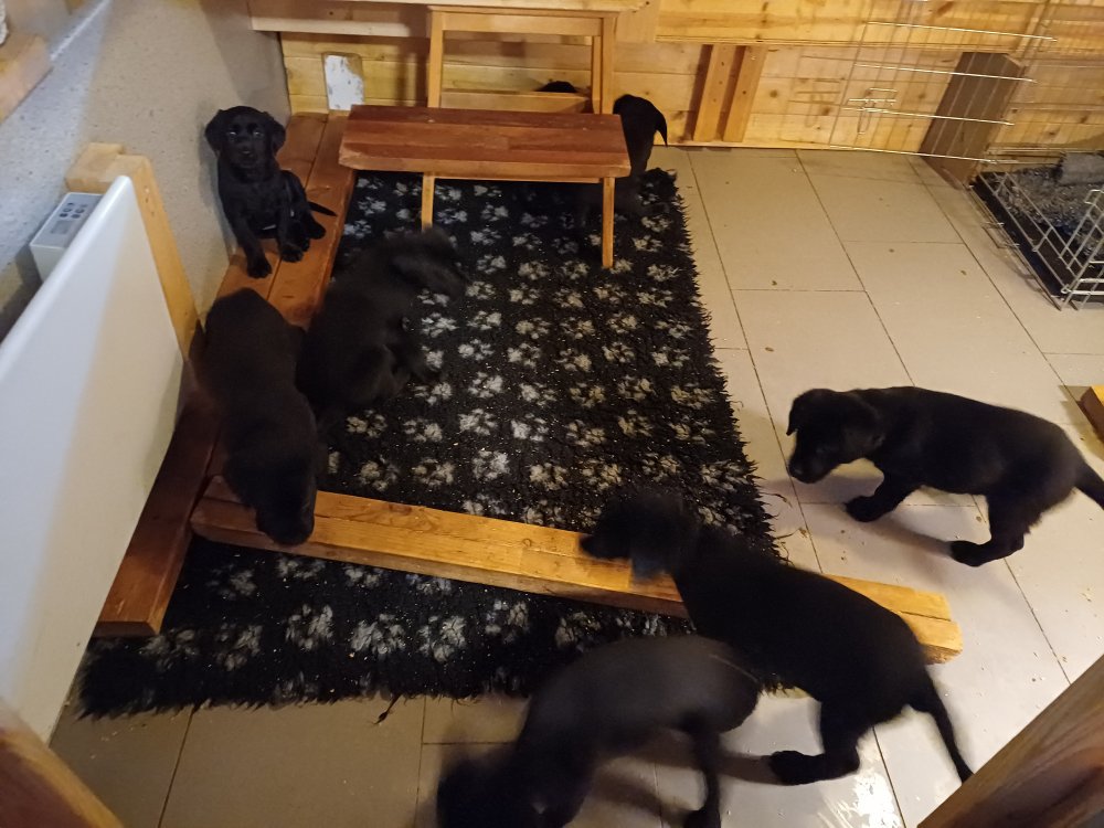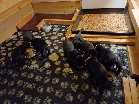 Det er den sidste uge i hvalpekassen. Flokken hygger sig i rummet, der bliver selvfølgelig også tumlet, leget m.m. De er også blevet mere frække og kender deres spisetider, næsten, for de holder øje med de store hunde og når de store får mad, giver hvalpene lyd fra sig også skal de også have mad. Hvalpene elsker at komme ud af rummet, også er der gang i dem. De løber rundt, tumler og leger med hinanden og hver for sig rigtige nysgerrig hvalpe der skal prøve nye grænser. De er ikke altid klar til at komme ind i deres rum igen. De er næsten altid klar vi lågen når vi kommer så de kan blive snakket med. De er alle klar og nysgerrig til at komme ud i verden ud på nye oplevelser i deres nye familier.