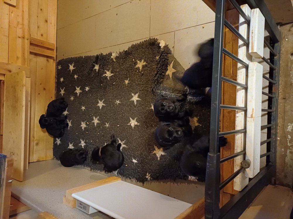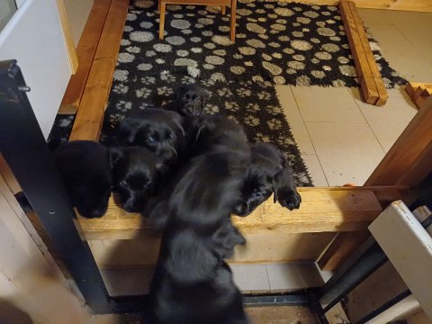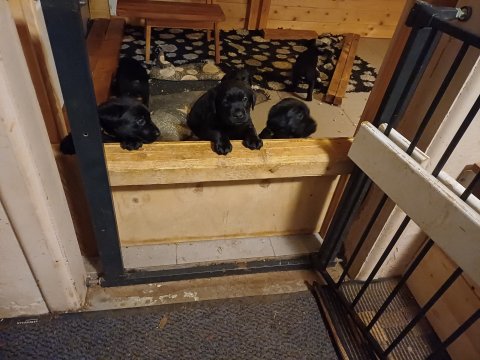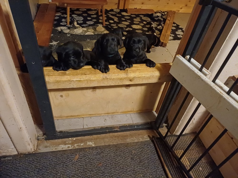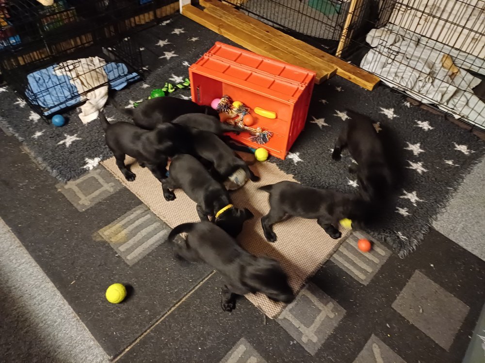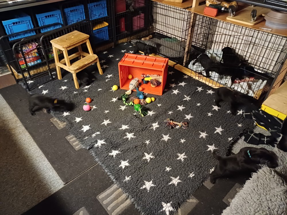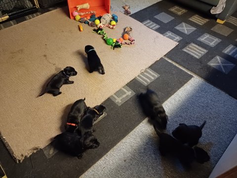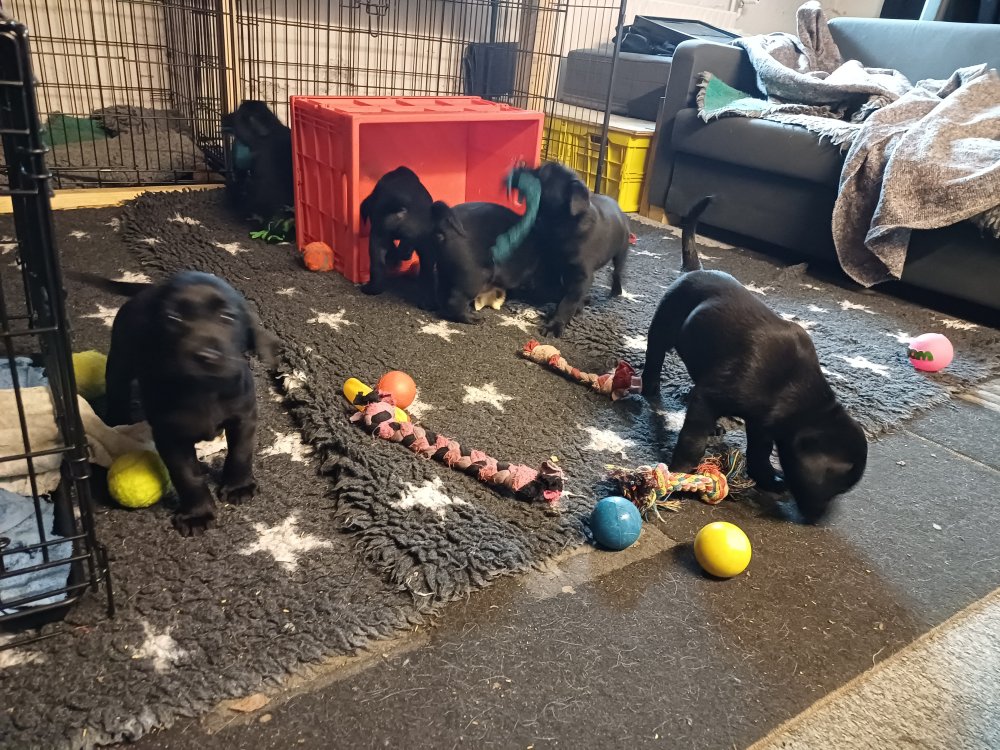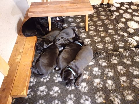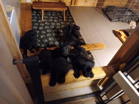 Det er den sidste uge i hvalpekassen. Flokken hygger sig i rummet, der bliver selvfølgelig også tumlet, leget m.m. De er også blevet mere frække og kender deres spisetider, næsten, for de holder øje med de store hunde og når de store får mad, giver hvalpene lyd fra sig også skal de også have mad. Hvalpene elsker at komme ud af rummet, også er der gang i dem. De løber rundt, tumler og leger med hinanden og hver for sig rigtige nysgerrig hvalpe der skal prøve nye grænser. De er ikke altid klar til at komme ind i deres rum igen. De er næsten altid klar vi lågen når vi kommer så de kan blive snakket med. De er alle klar og nysgerrig til at komme ud i verden ud på nye oplevelser i deres nye familier.