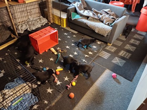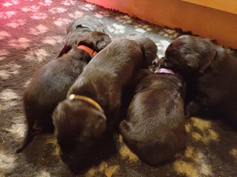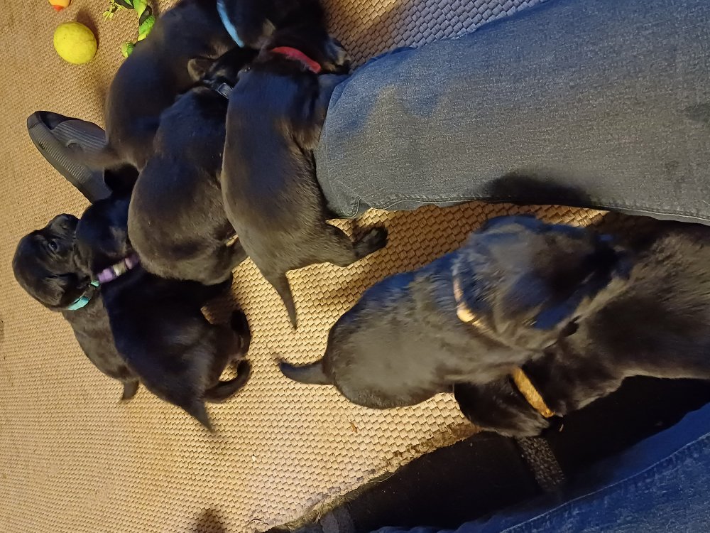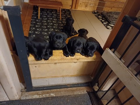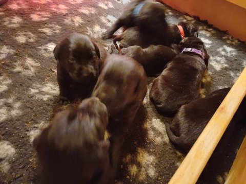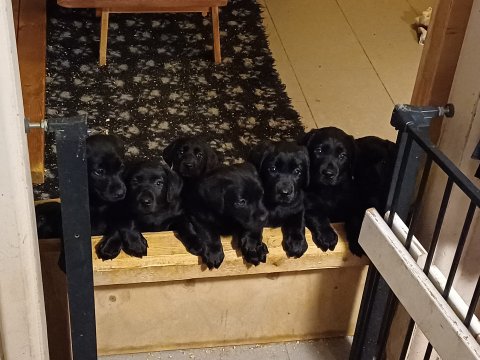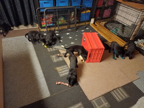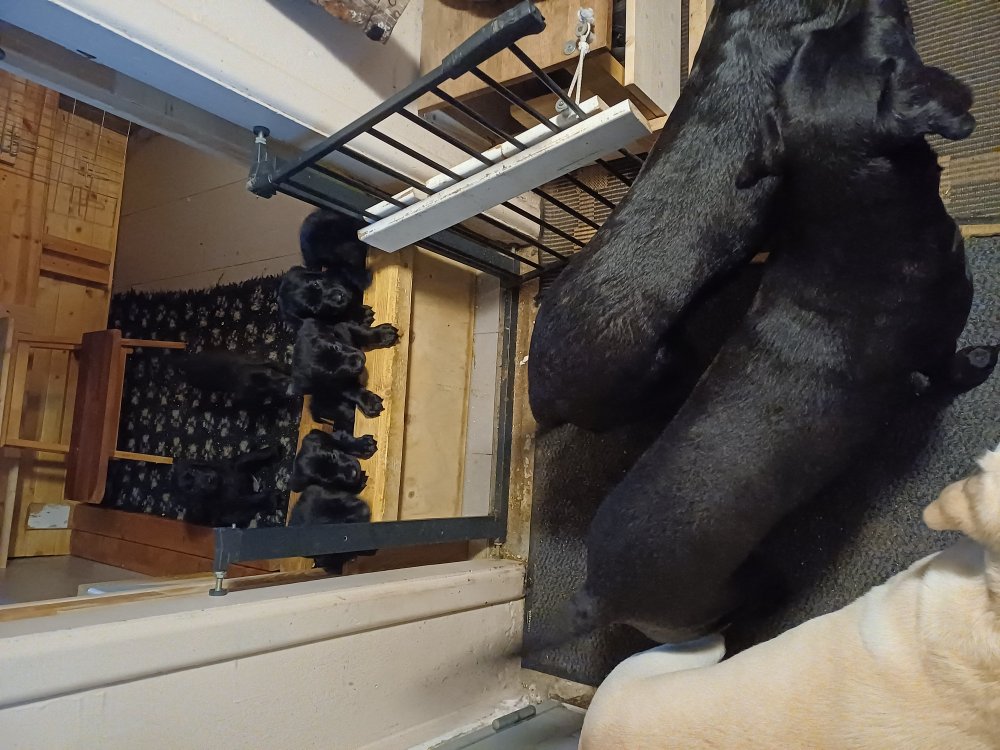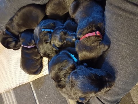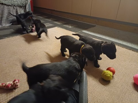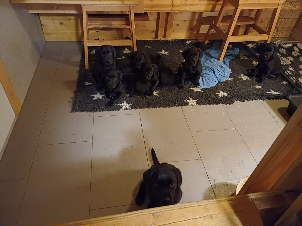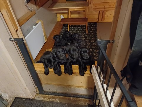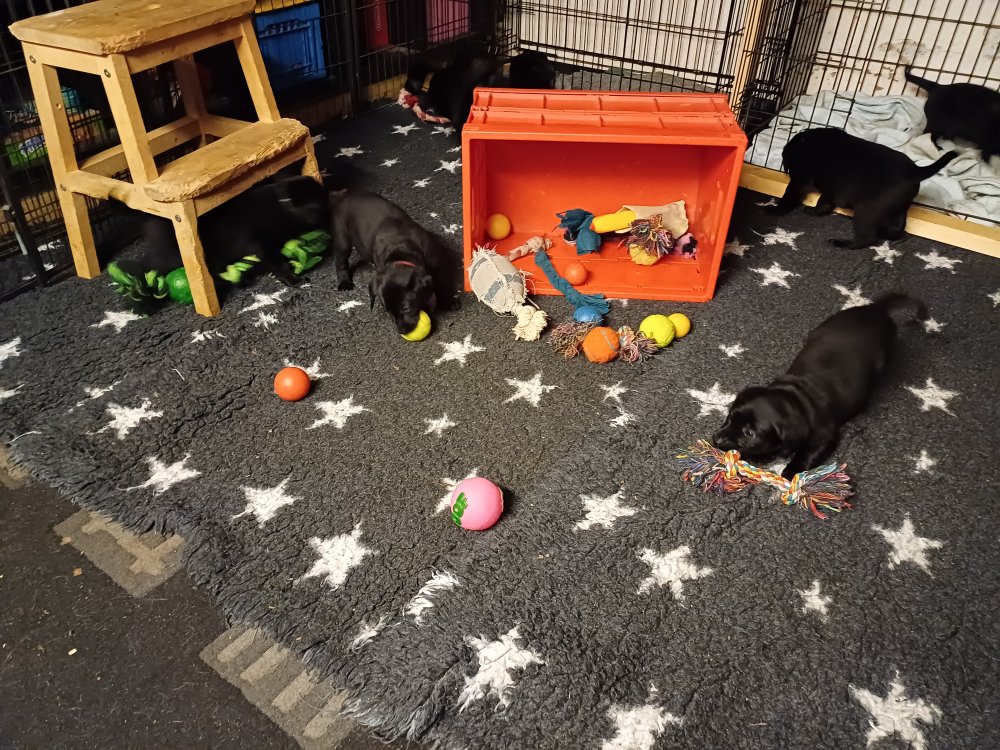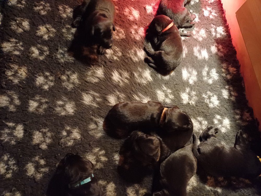 Det er den sidste uge i hvalpekassen. Flokken hygger sig i rummet, der bliver selvfølgelig også tumlet, leget m.m. De er også blevet mere frække og kender deres spisetider, næsten, for de holder øje med de store hunde og når de store får mad, giver hvalpene lyd fra sig også skal de også have mad. Hvalpene elsker at komme ud af rummet, også er der gang i dem. De løber rundt, tumler og leger med hinanden og hver for sig rigtige nysgerrig hvalpe der skal prøve nye grænser. De er ikke altid klar til at komme ind i deres rum igen. De er næsten altid klar vi lågen når vi kommer så de kan blive snakket med. De er alle klar og nysgerrig til at komme ud i verden ud på nye oplevelser i deres nye familier.