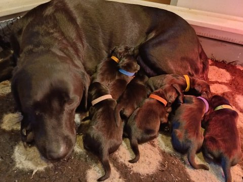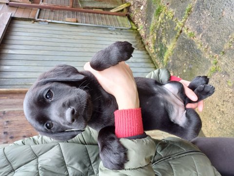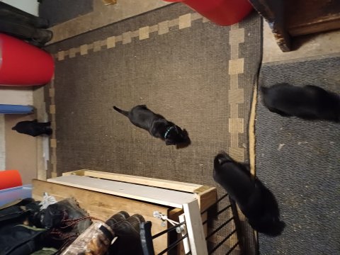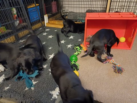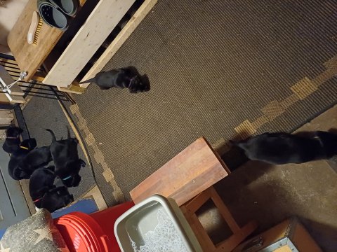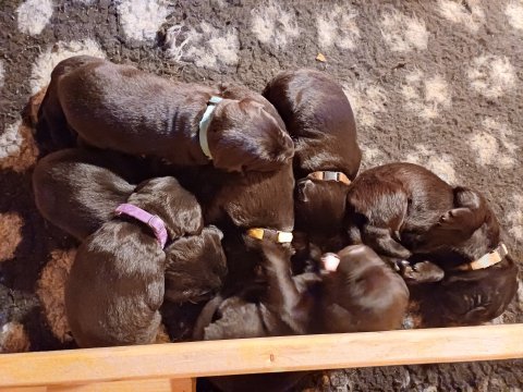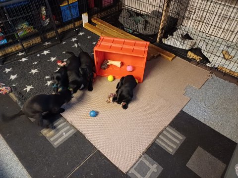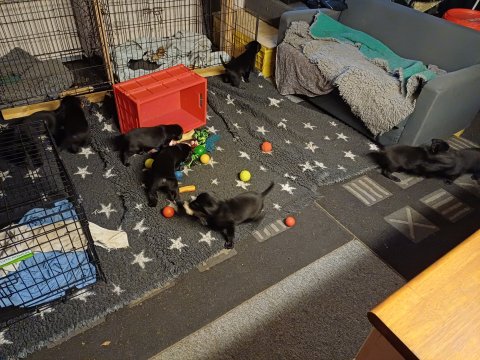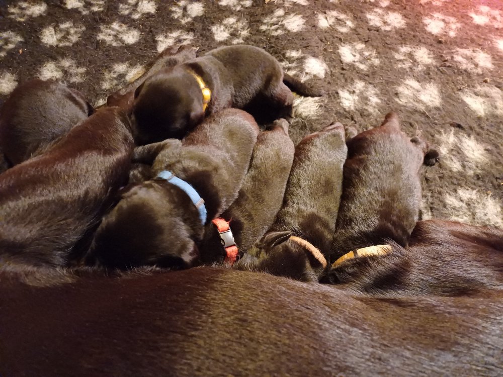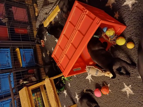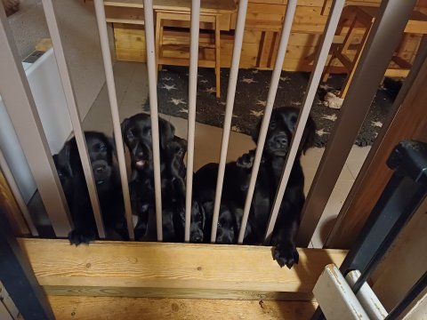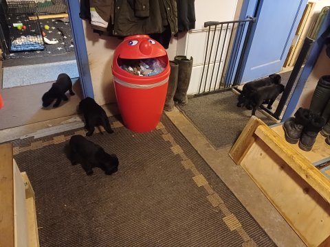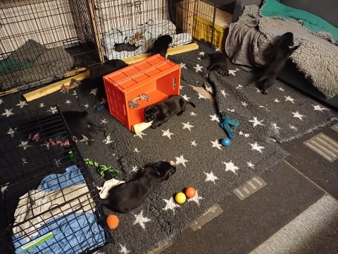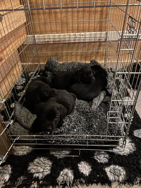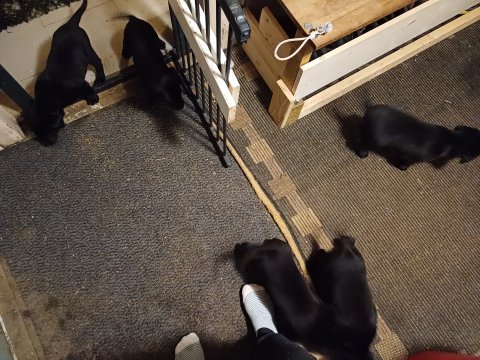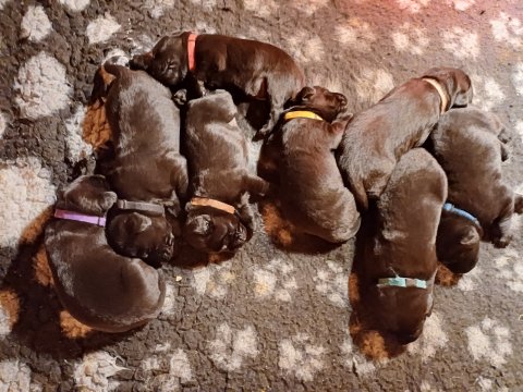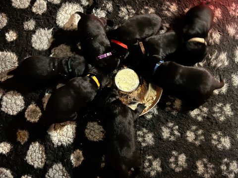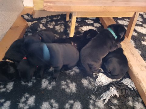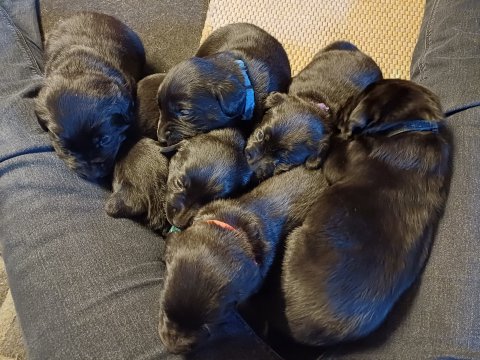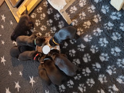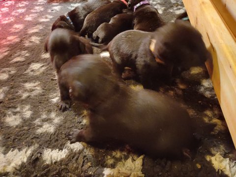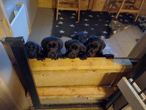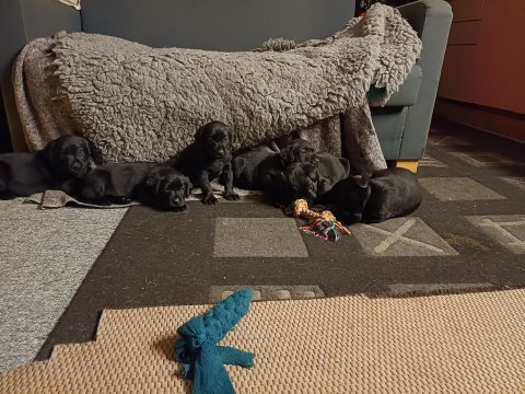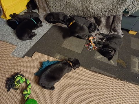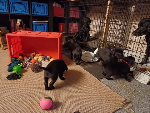 Det er den sidste uge i hvalpekassen. Flokken hygger sig i rummet, der bliver selvfølgelig også tumlet, leget m.m. De er også blevet mere frække og kender deres spisetider, næsten, for de holder øje med de store hunde og når de store får mad, giver hvalpene lyd fra sig også skal de også have mad. Hvalpene elsker at komme ud af rummet, også er der gang i dem. De løber rundt, tumler og leger med hinanden og hver for sig rigtige nysgerrig hvalpe der skal prøve nye grænser. De er ikke altid klar til at komme ind i deres rum igen. De er næsten altid klar vi lågen når vi kommer så de kan blive snakket med. De er alle klar og nysgerrig til at komme ud i verden ud på nye oplevelser i deres nye familier.
