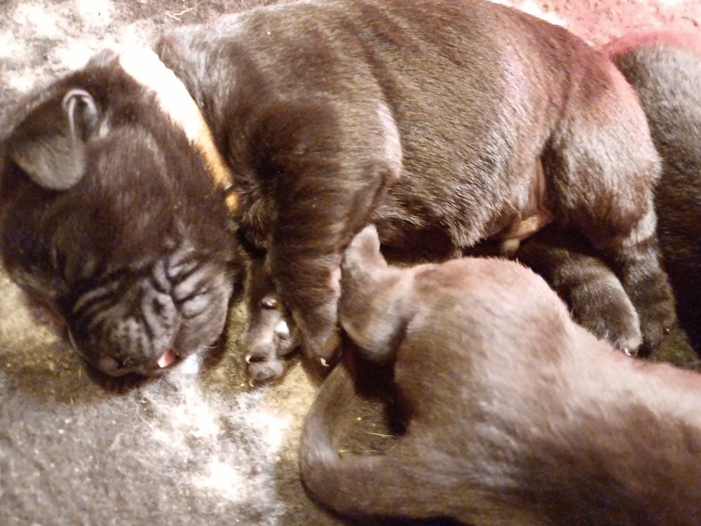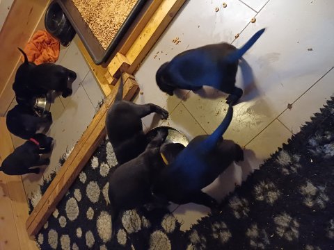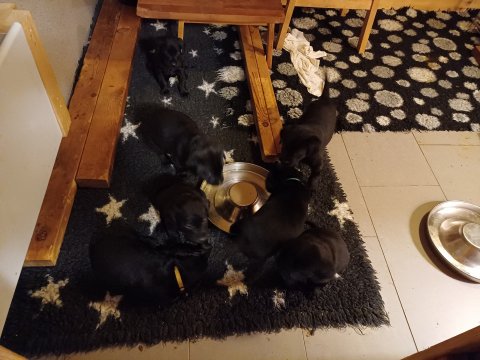 I denne uge er der sket meget med hvalpene. De har alle fået øjne og begyndt at bevæge sig rundt i kassen næsten som rigtig små hunde. De har også opdaget de andre hvalpe i kasse, så de er begyndt at "slås" med hinanden. De prøver også deres lyde og især når de gerne vil have mad fra Nata. Her sidst på ugen er de begyndt at få opblødt hvalpefoder, som de alle spiser, på hver deres forskellige måder ofte midt i maden, så de er ikke så pæne efter der har spist. Nata er god til at komme og gøre dem fine igen også får de også lidt fra Nata´s mælkebar