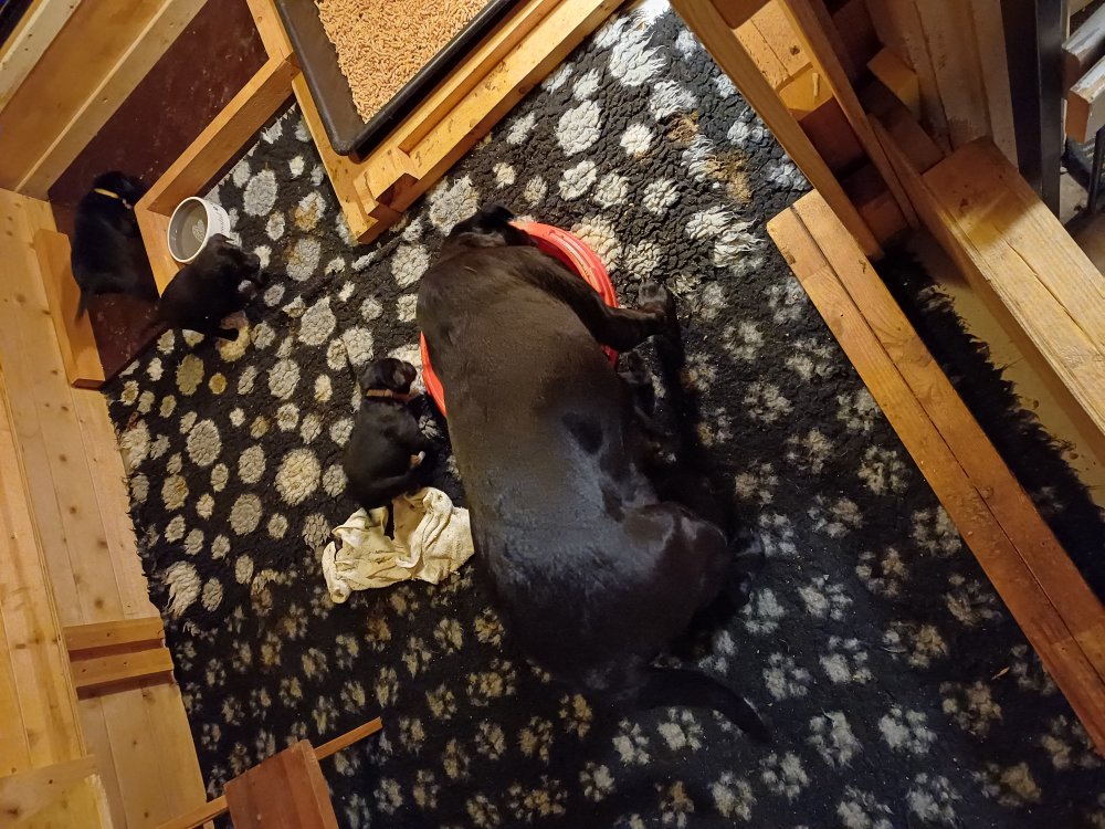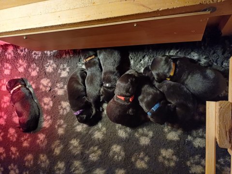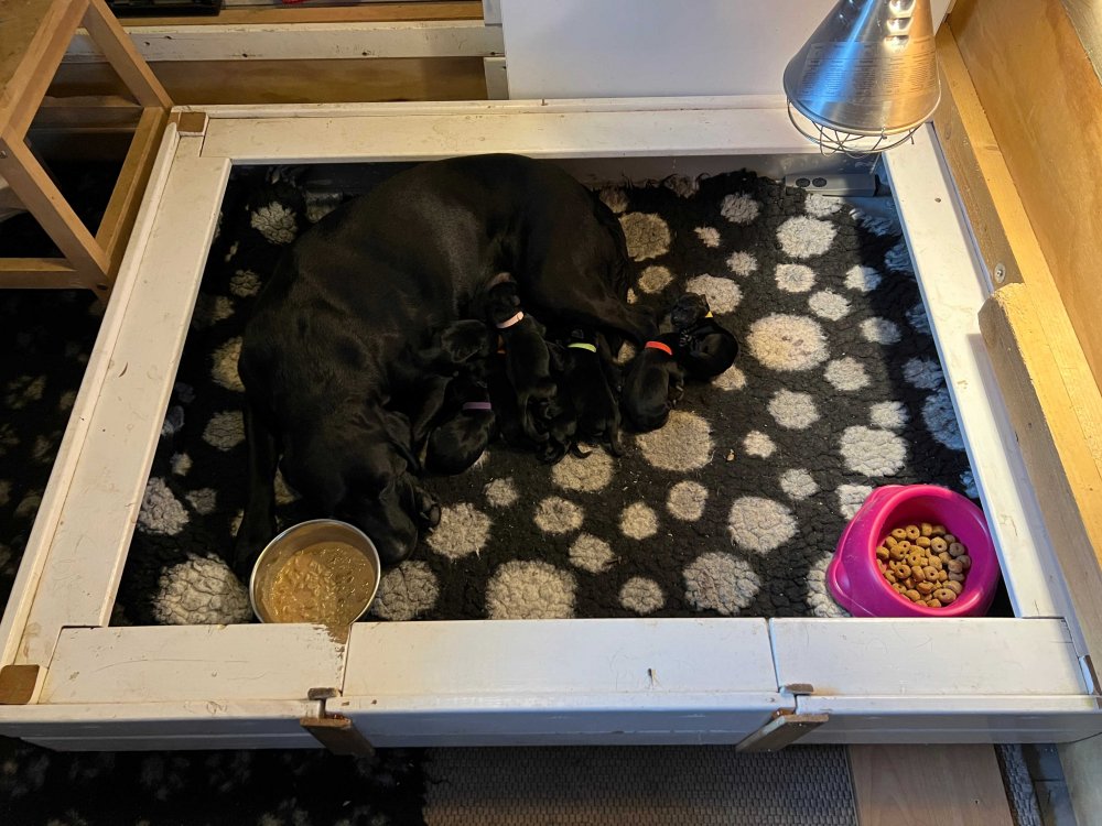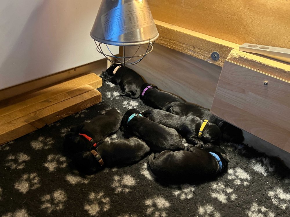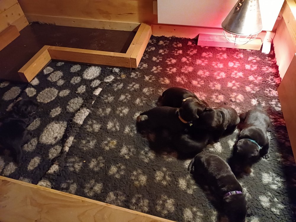 De er flyttet ud i en lidt større hvalpekasse, det giver mere plads til hvalpene og Nata. Hvalpene er begyndt at bevæge sig lidt mere i en blanding mellem at krybe og forsøge på at bruge benene til at gå. Det er sjovt at se dem prøve at komme rundt i hvalpekassen. Stadig væk går tiden med at spise og sove. Når hvalpene sover, kommer Nata op i stuen for at være lidt sammen med resten af familien hvilket hun nyder, men hun vil også rigtig gerne være sammen med hendes hvalpe. Vi er begyndt at kunne ane de små sprækker ved øjnene på hvalpene, se det bliver så spændende at se når de små øjne kommer frem.