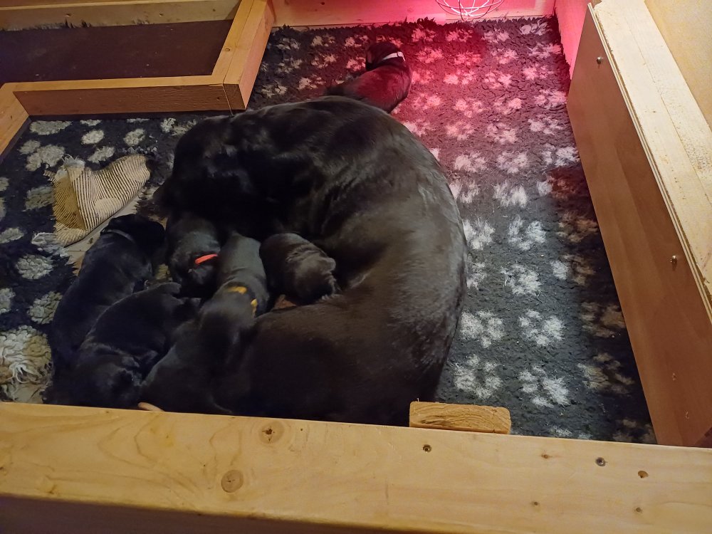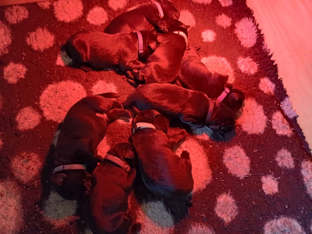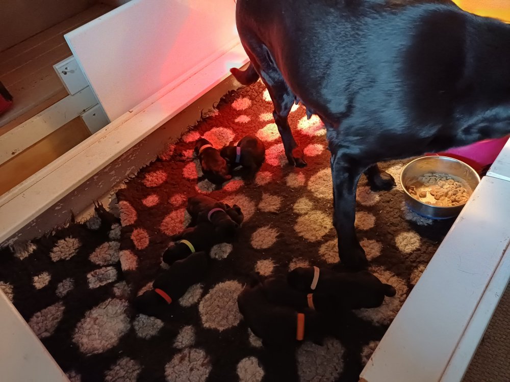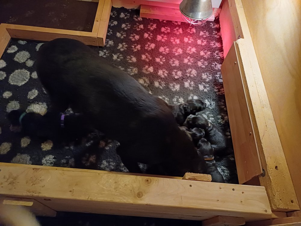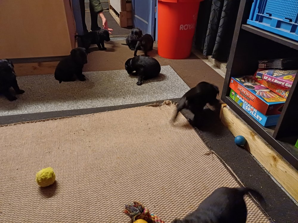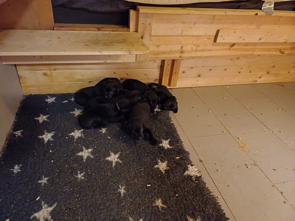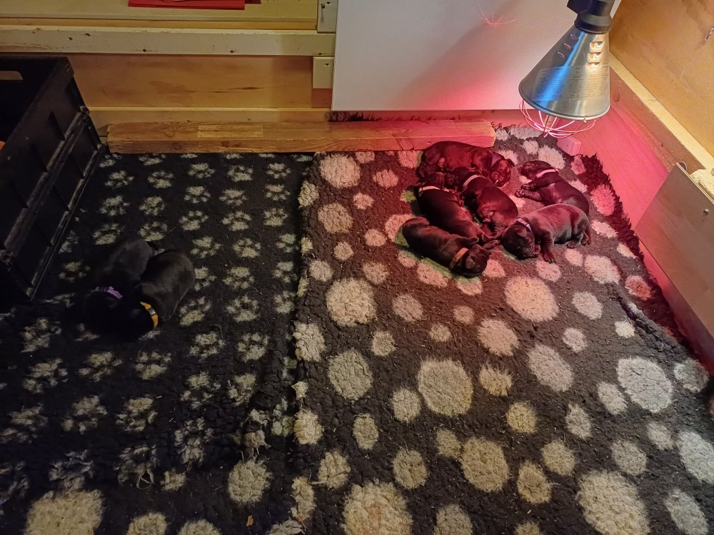 Lidt billeder fra den første uge i hvalpekassen. Flokken fundet deres egen rytme i hvalpekassen, hvor der kommer en helt masse knirkelyde og der spist og sovet. Nata er en rigtig god mor der pudser og nusser omkring hendes hvalpe, hun er god til selv at få slappet af. Nata har også overskud til at komme op i stuen og være lidt sammen med resten af familien.De andre hunde har også været inde og hilse på hvalpene.
