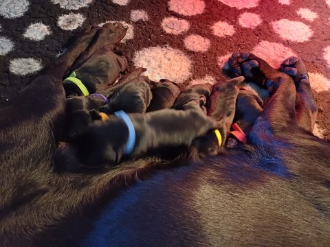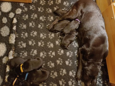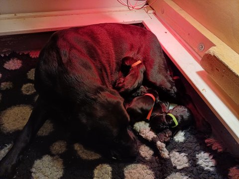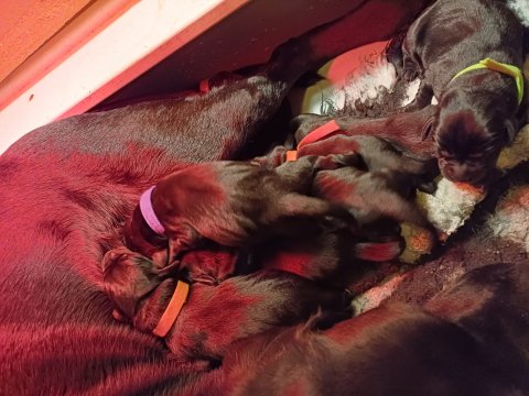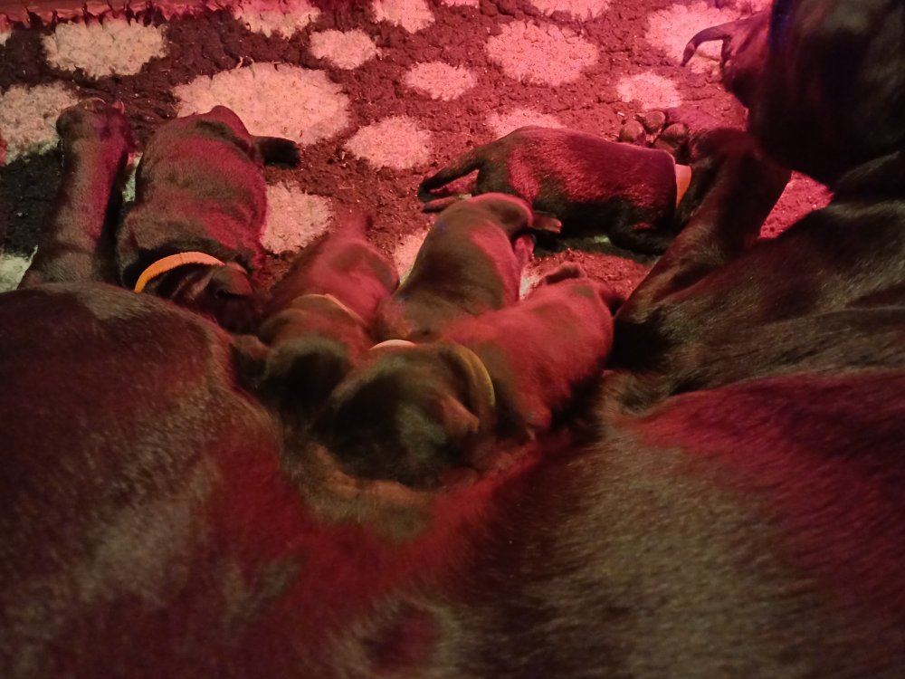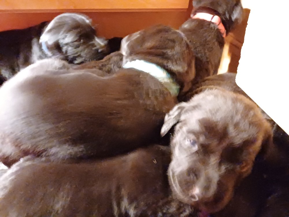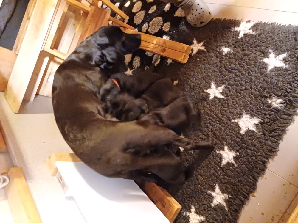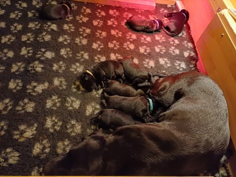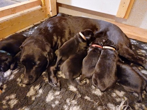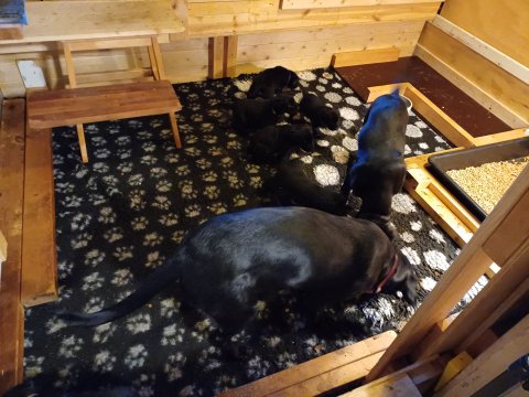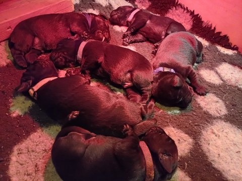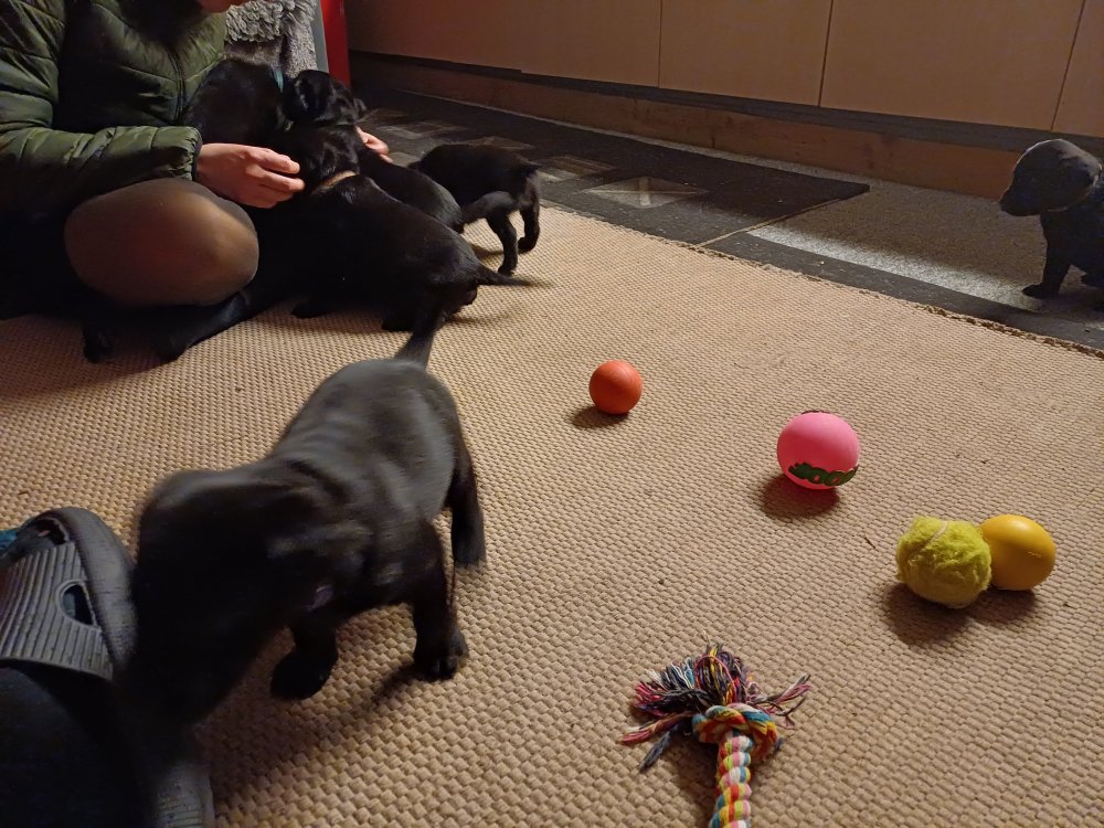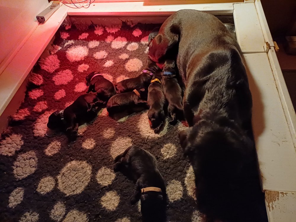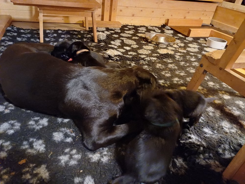 Lidt billeder fra den første uge i hvalpekassen. Flokken fundet deres egen rytme i hvalpekassen, hvor der kommer en helt masse knirkelyde og der spist og sovet. Nata er en rigtig god mor der pudser og nusser omkring hendes hvalpe, hun er god til selv at få slappet af. Nata har også overskud til at komme op i stuen og være lidt sammen med resten af familien.De andre hunde har også været inde og hilse på hvalpene.